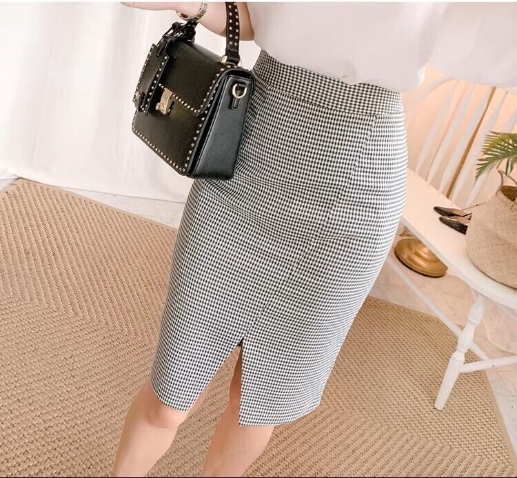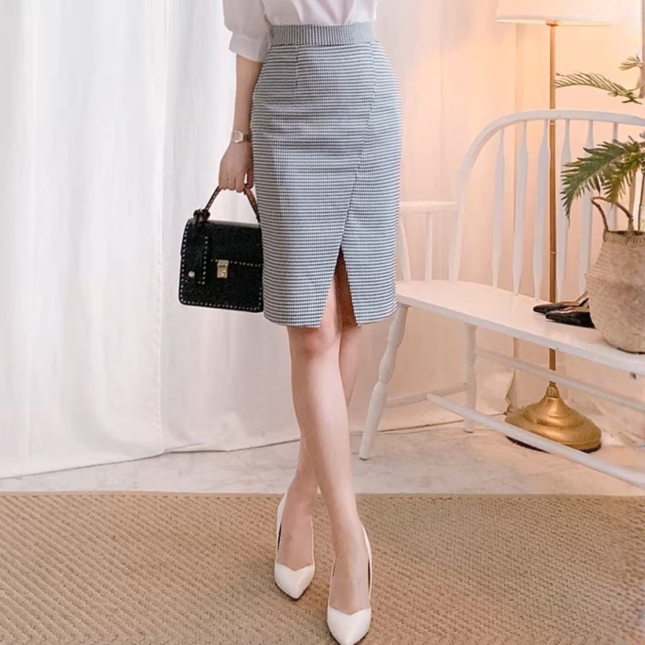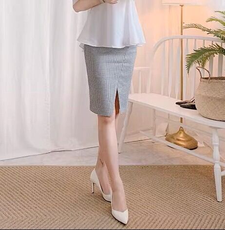着用するだけでフェミニンな雰囲気が漂うハイウエストエレガントフロントスリットチェックミドルスカート。