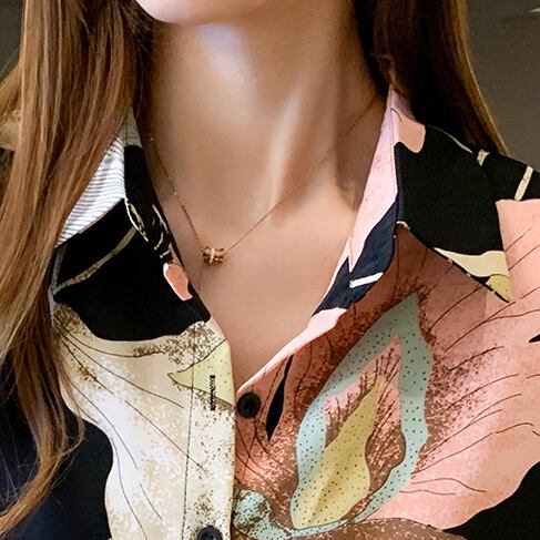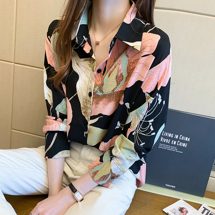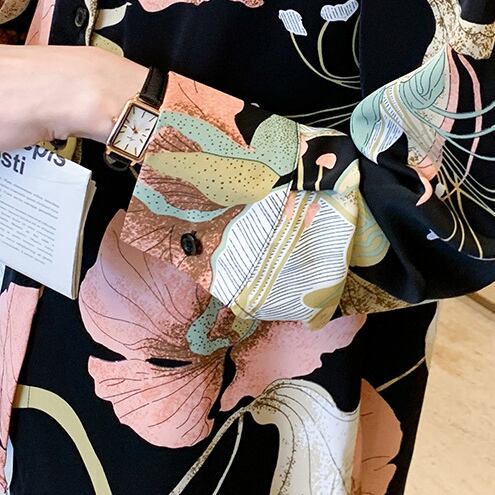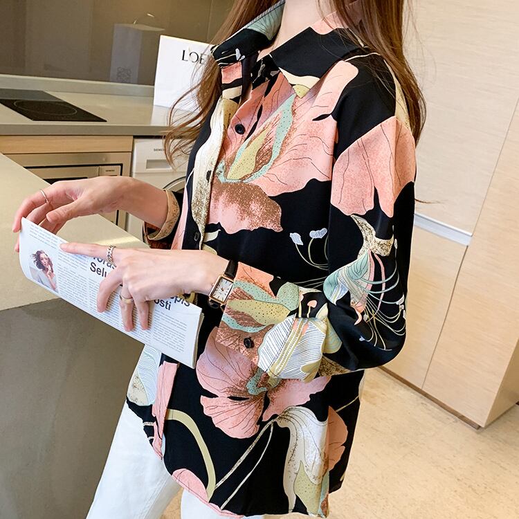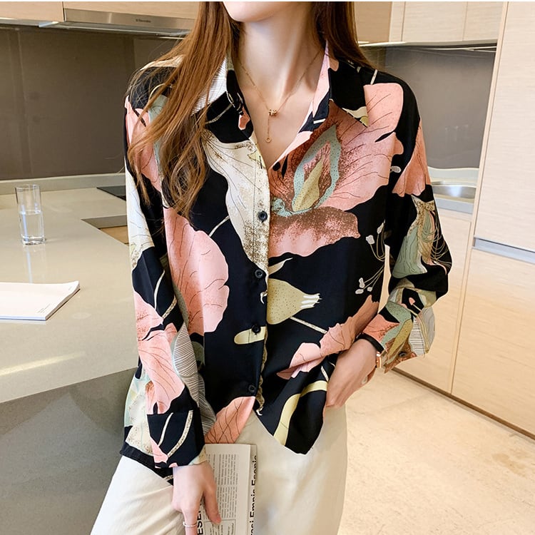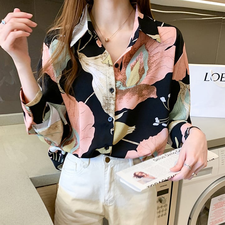 華やかなフローラルデザインが特徴のポロカラーエレガントシフォンブラウス。