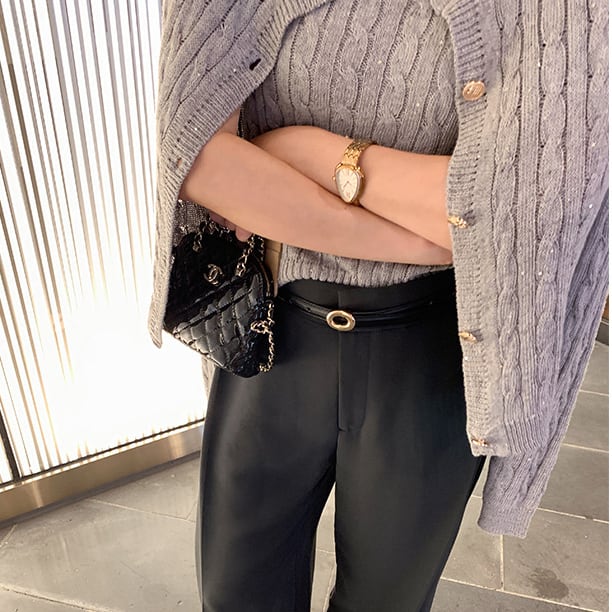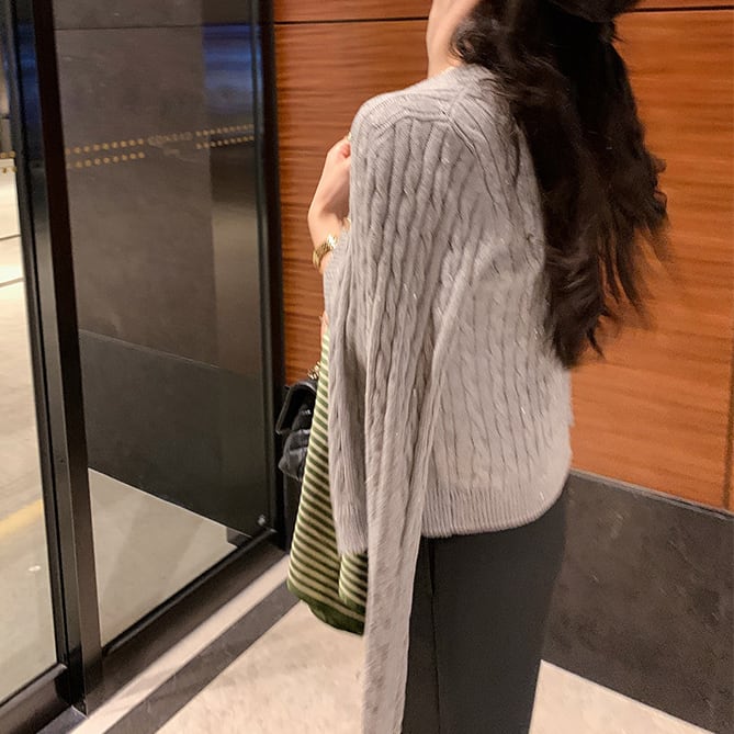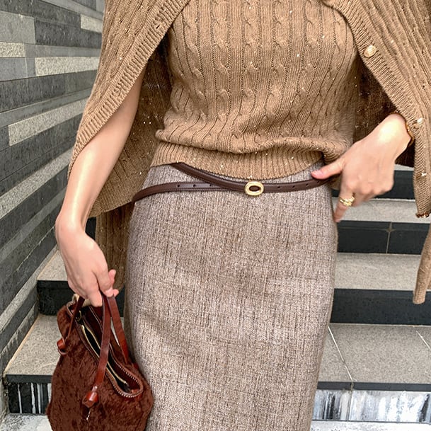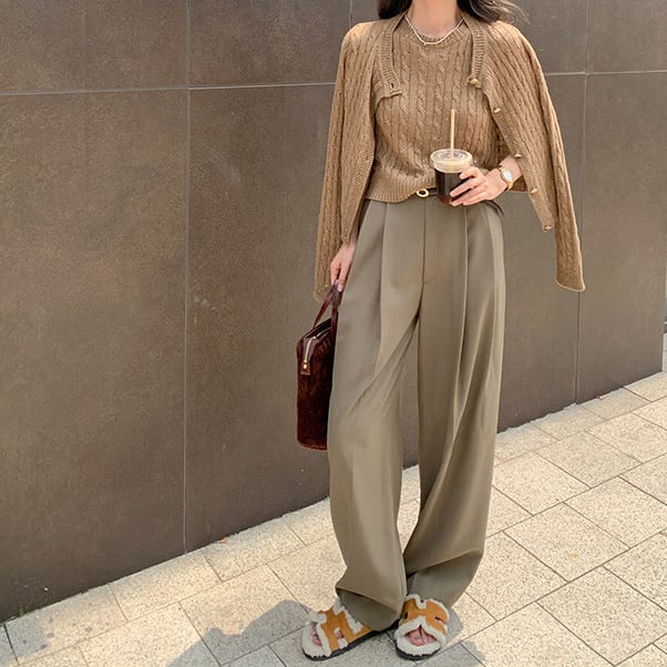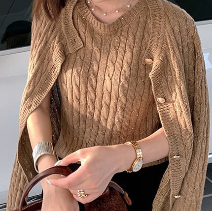 着用するだけでフェミニンな雰囲気が漂うエレガントケーブルニットスタイリッシュアンサンブル。