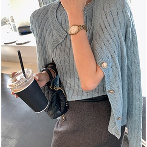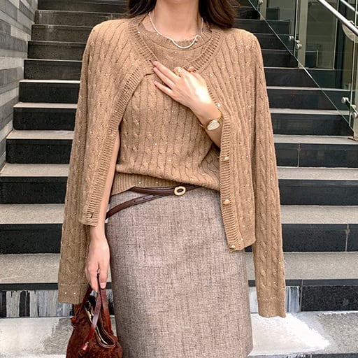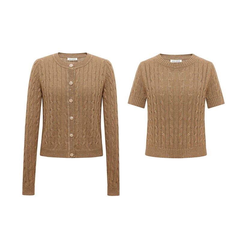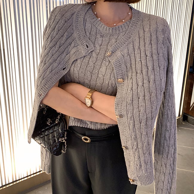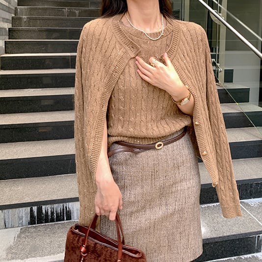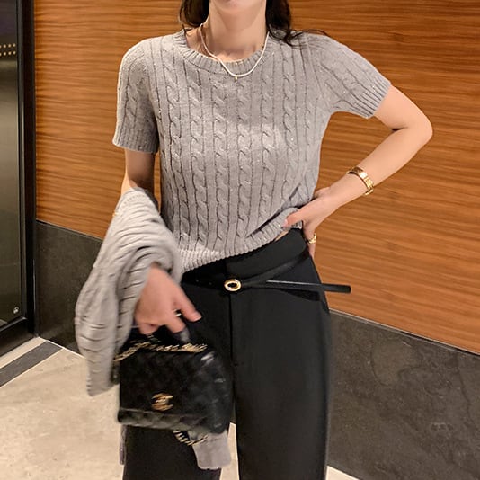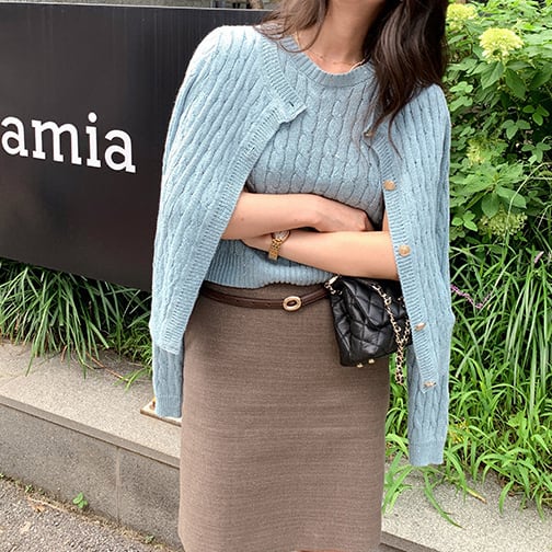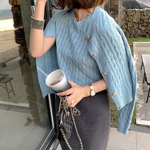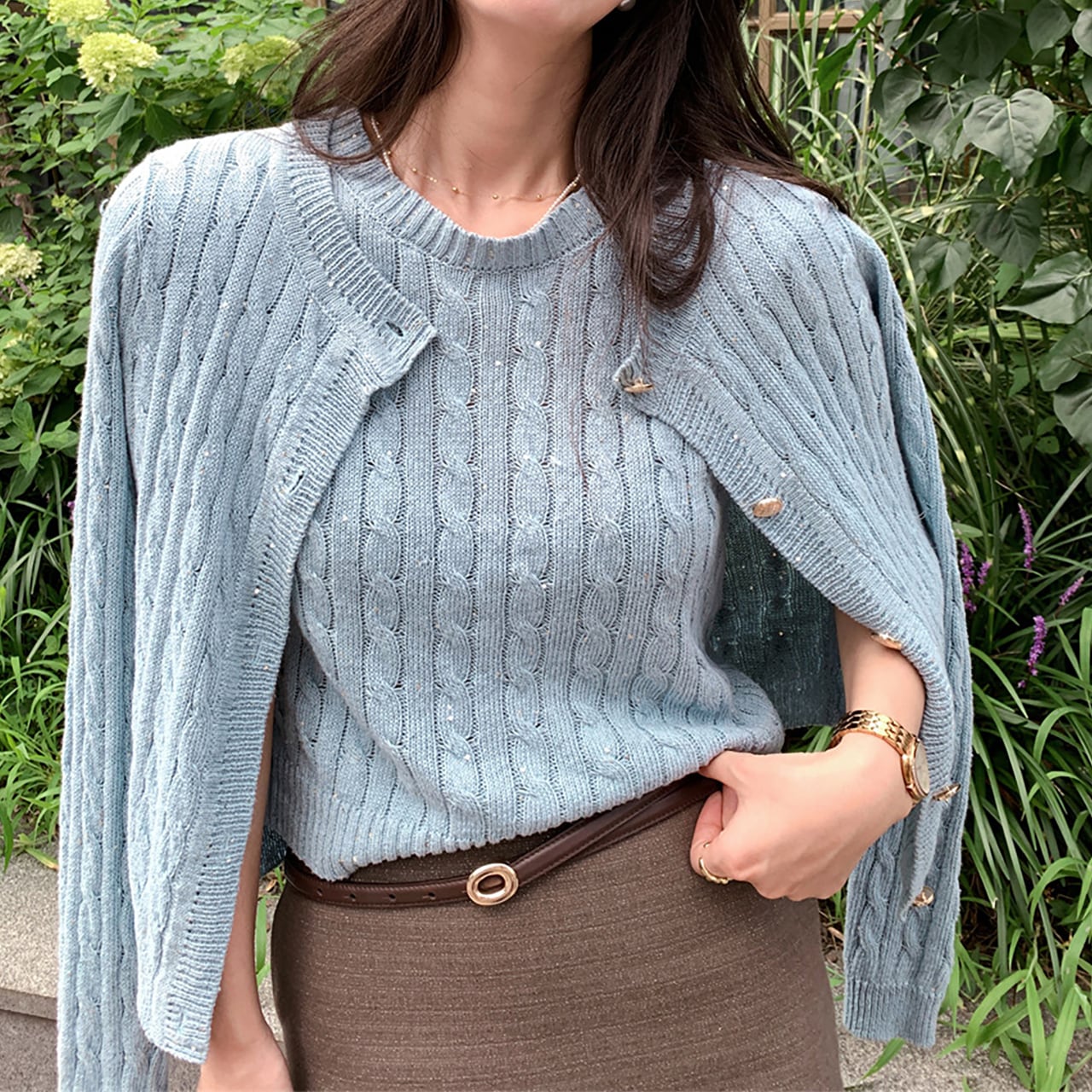 スタイリッシュケーブルニットカーディガンとショートスリーブスリムケーブルニットのセット商品です。