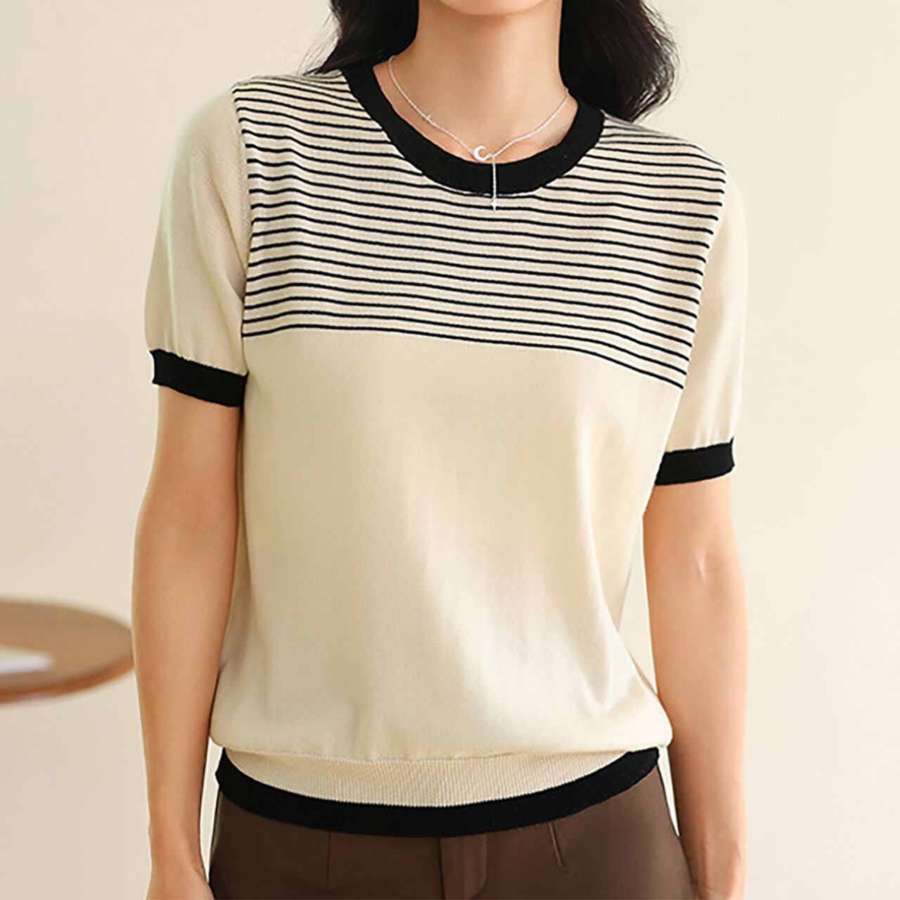 Round neck elegant chest border slim knit ( 2color )