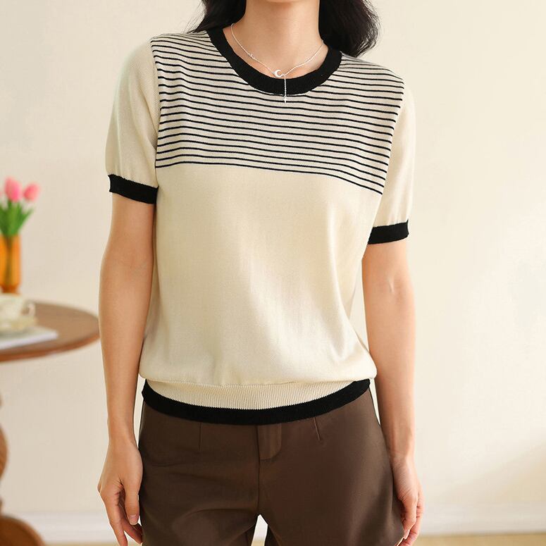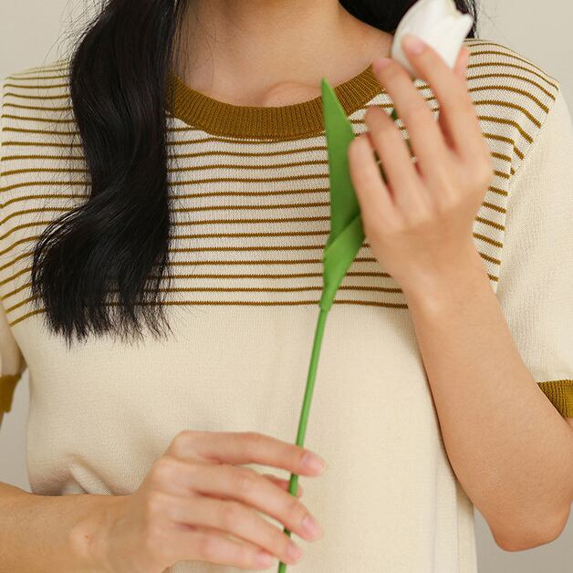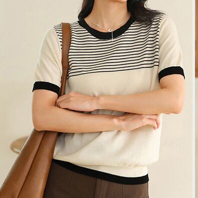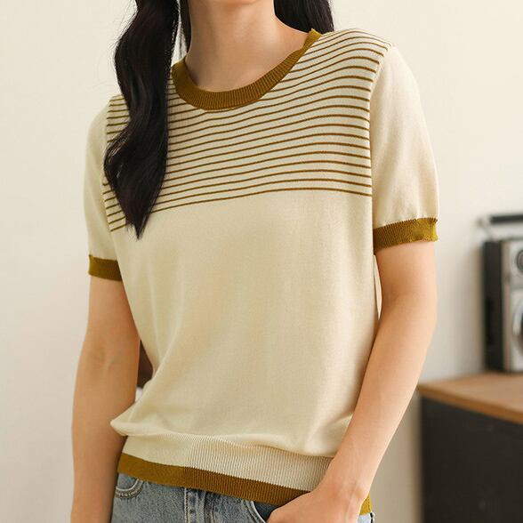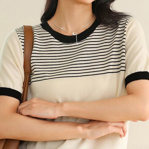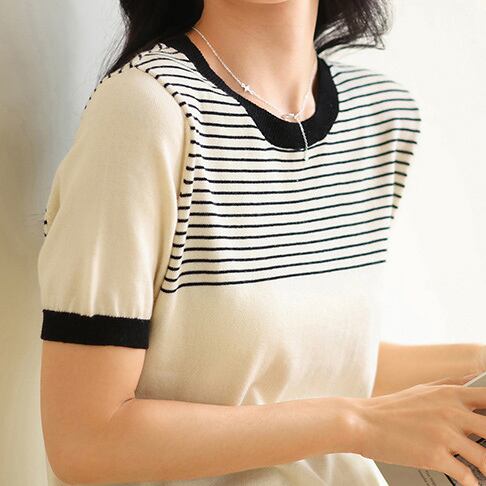 Round neck elegant chest border slim knit (2color)