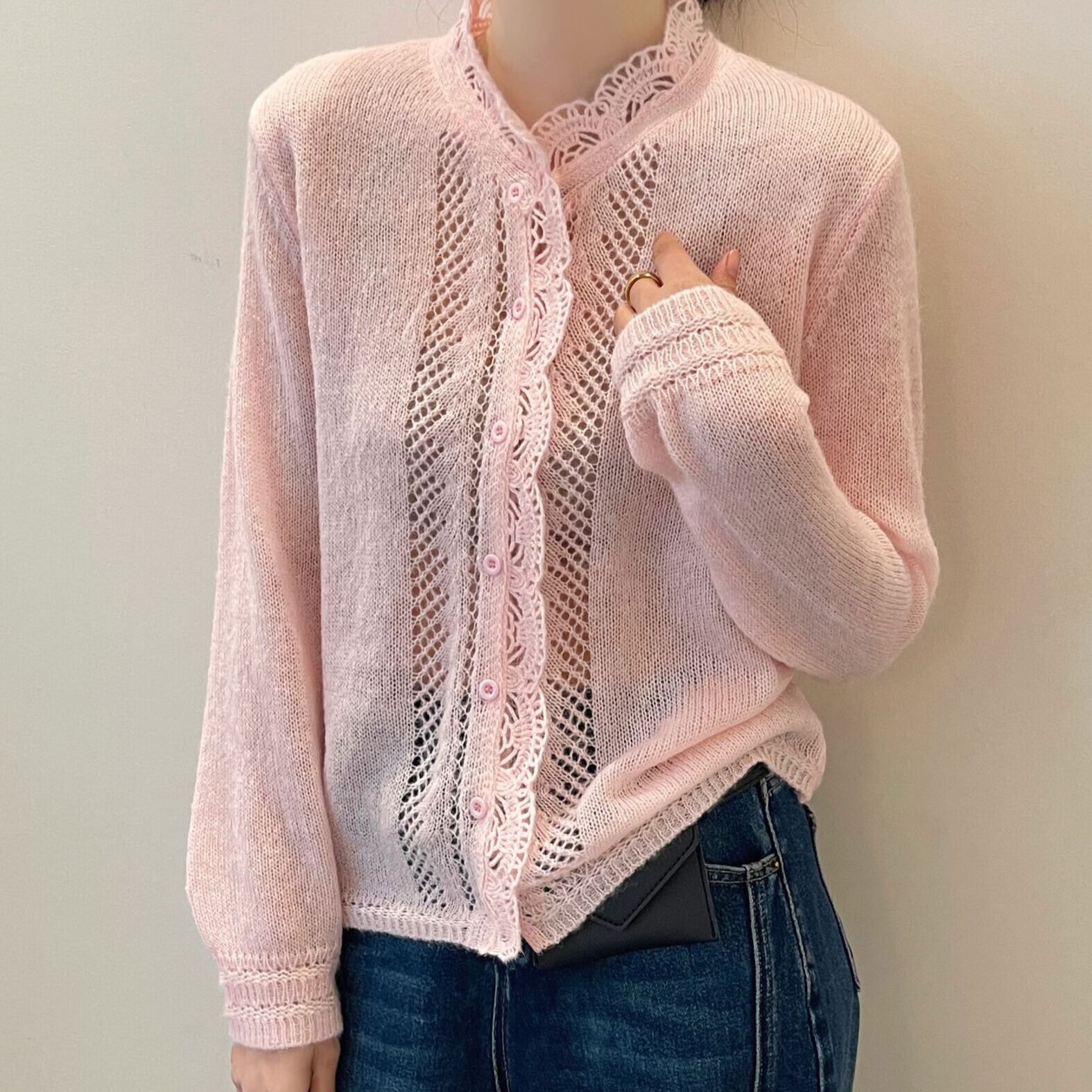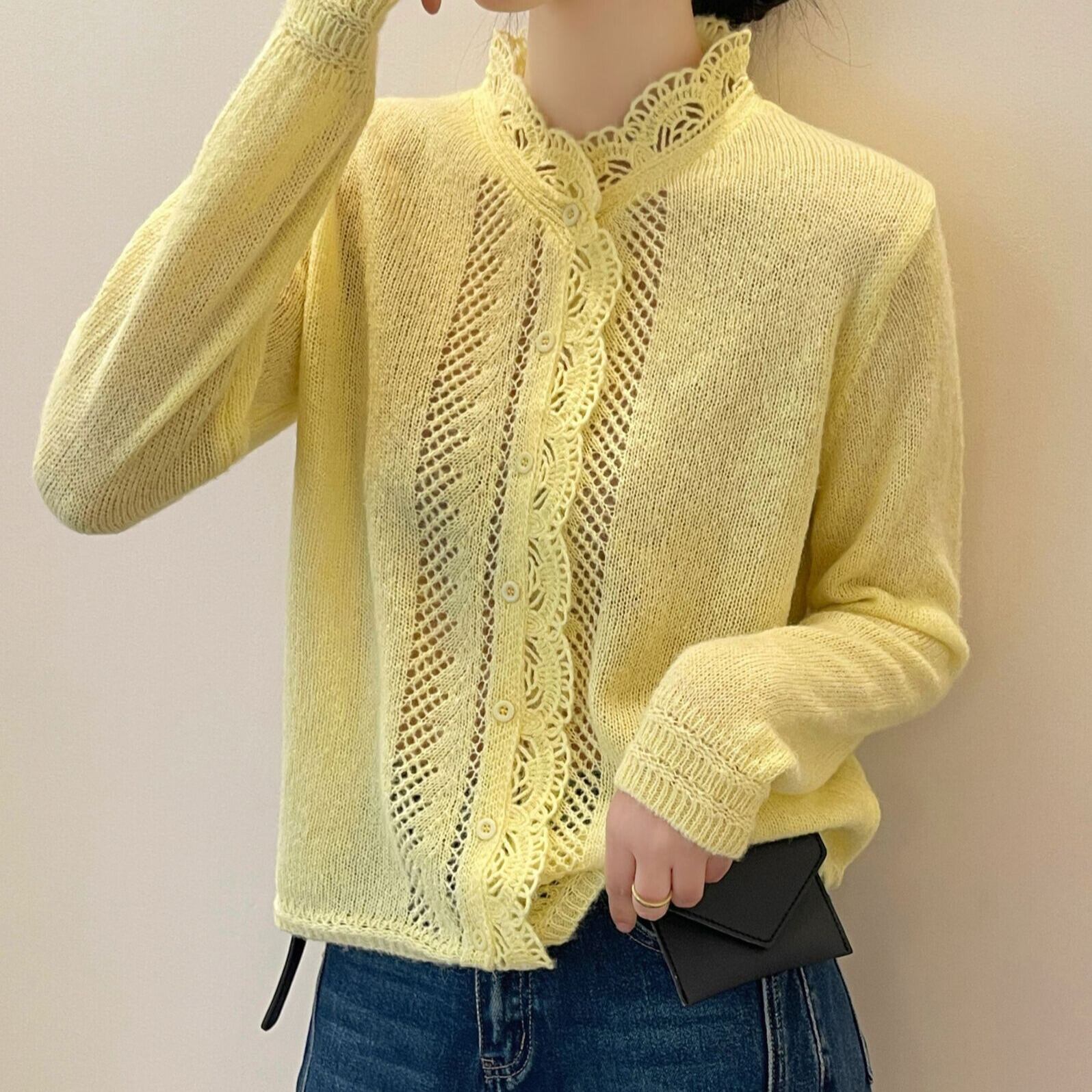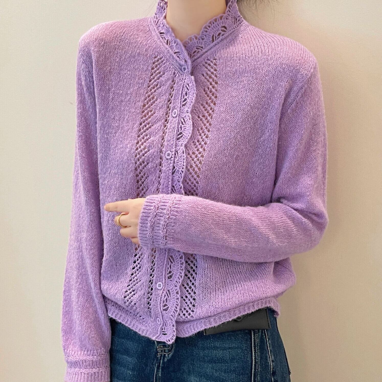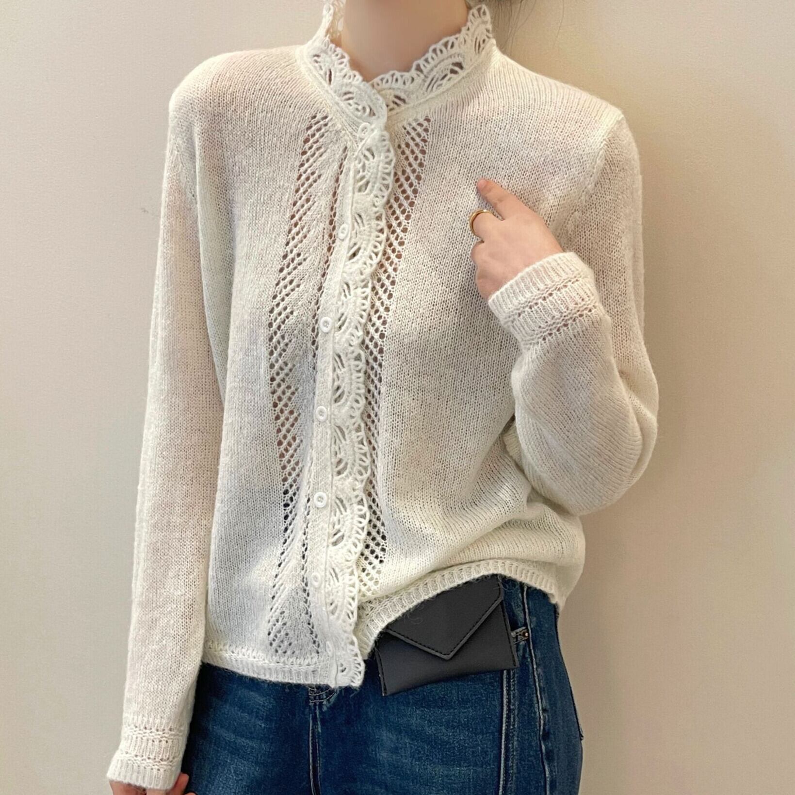 着用するだけでフェミニンな雰囲気が漂うスタンドカラーエレガントレースステッチニットカーディガン。