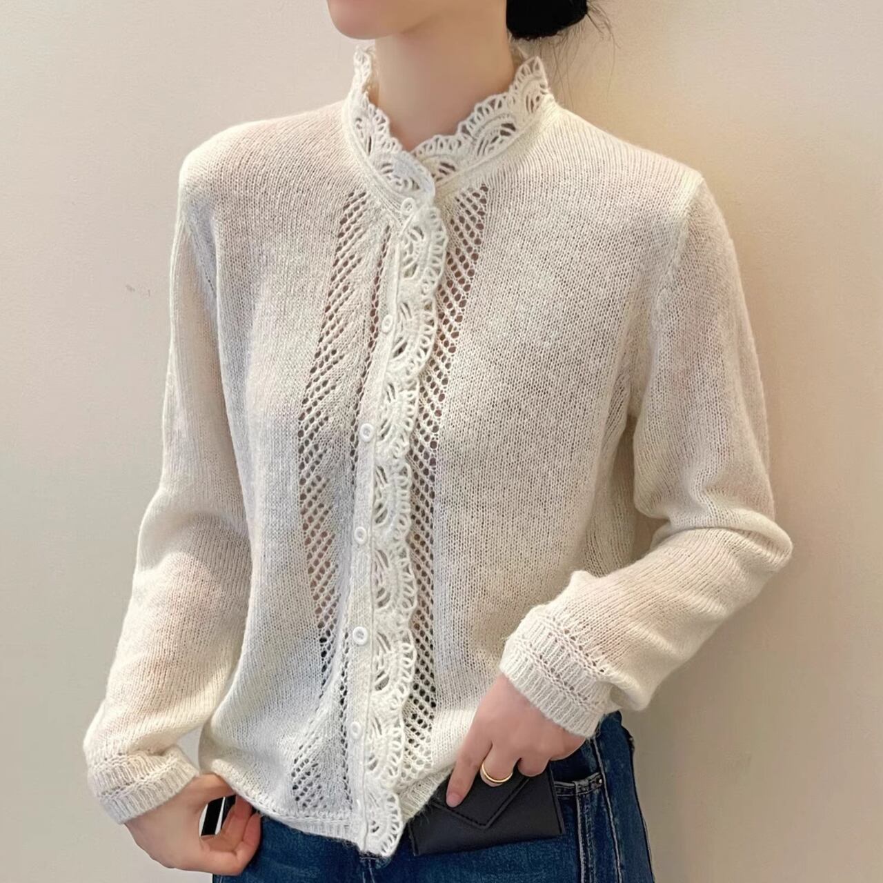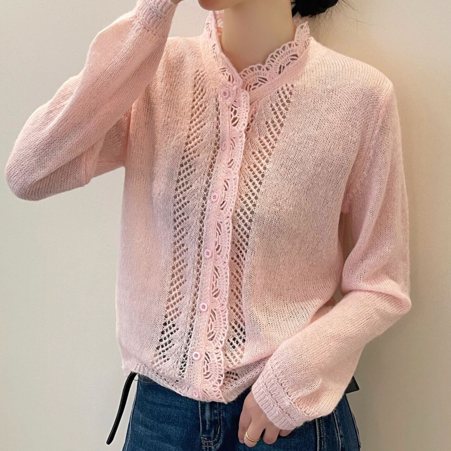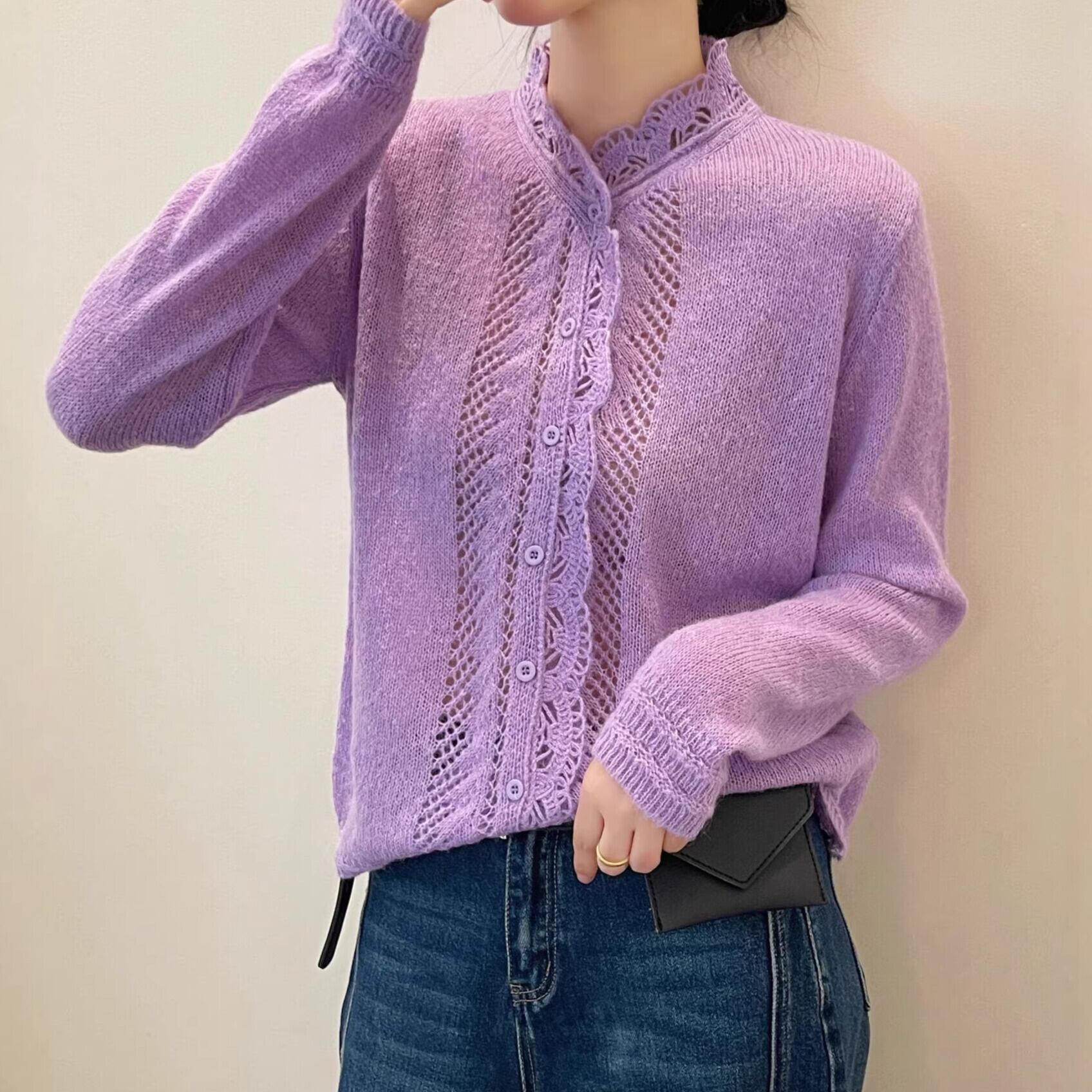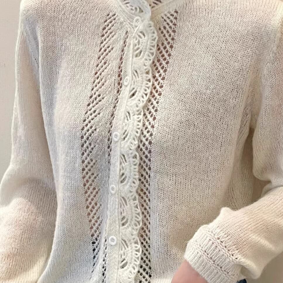 着用するだけでフェミニンな雰囲気が漂うスタンドカラーエレガントレースステッチニットカーディガン。