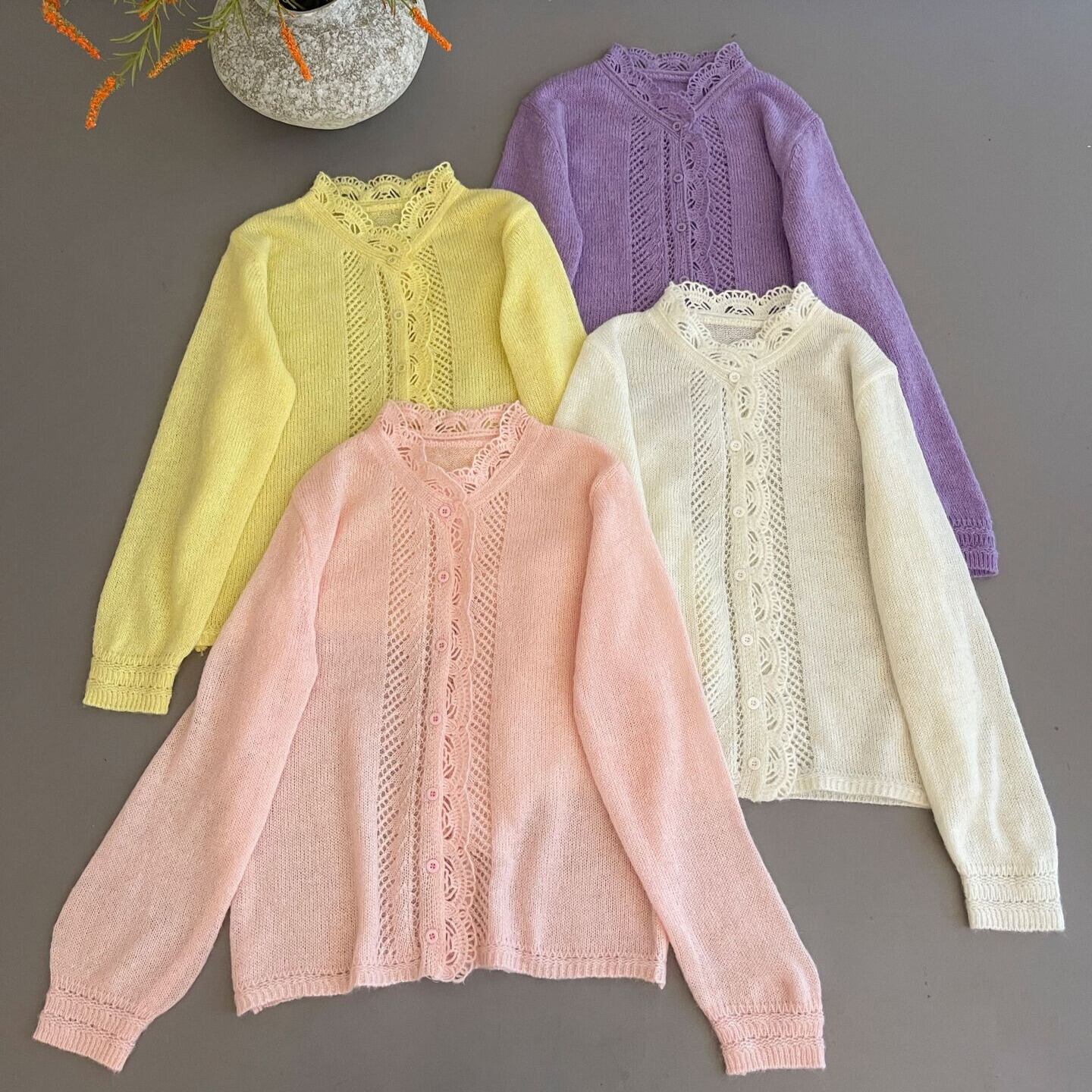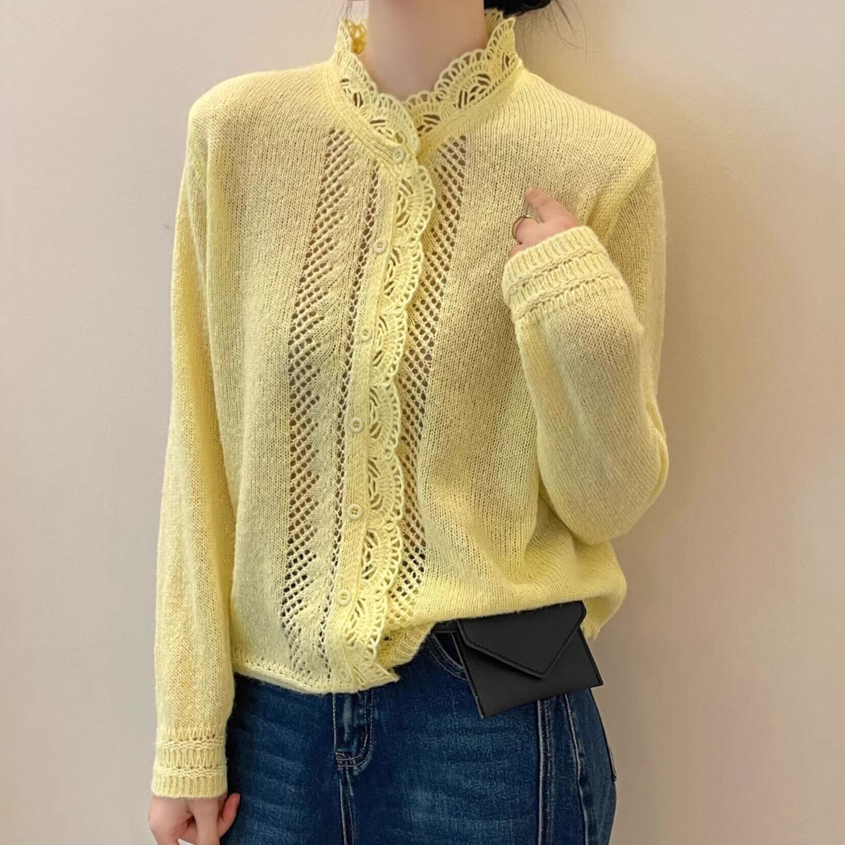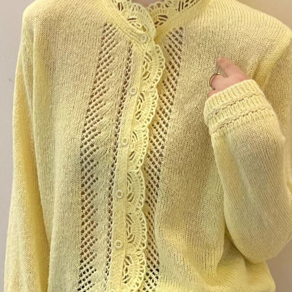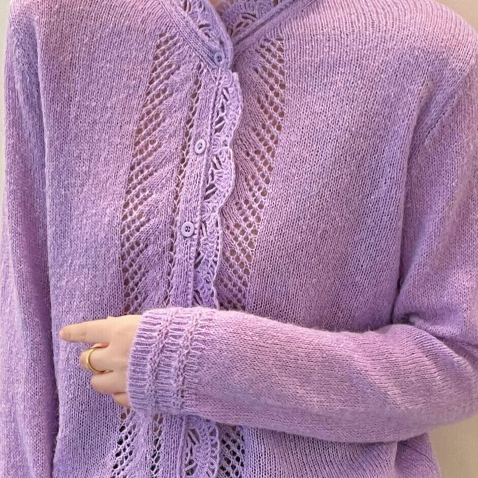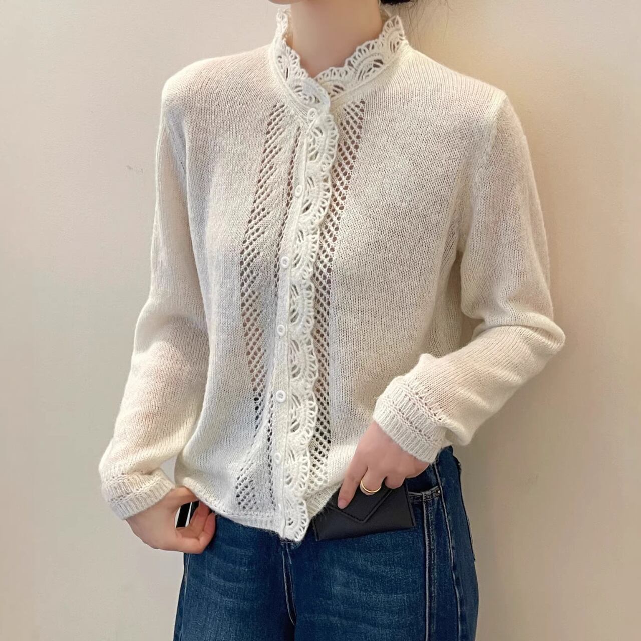 着用するだけでフェミニンな雰囲気が漂うスタンドカラーエレガントレースステッチニットカーディガン。