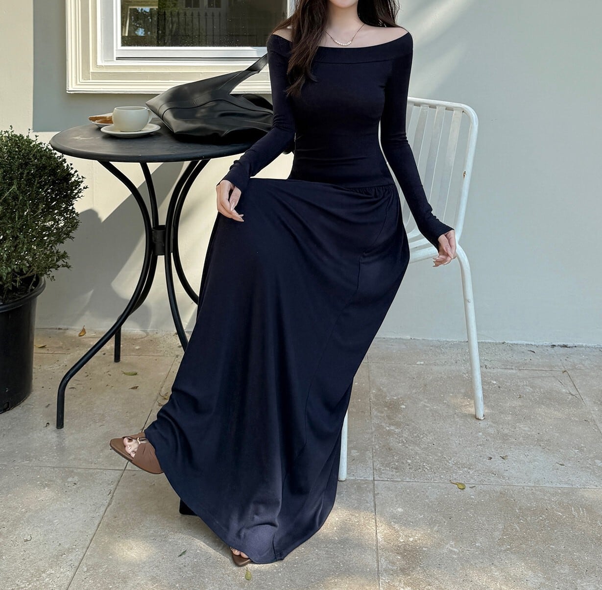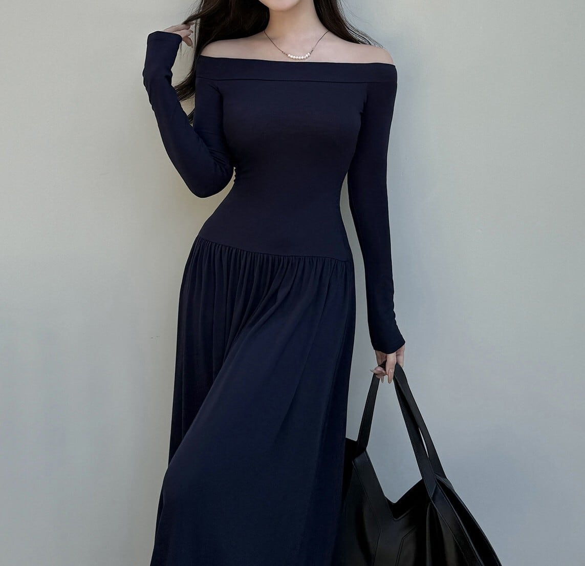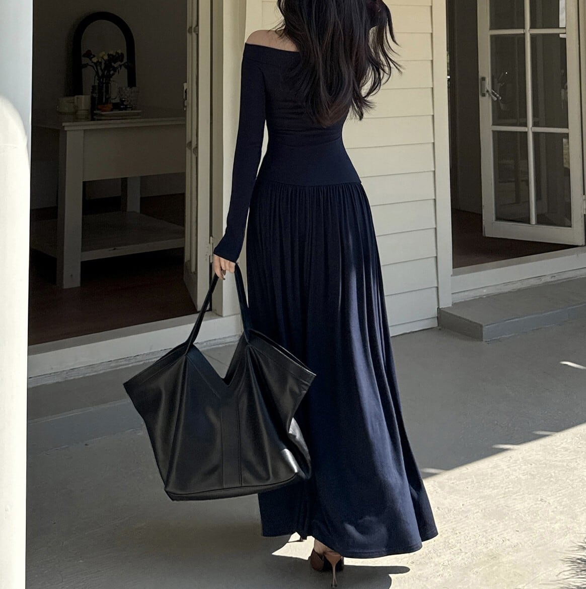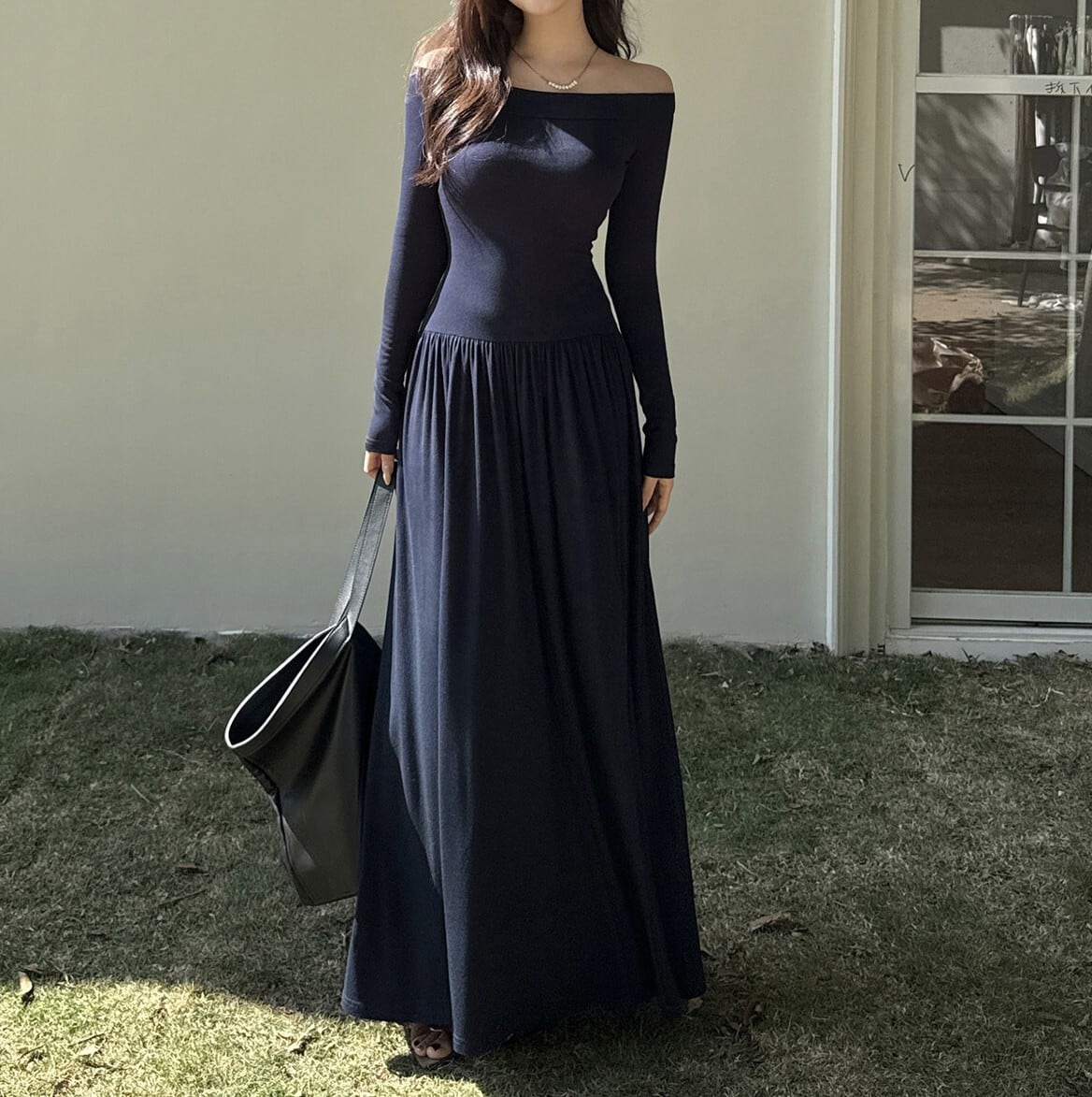 着用するだけでフェミニンな雰囲気が漂うオフショルダーエレガントウエストフィットロングニットドレス。