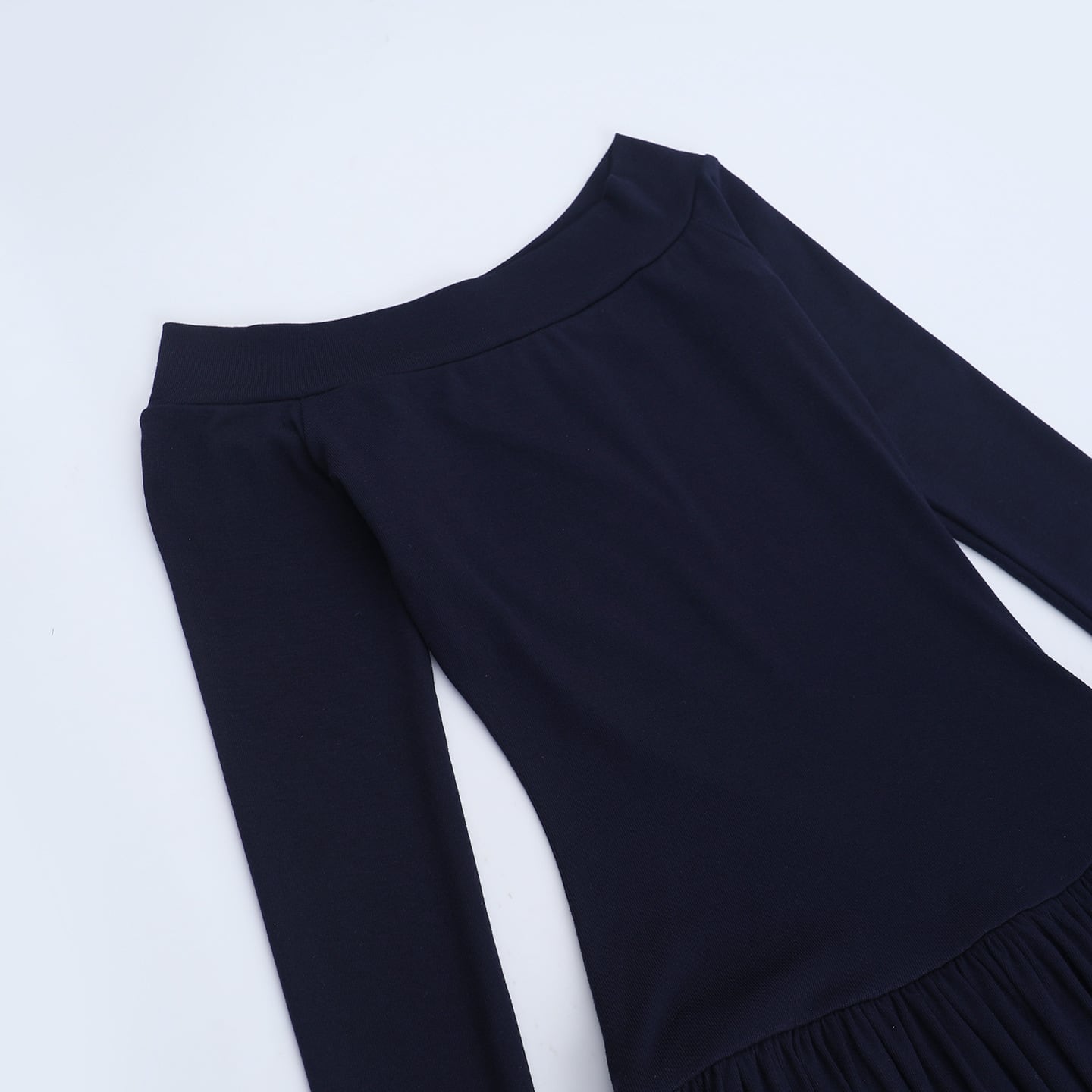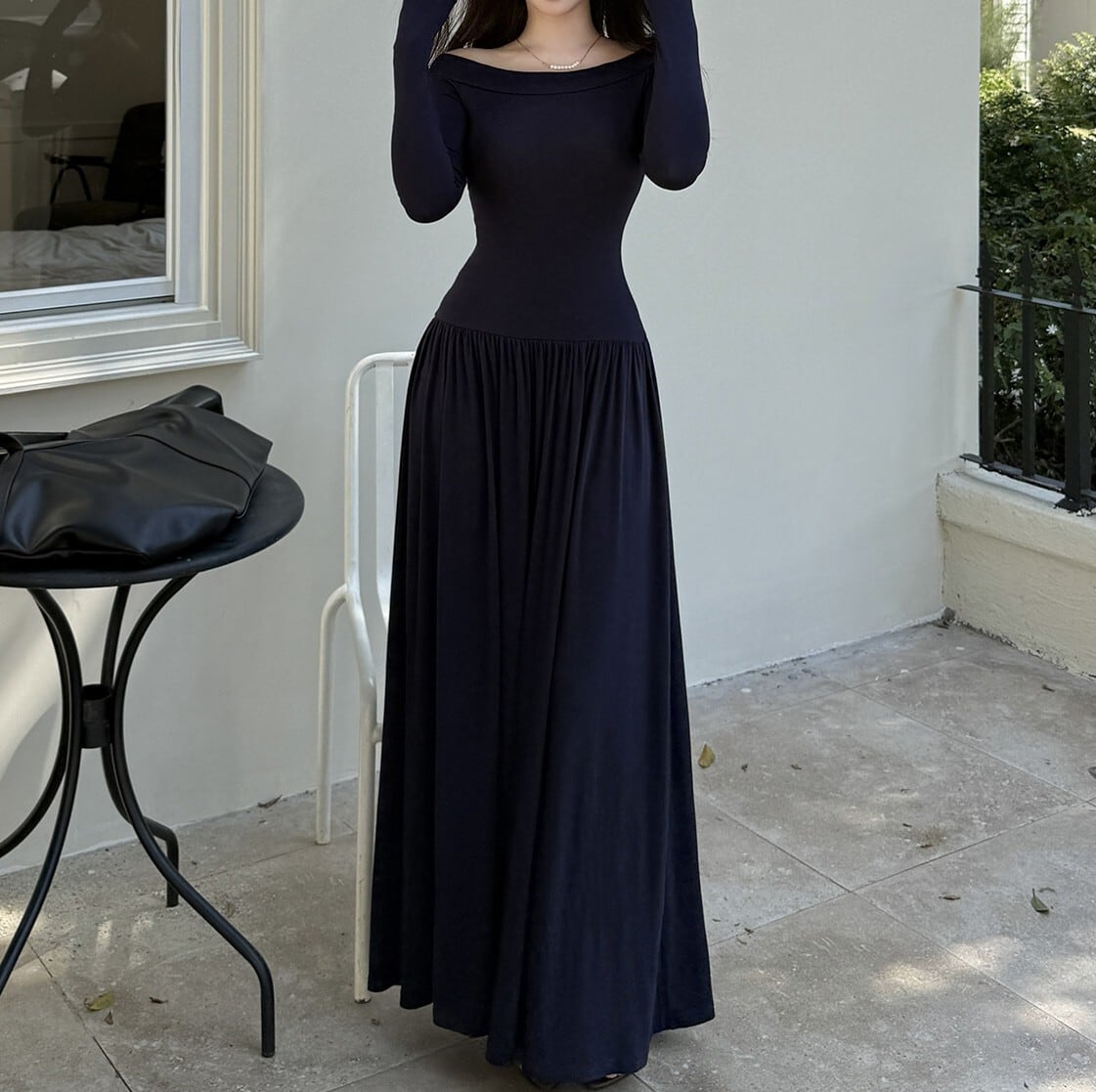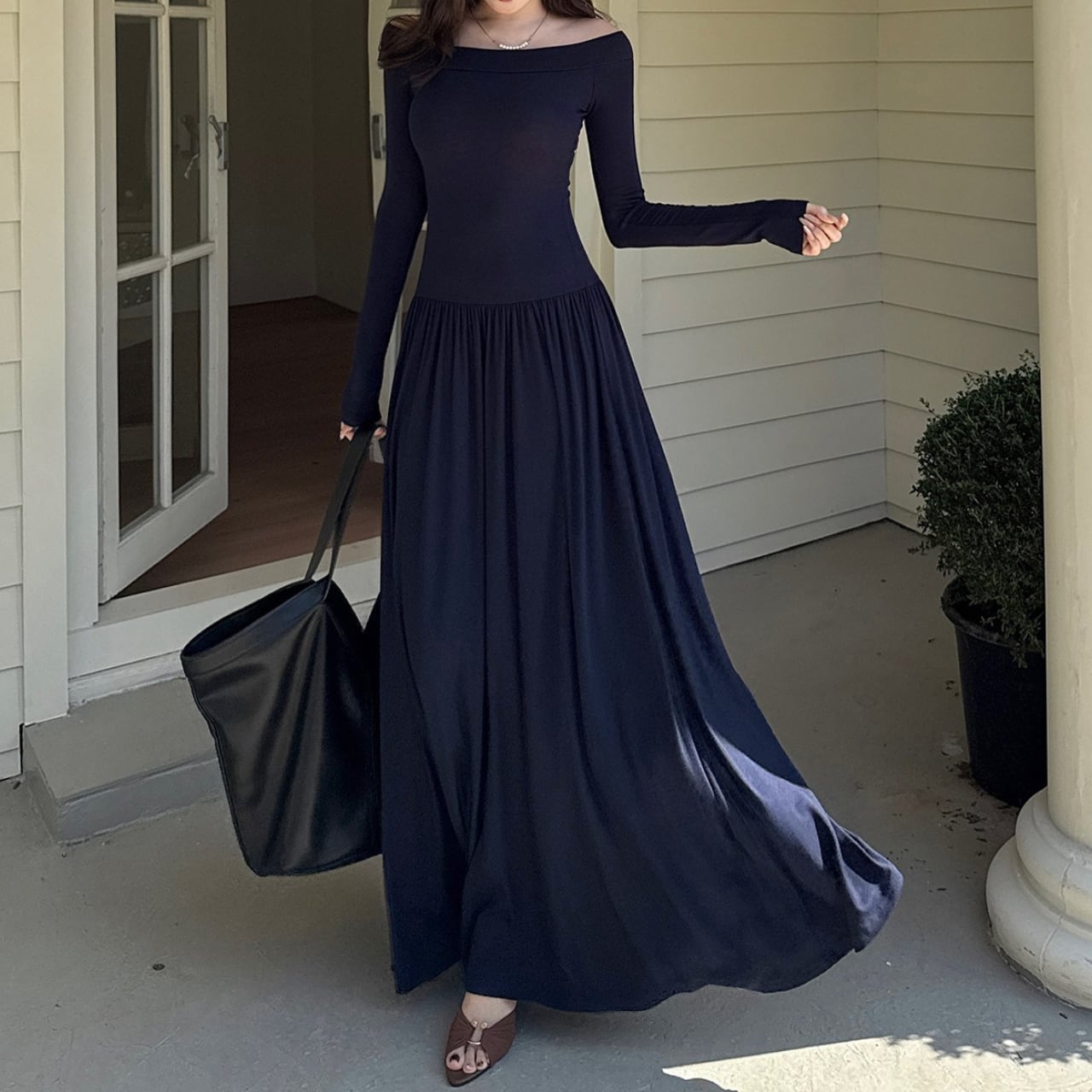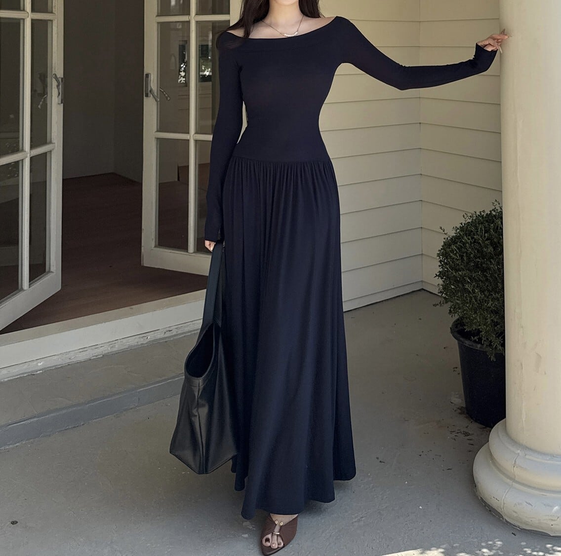 着用するだけでフェミニンな雰囲気が漂うオフショルダーエレガントウエストフィットロングニットドレス。