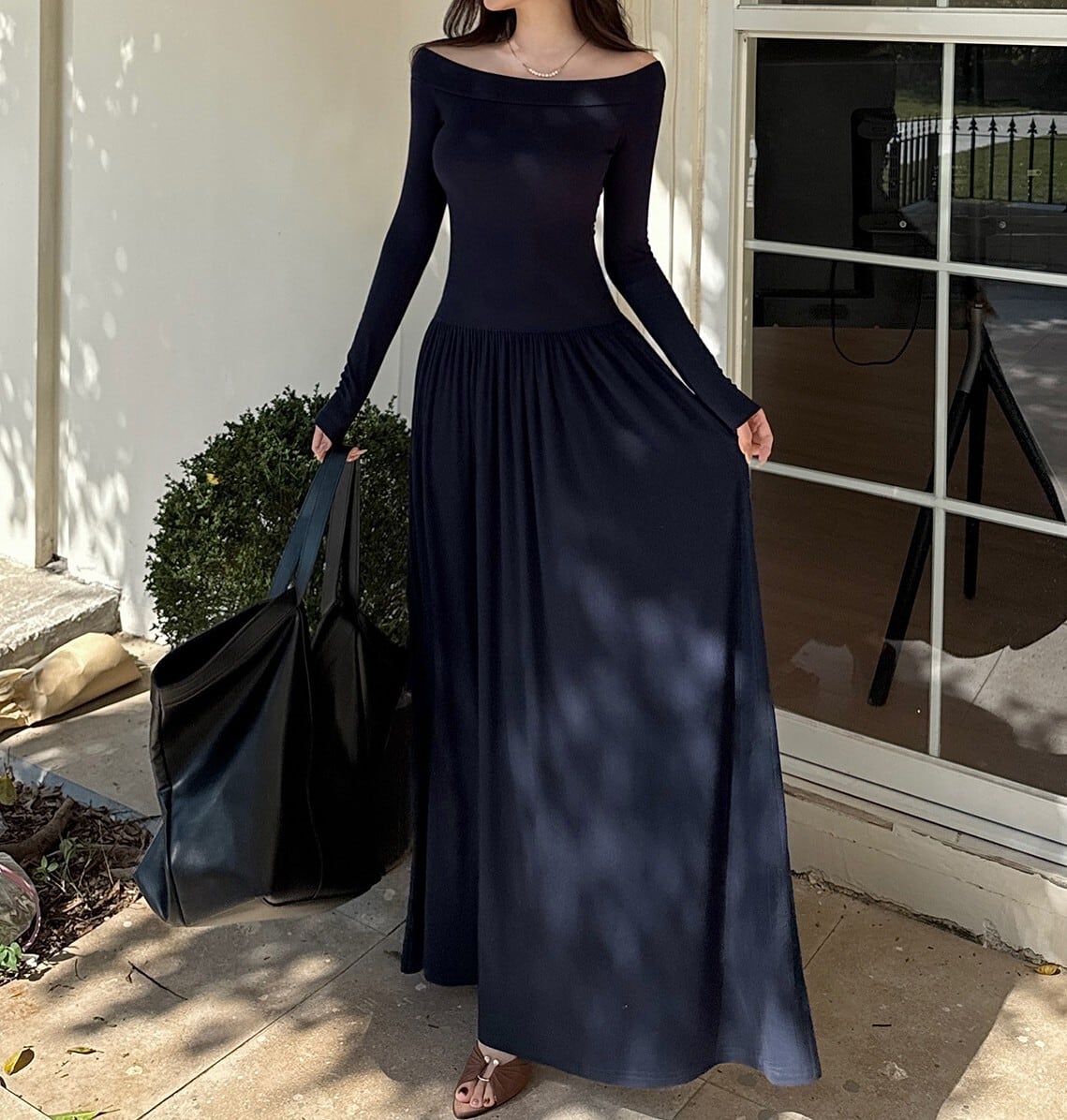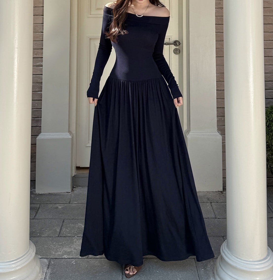 Off shoulder elegant waist fit long knit dress
