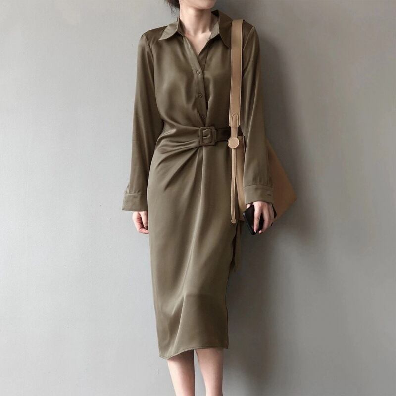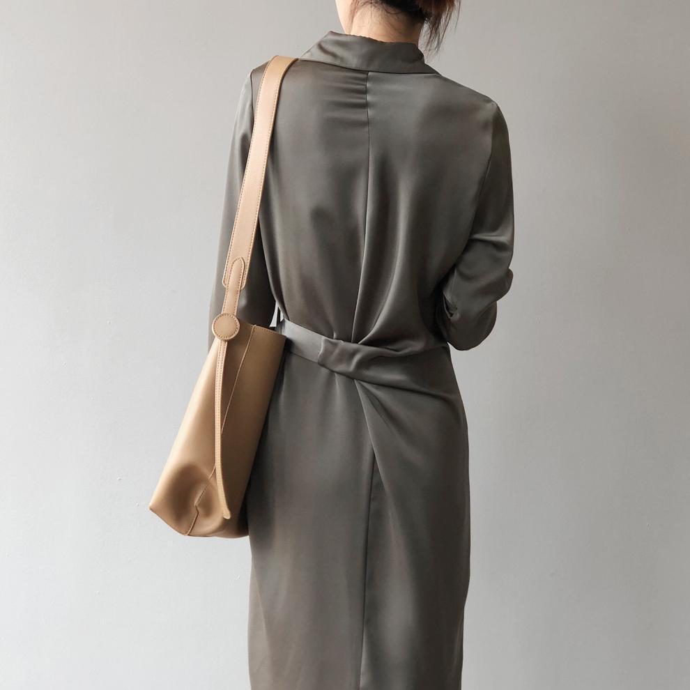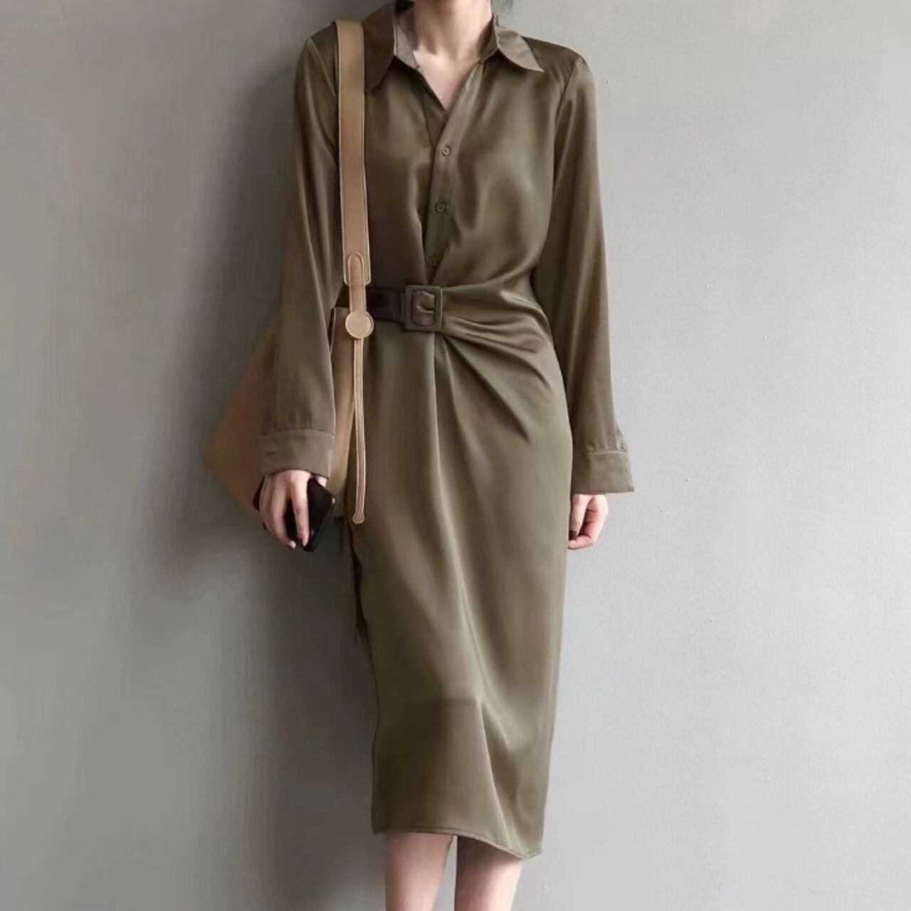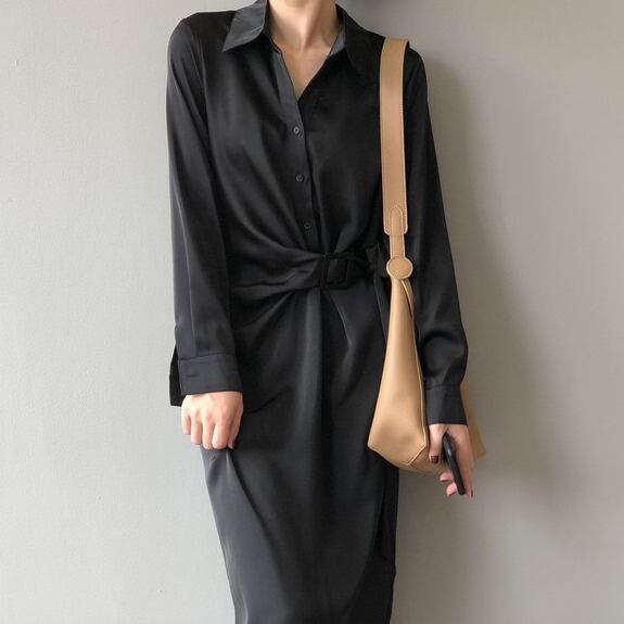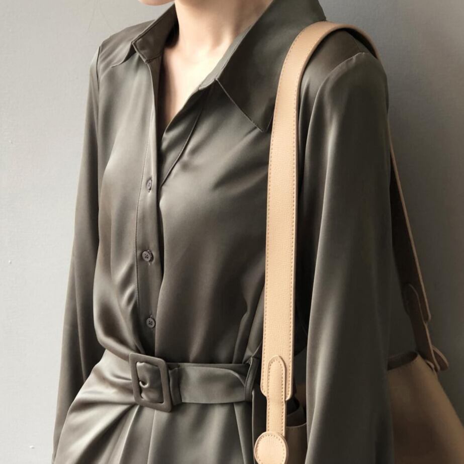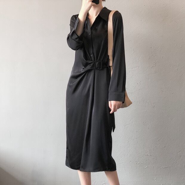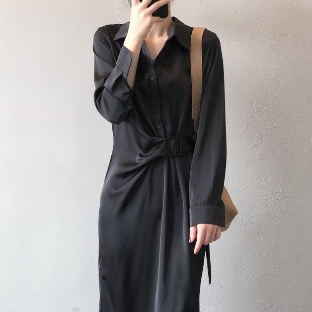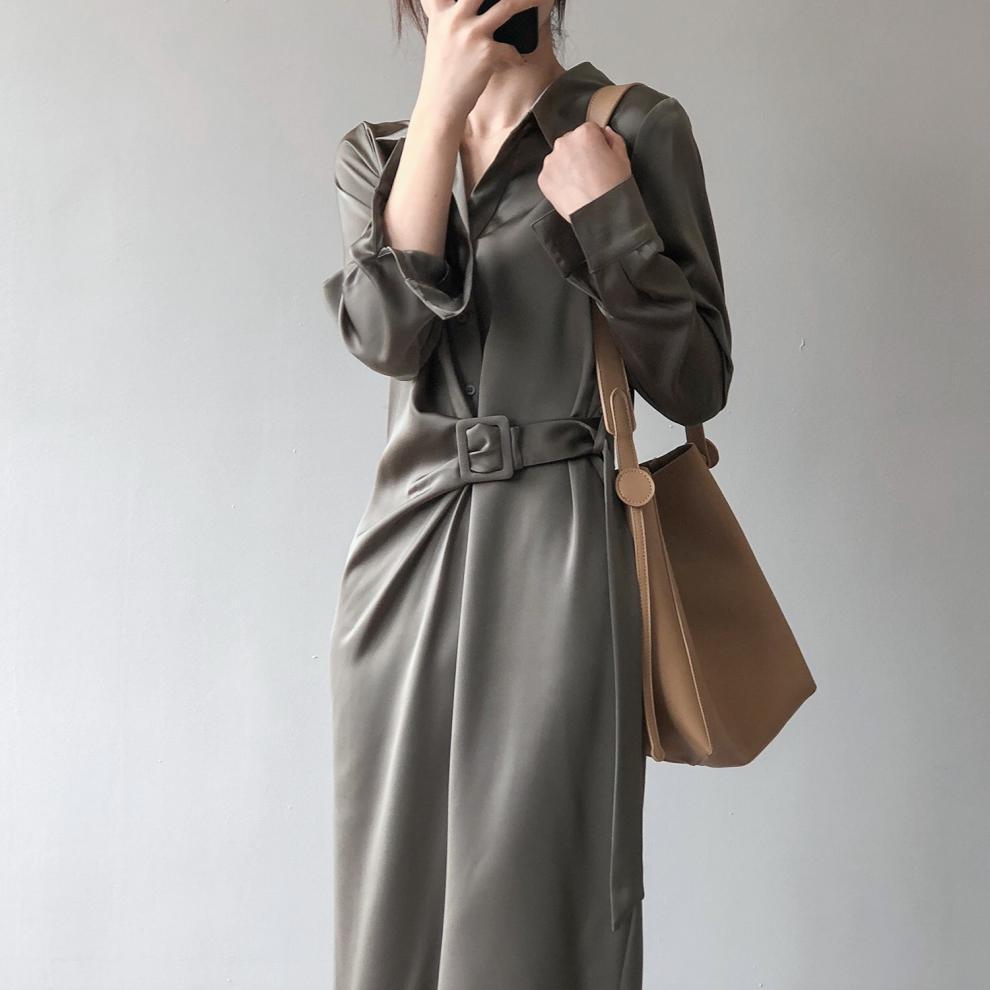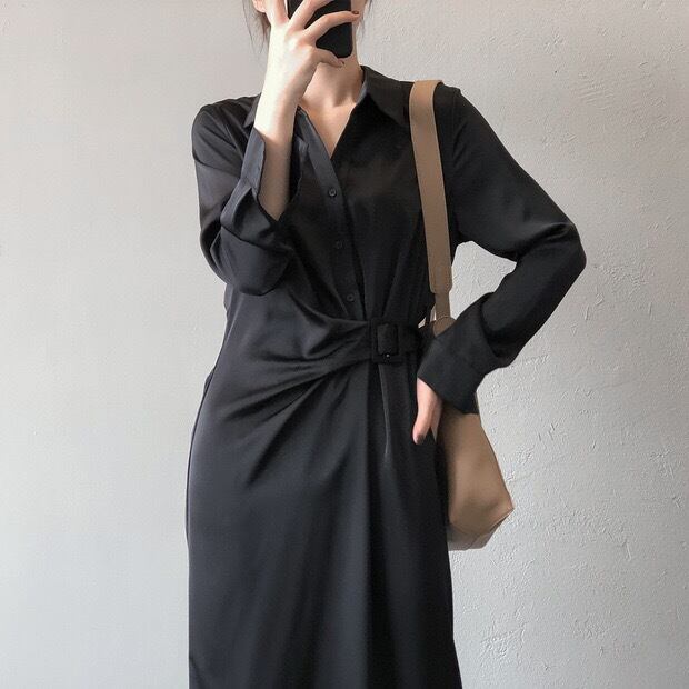 Lapel collar elegant strap long shirt dress ( 3color)