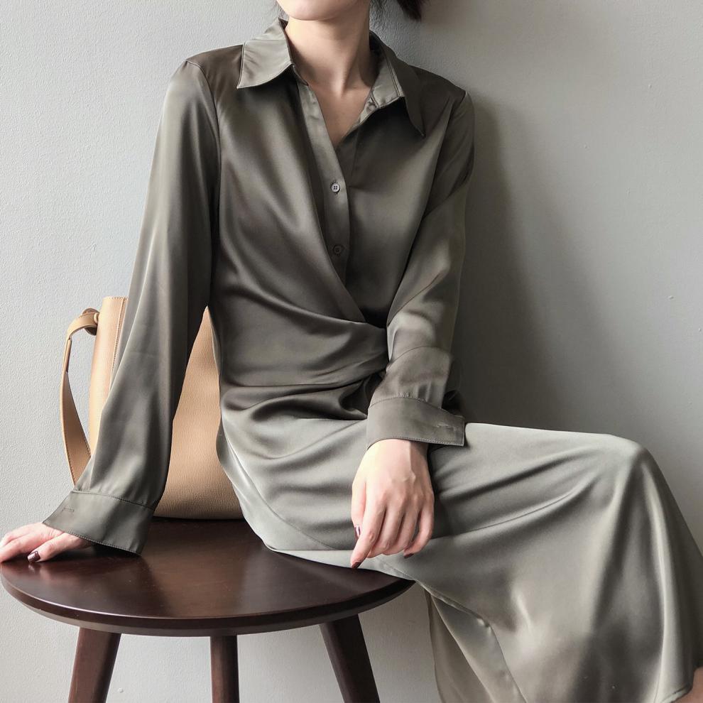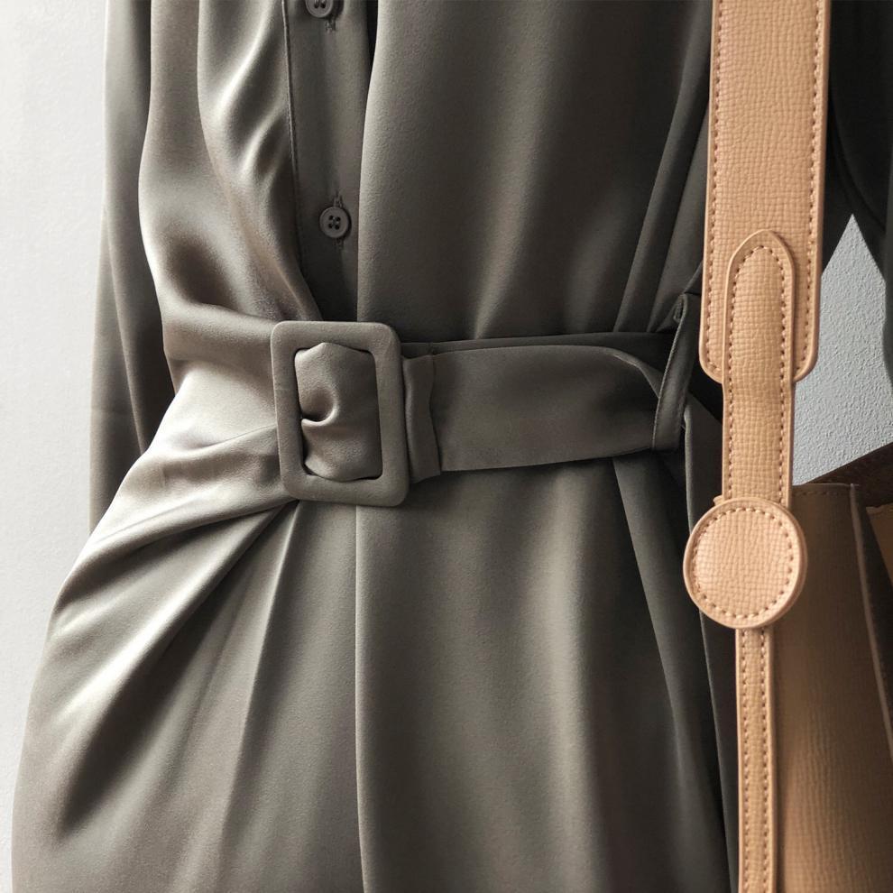 着用するだけでフェミニンな雰囲気が漂うラペルカラーエレガントストラップロングシャツドレス。