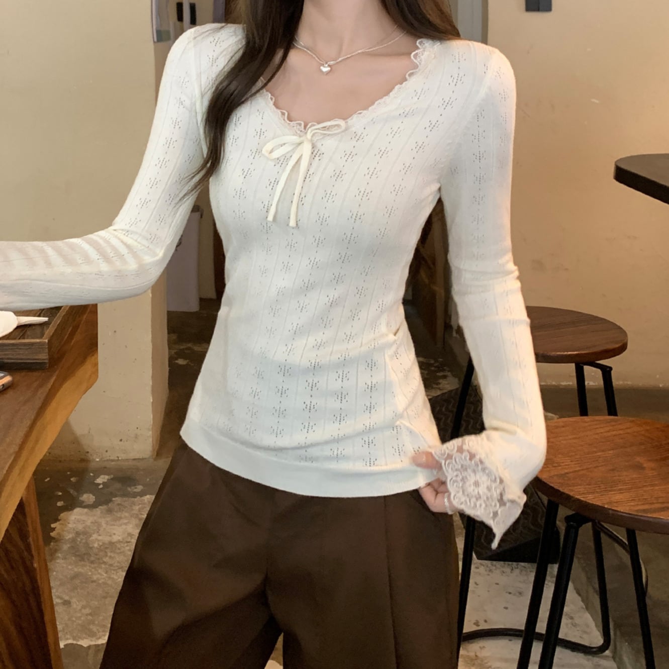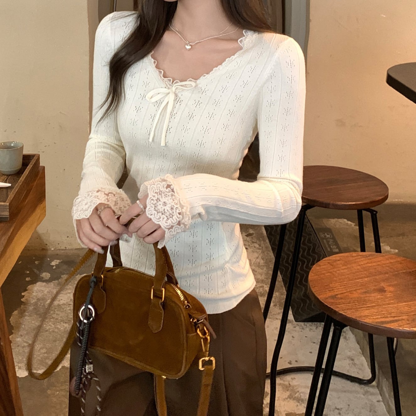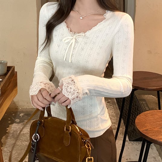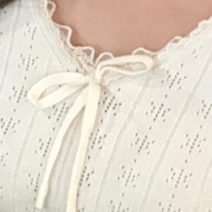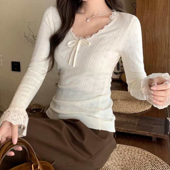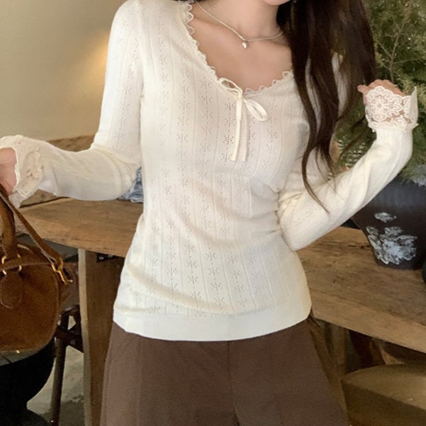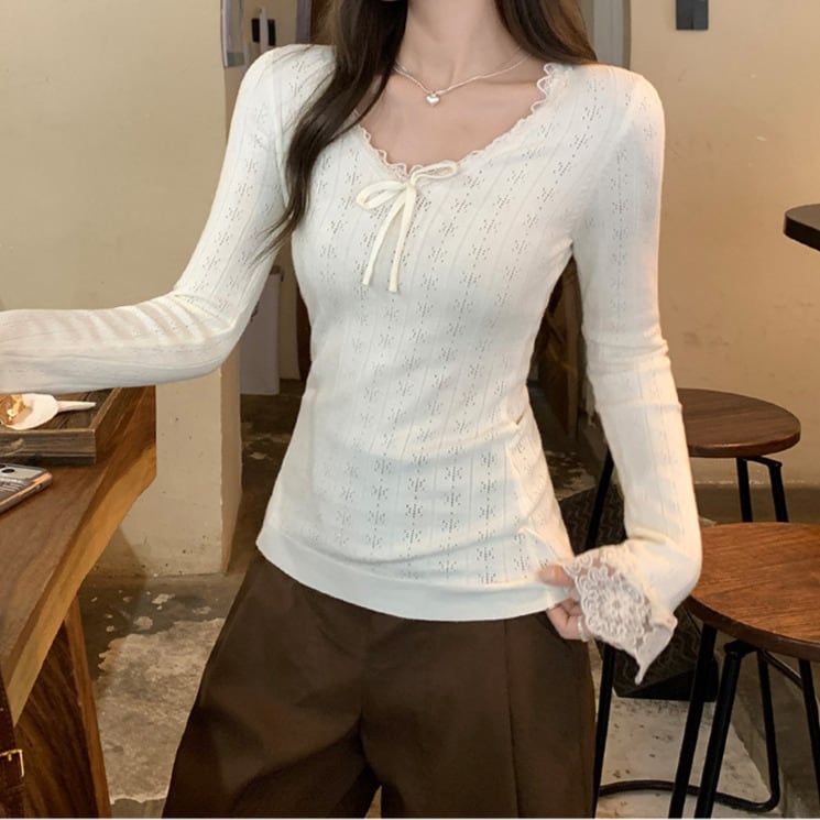 Chest ribbon elegant lace stitch slim knit