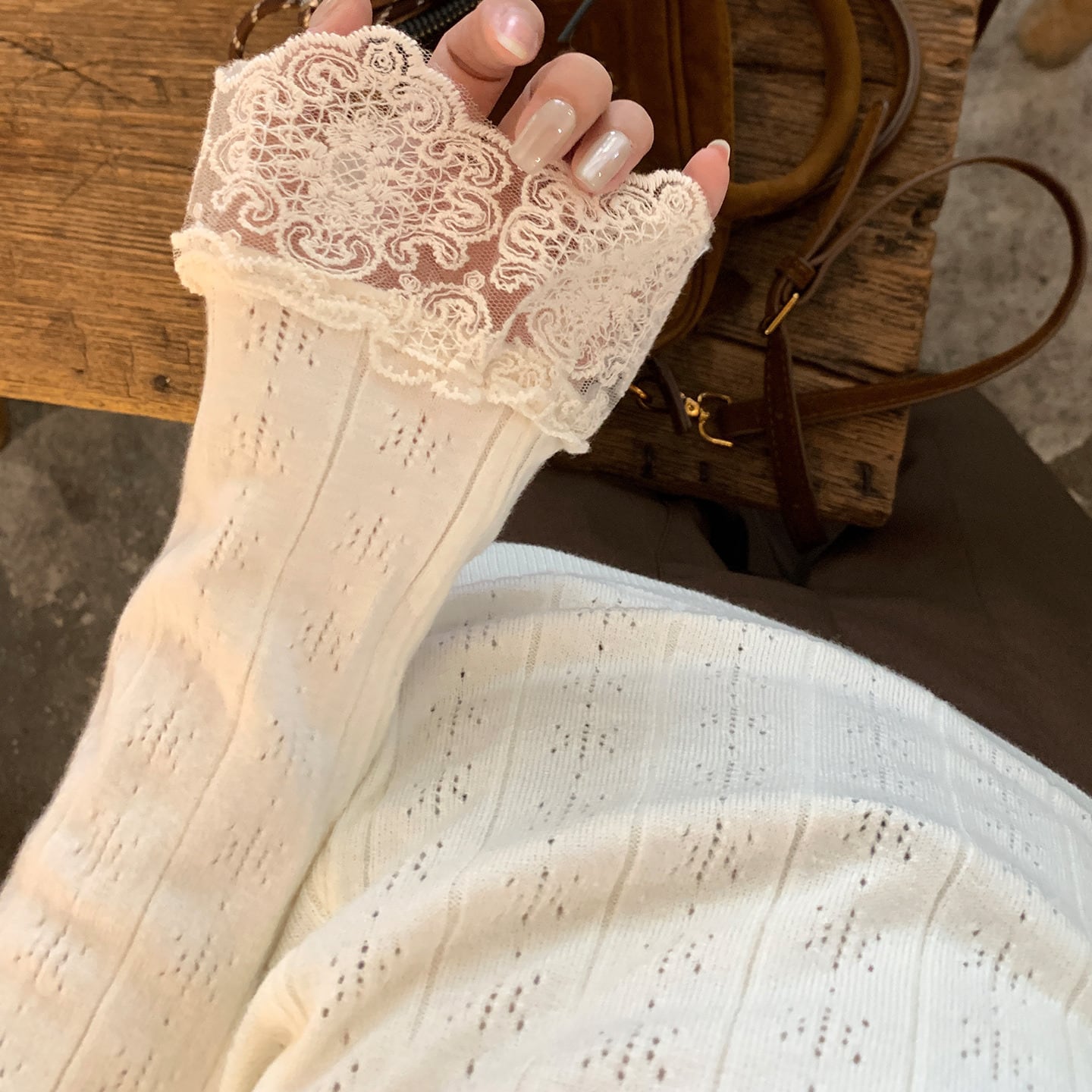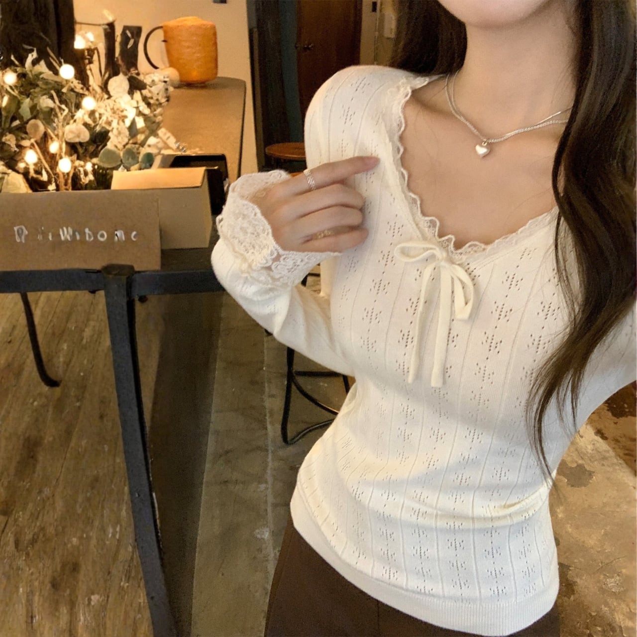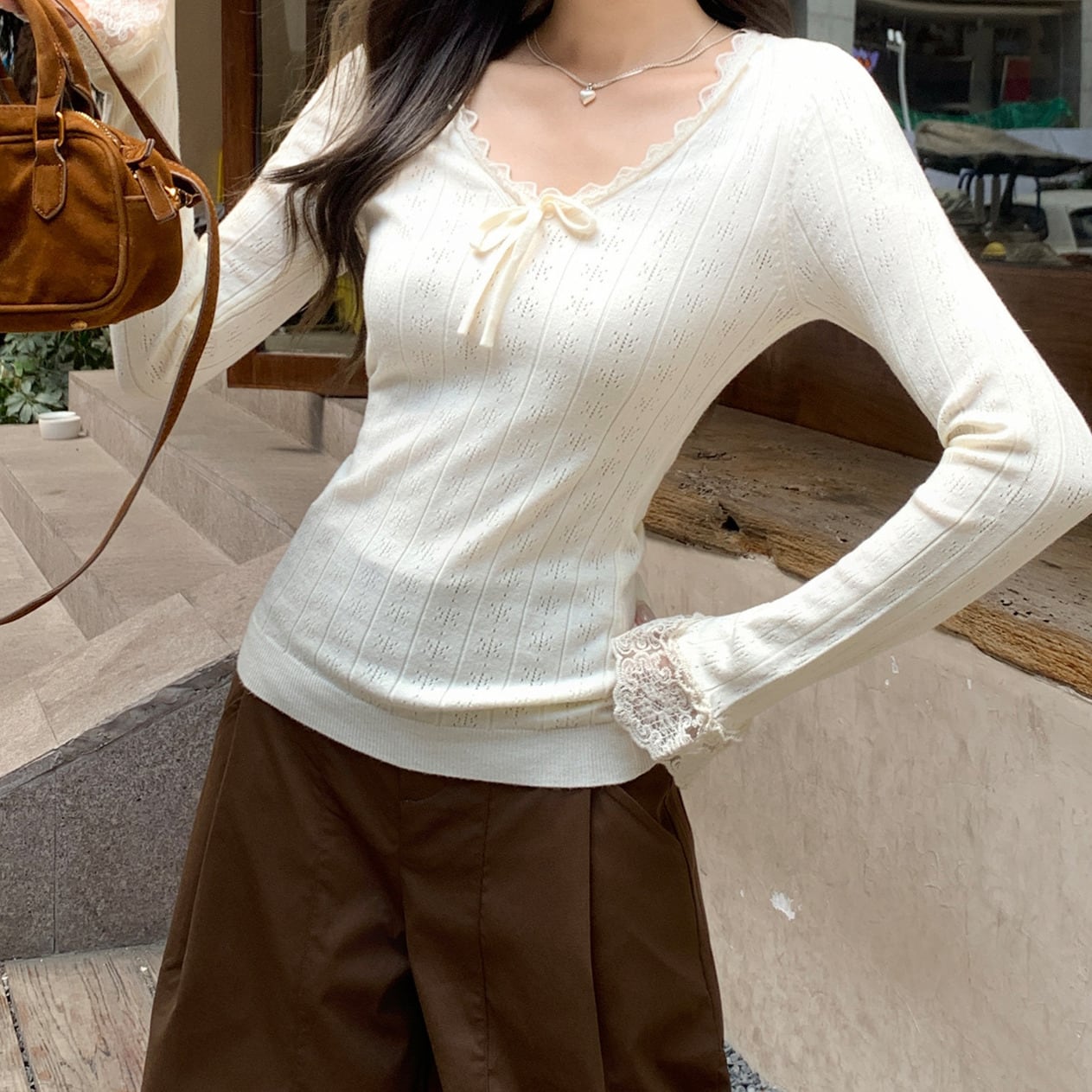 Chest ribbon elegant lace stitch slim knit