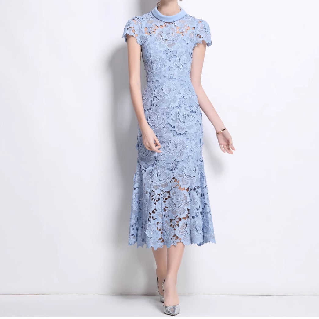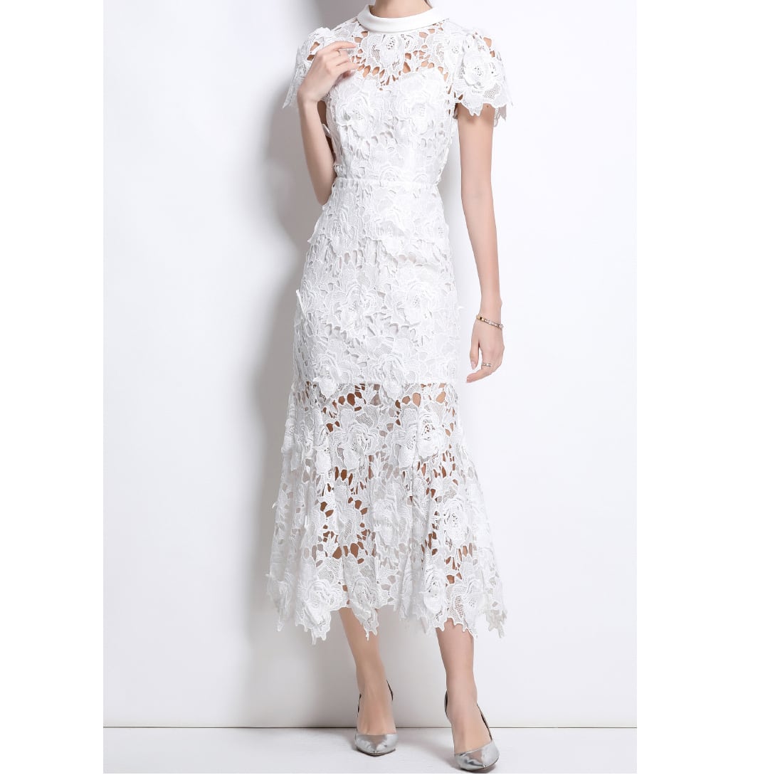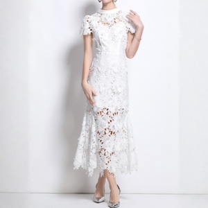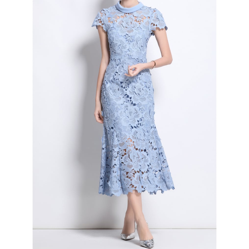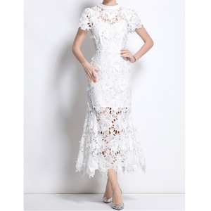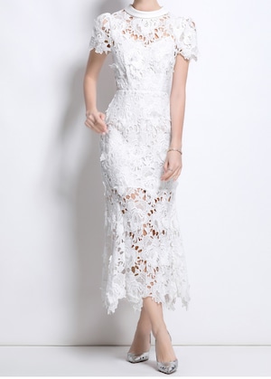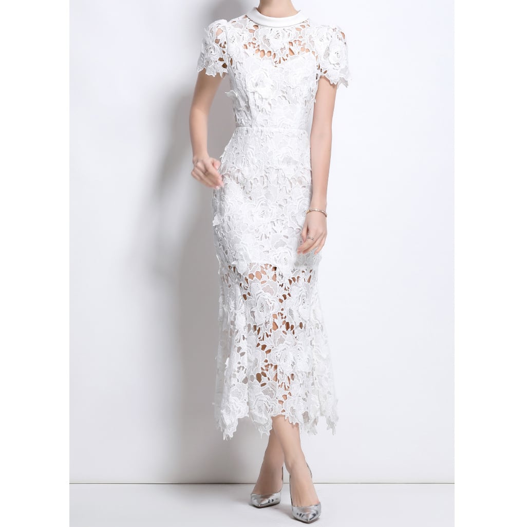 着用するだけでフェミニンな雰囲気が漂うショートスリーブエレガントウエストフィットロングレースマーメイドドレス。