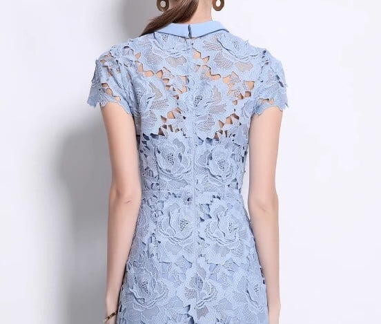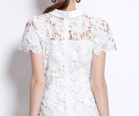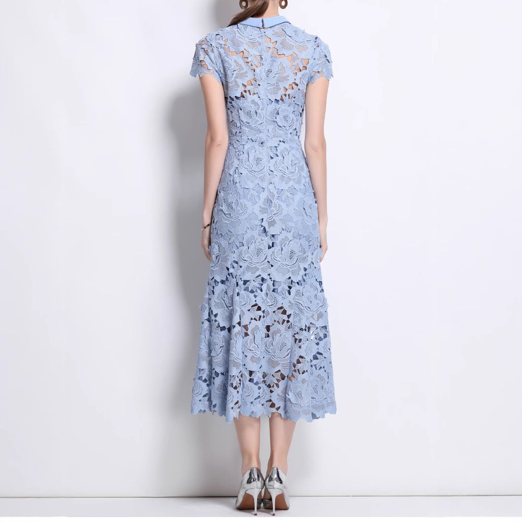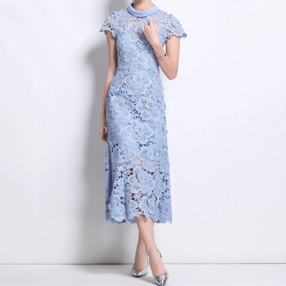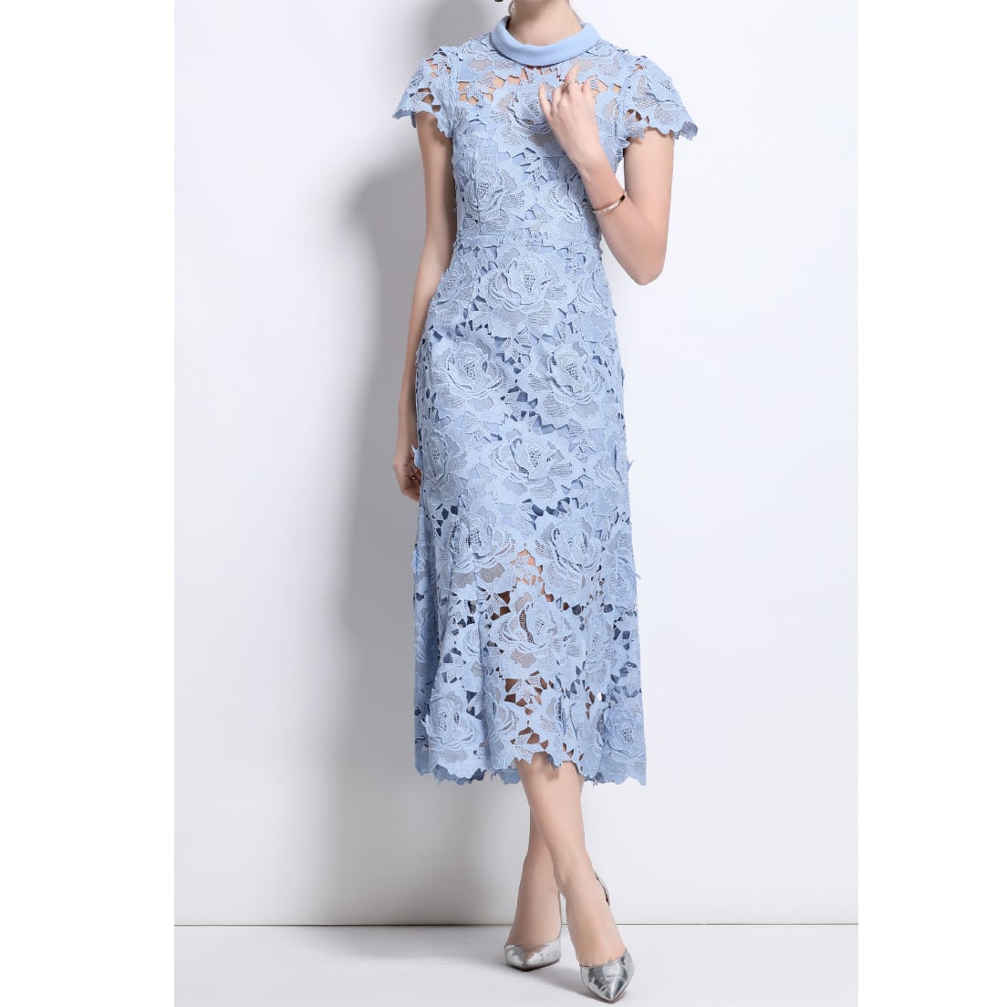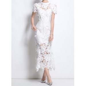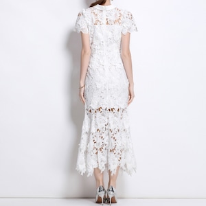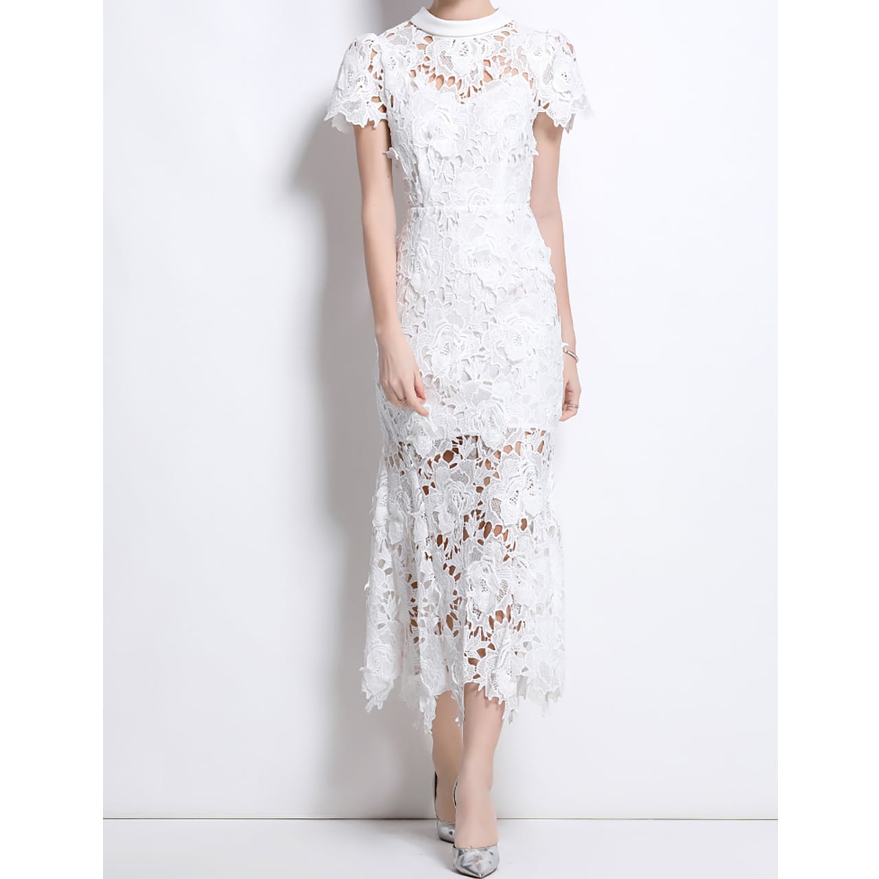 着用するだけでフェミニンな雰囲気が漂うショートスリーブエレガントウエストフィットロングレースマーメイドドレス。