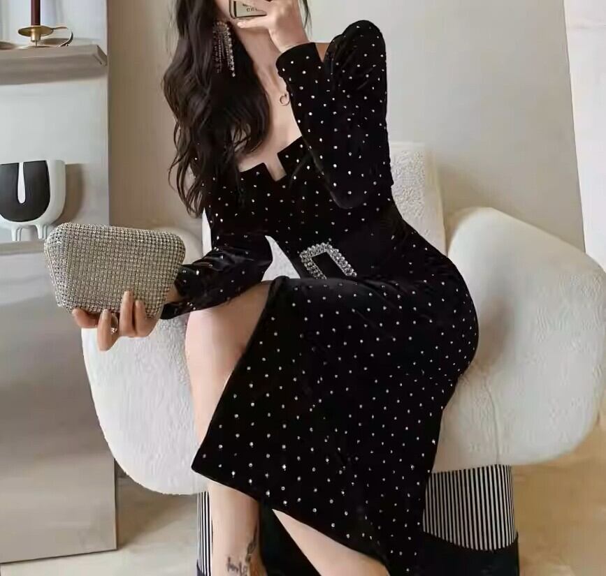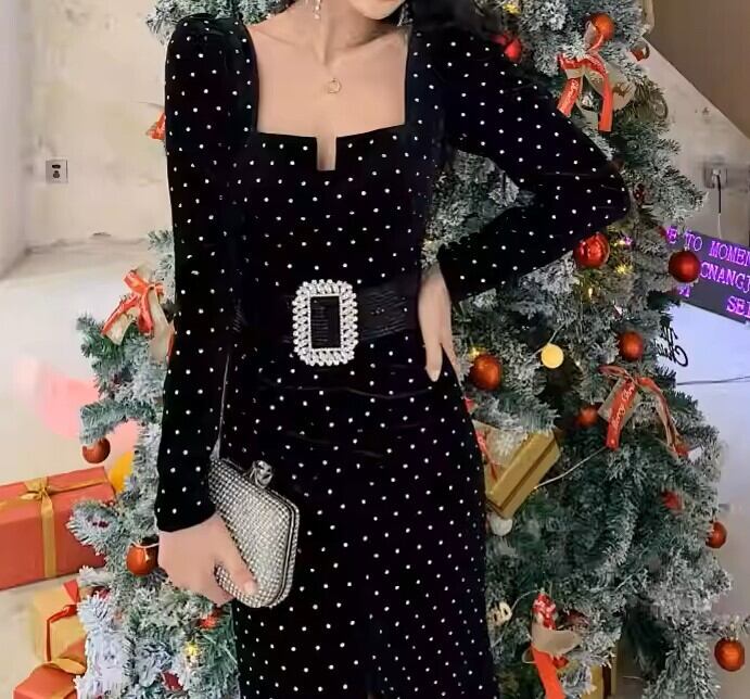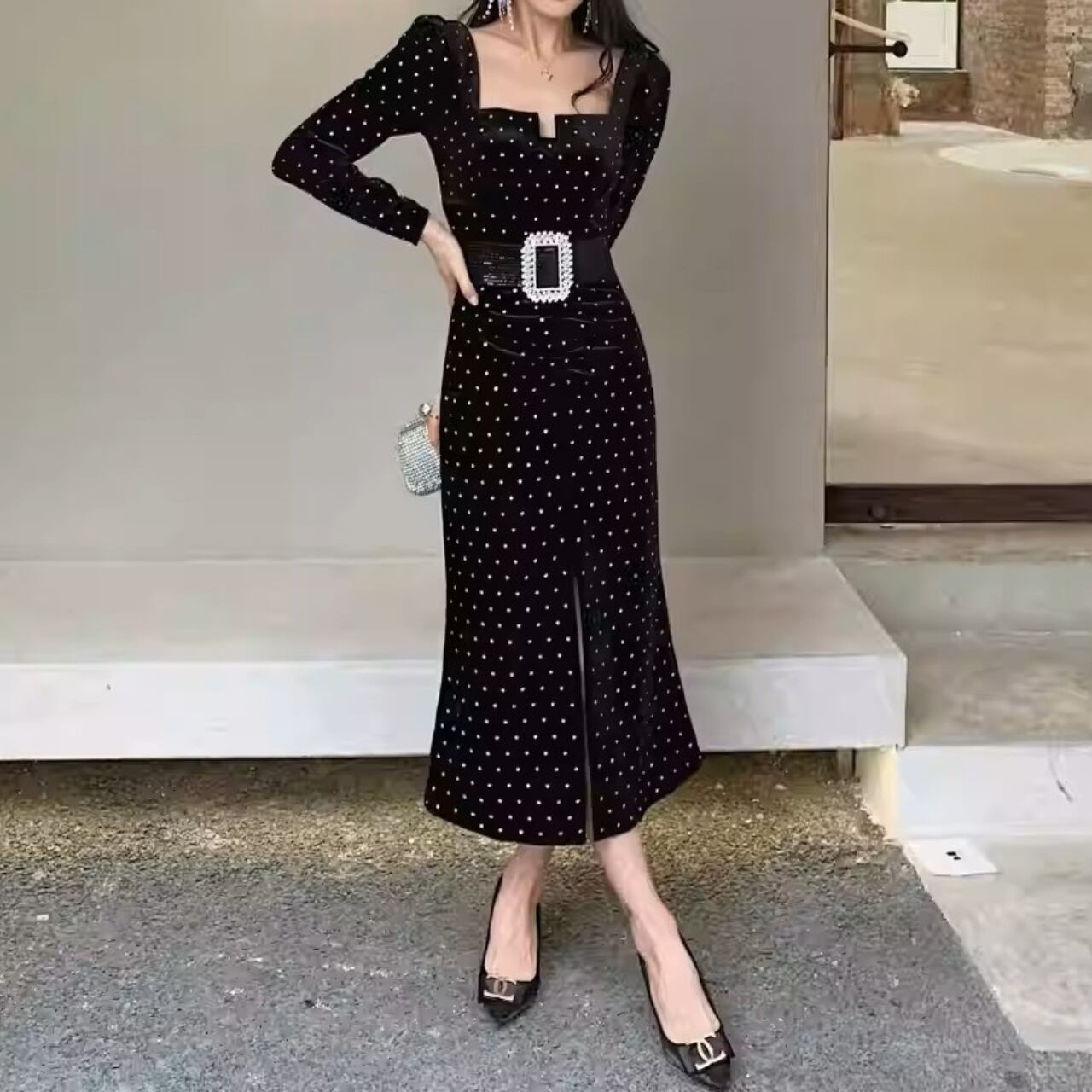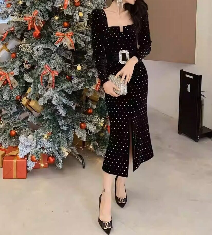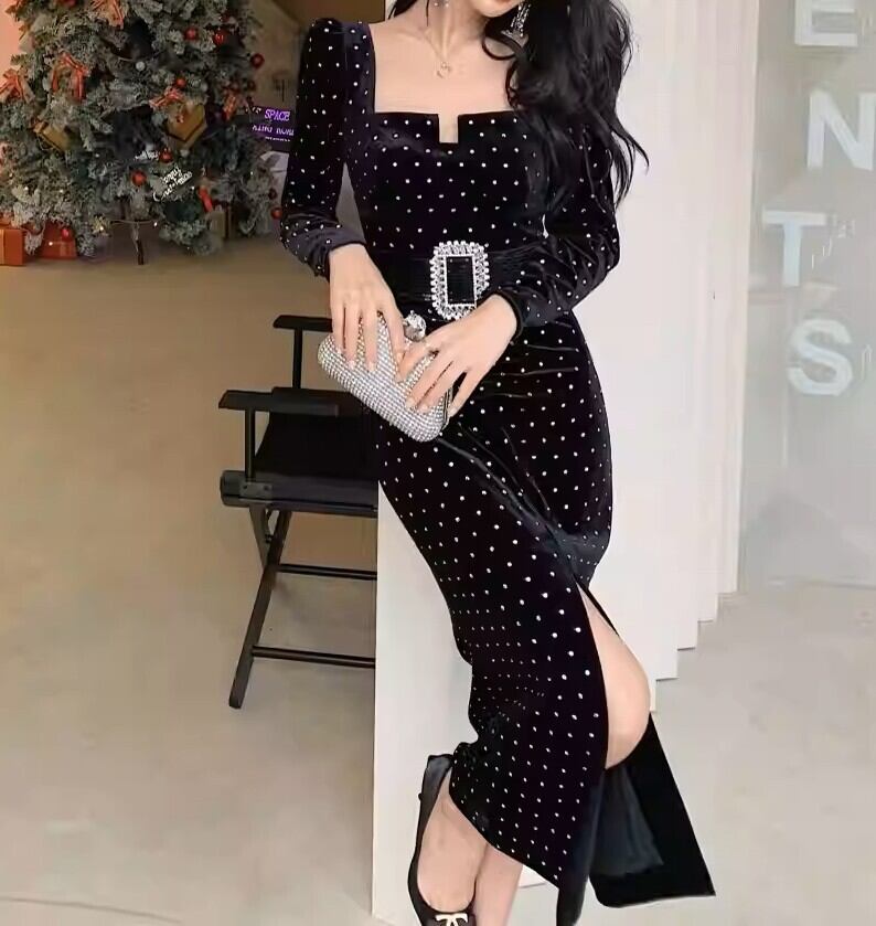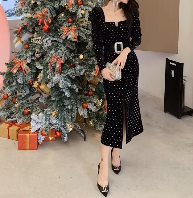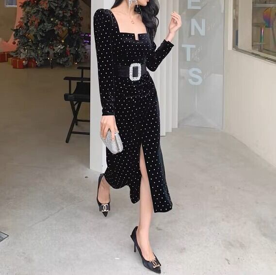 着用するだけでフェミニンな雰囲気が漂うスクエアカラーエレガントフロントスリットポルカドットロングドレス。