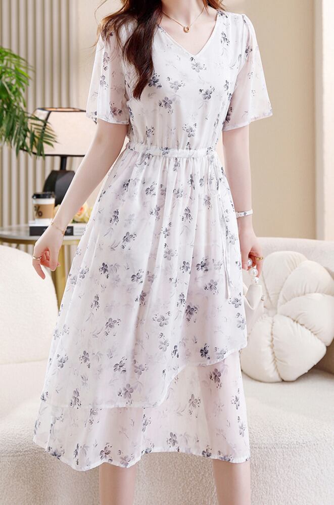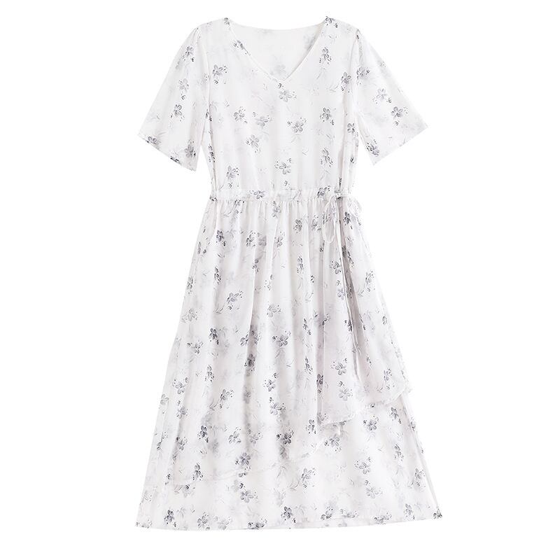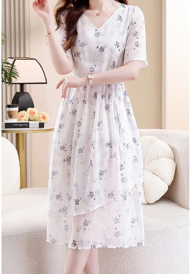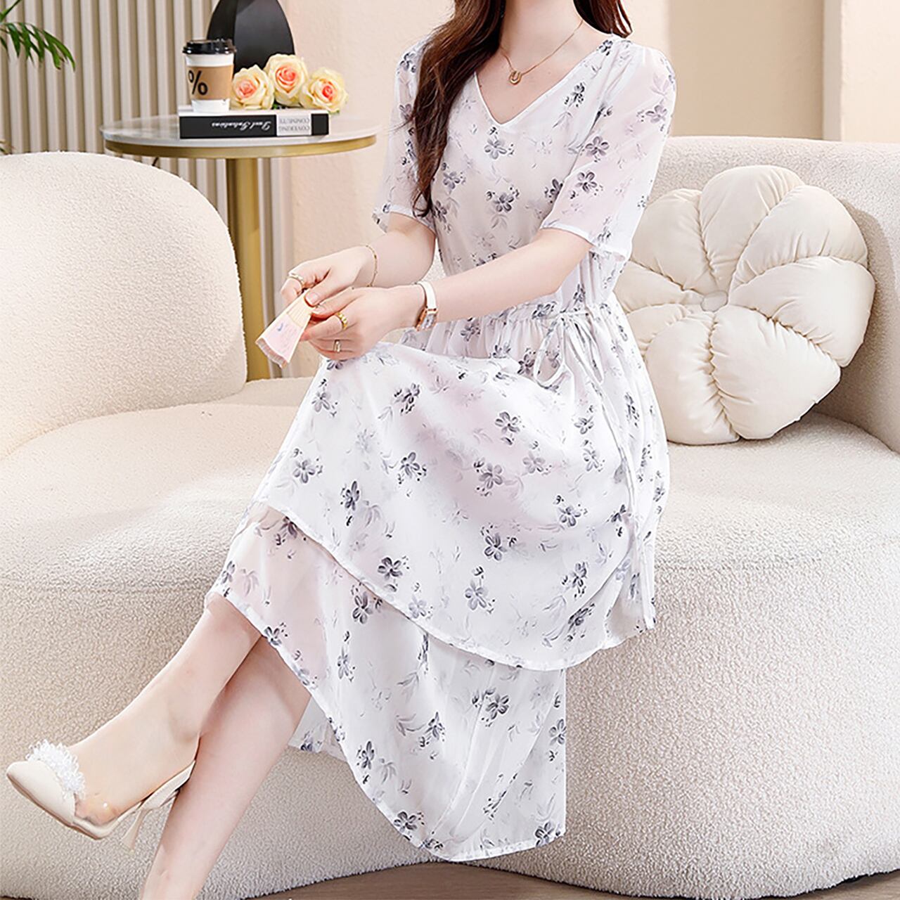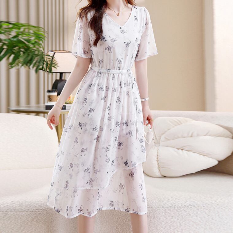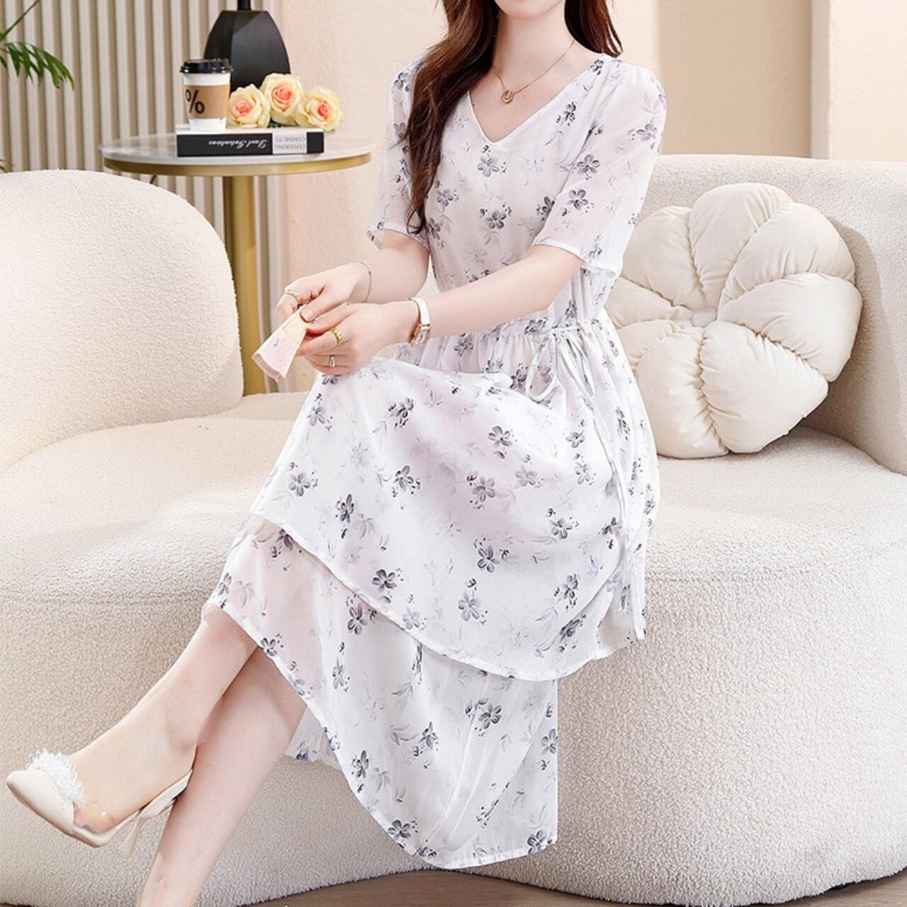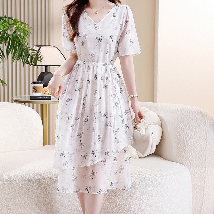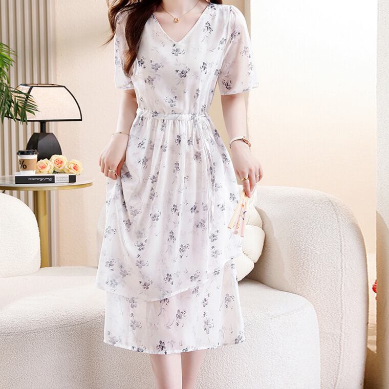 着用するだけで大人可愛い雰囲気が漂うVネックエレガントウエストリボンダブルレイヤーシフォンフローラルドレス。
