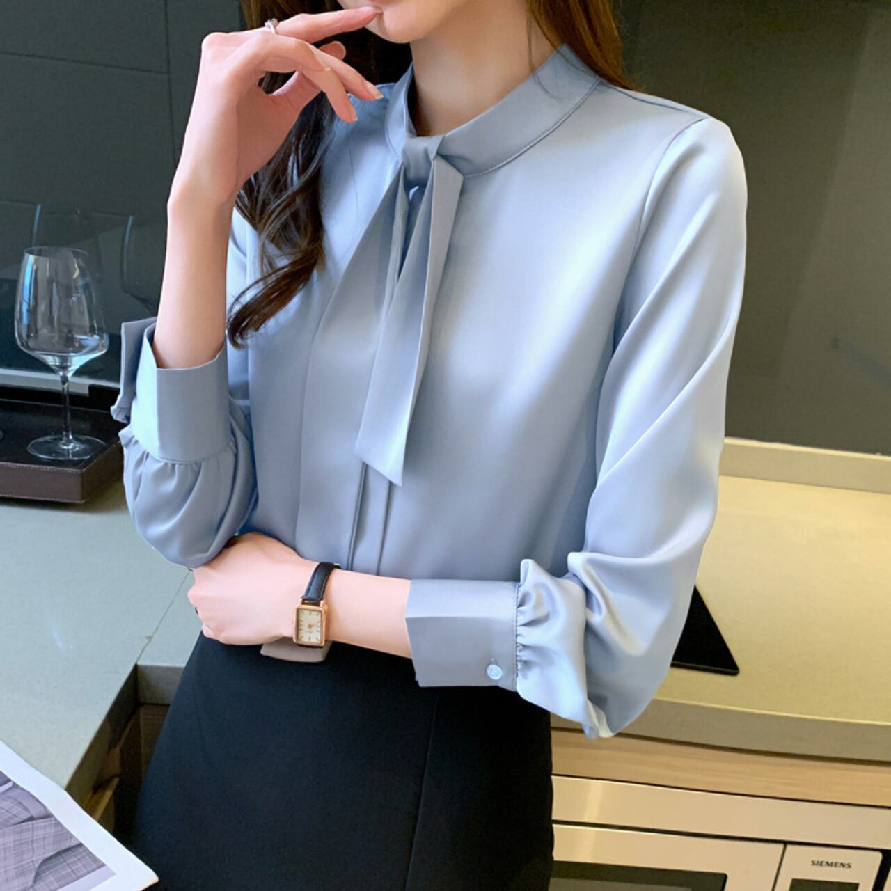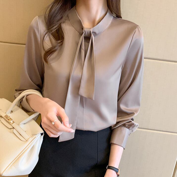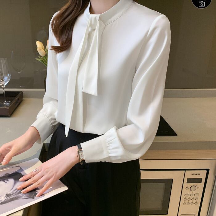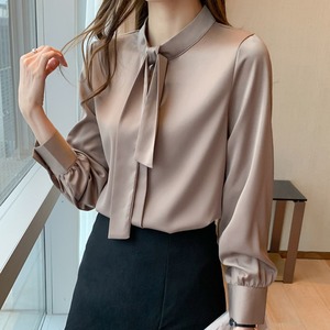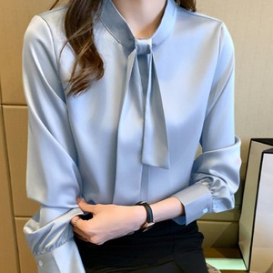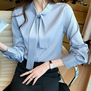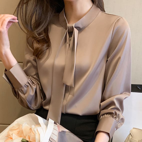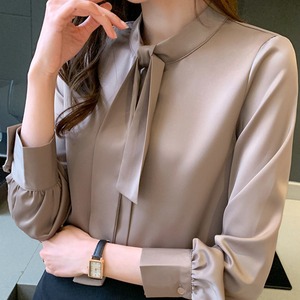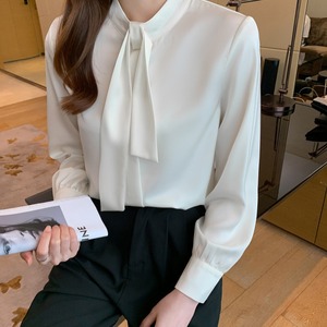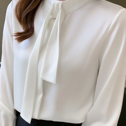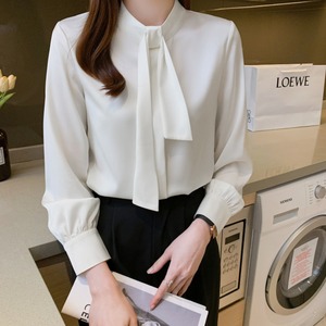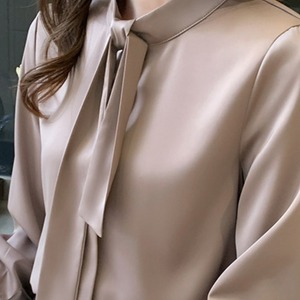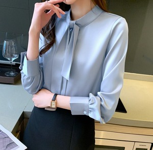 着用するだけでフェミニンな雰囲気が漂うスタンドカラーエレガントチェストタイスリムシャツ。