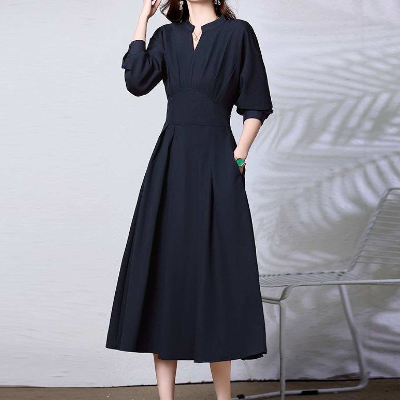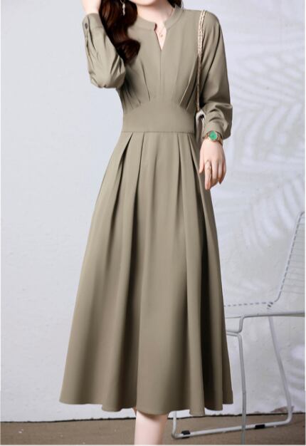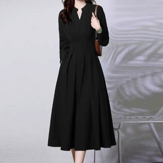 着用するだけでフェミニンな雰囲気が漂うキーネックエレガントウエストフィットスイングロングドレス。