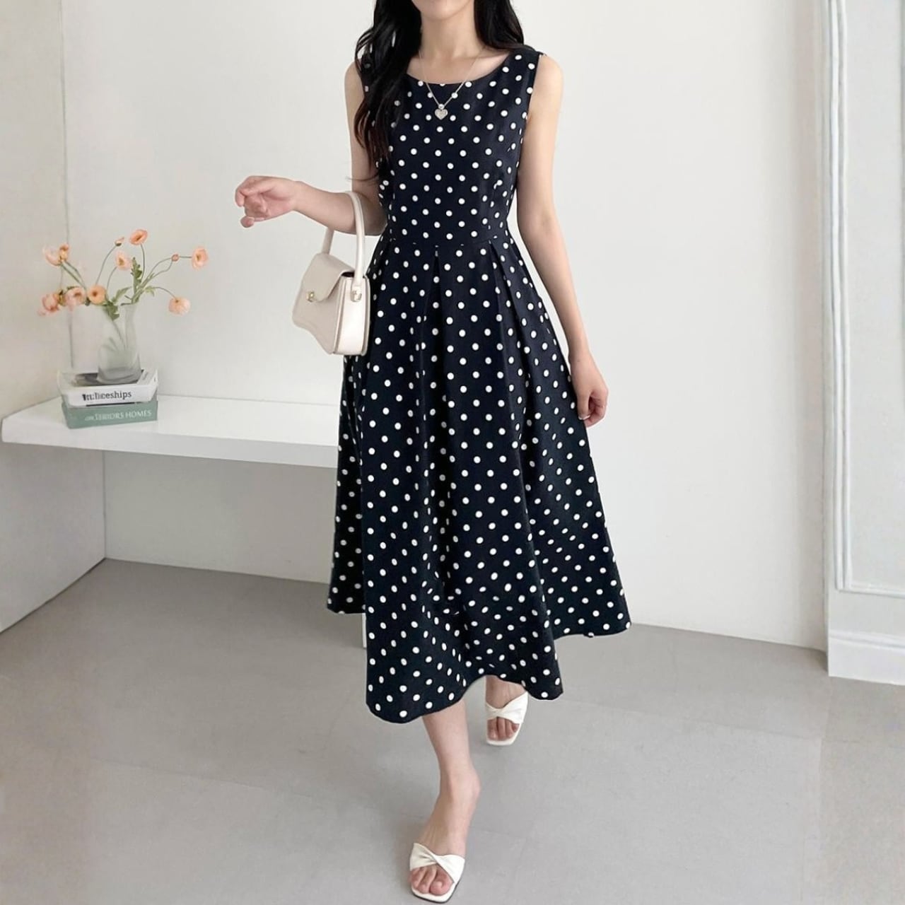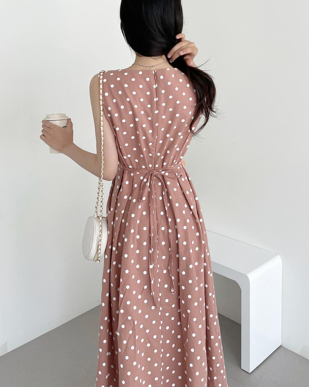 着用するだけで大人可愛い雰囲気が漂うスリーブレスエレガントバックリボンレースアップポルカドットドレス。