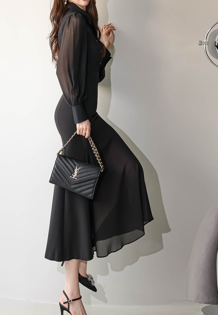 着用するだけでフェミニンな雰囲気が漂うポロカラーエレガントシングルブレストスリムシフォンドレス。