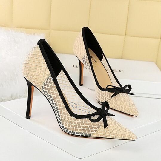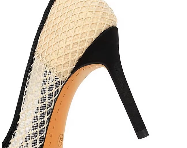足元を美しく演出するリボンステッチエレガントポインテッドトゥメッシュパンプス。