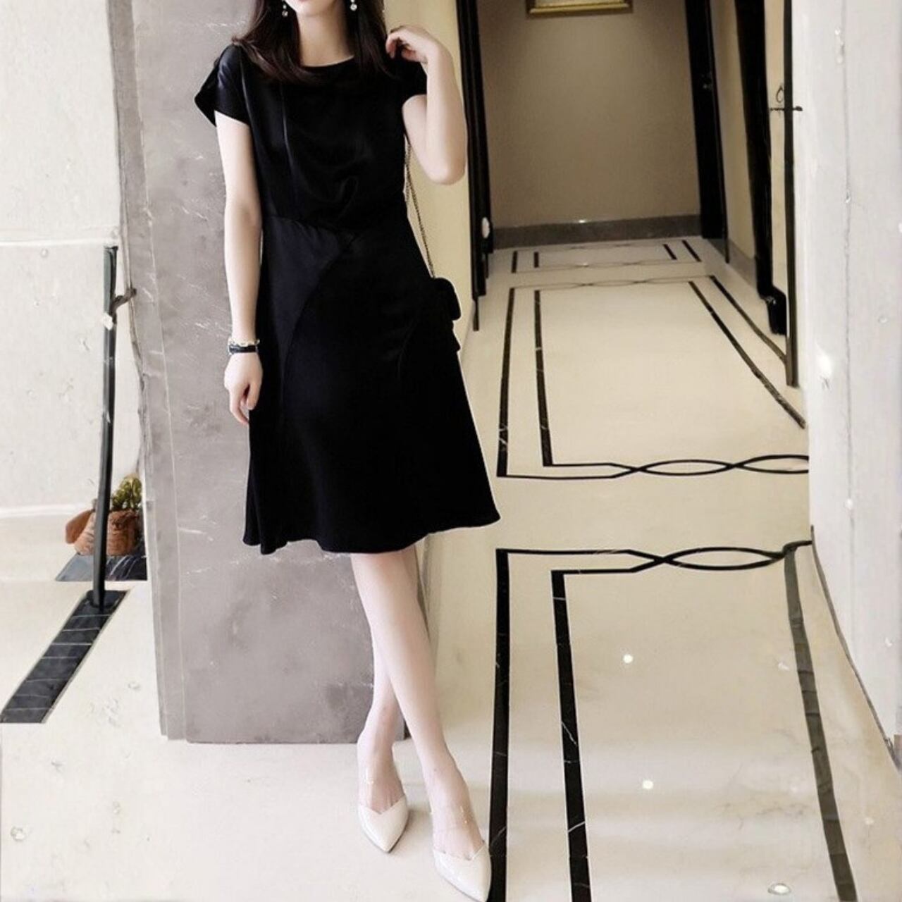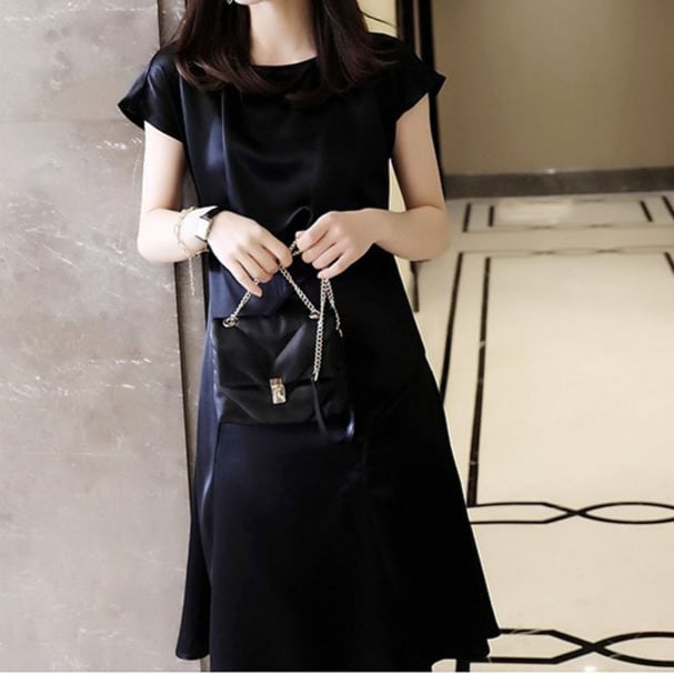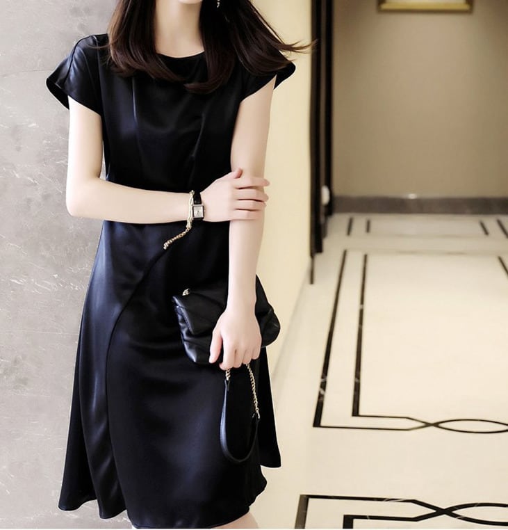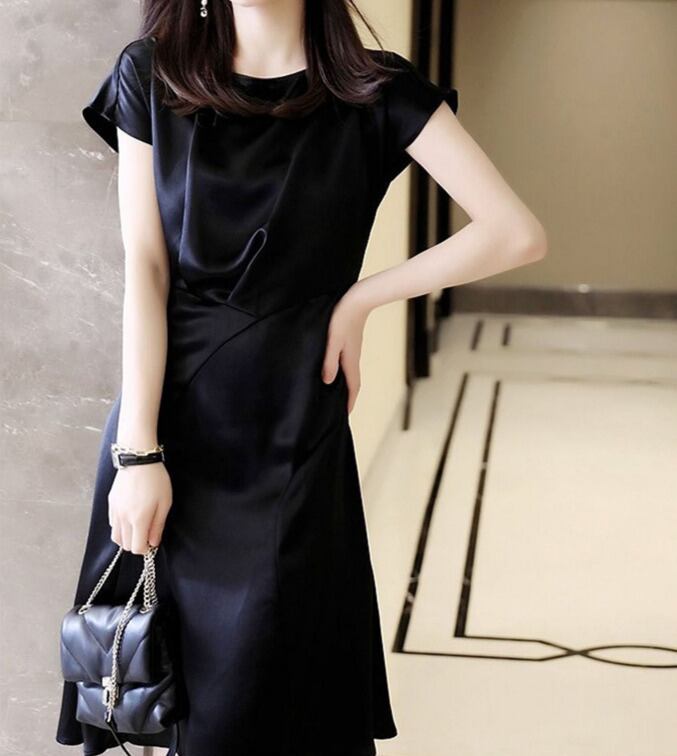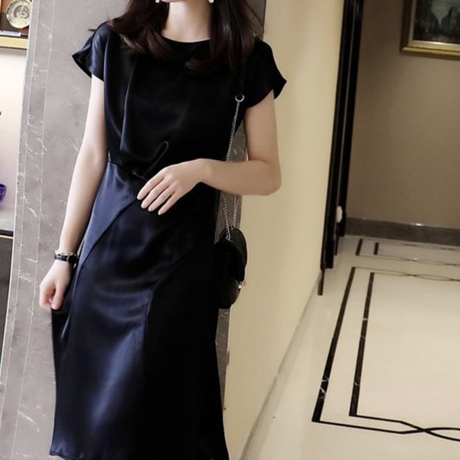 着用するだけでフェミニンな雰囲気が漂うショートスリーブエレガントスリムフィッとサテンミドルドレス。