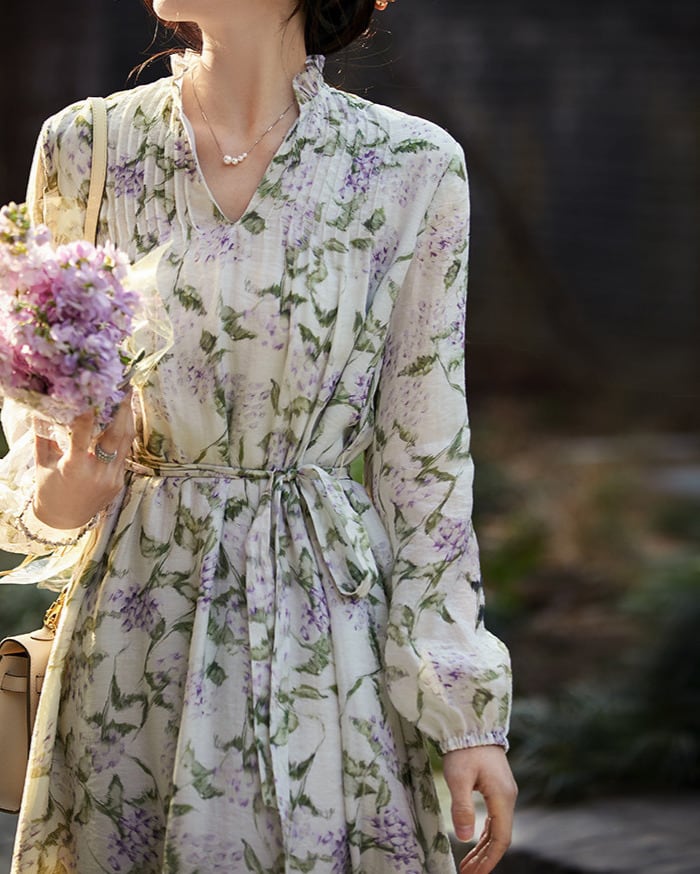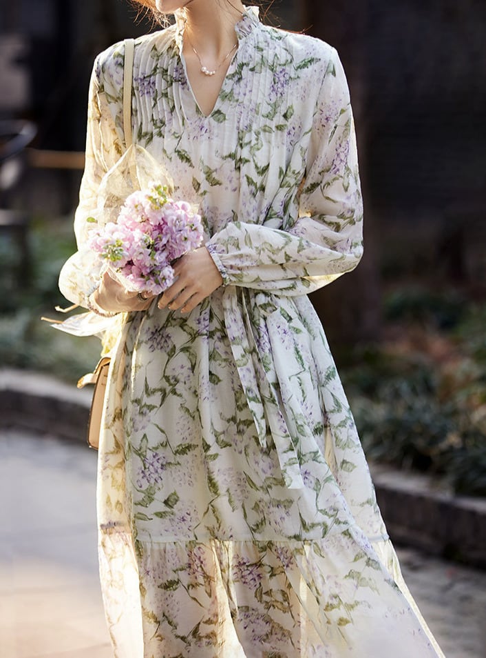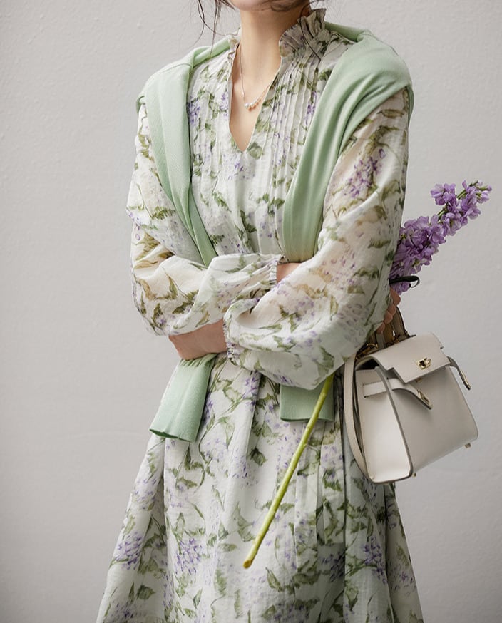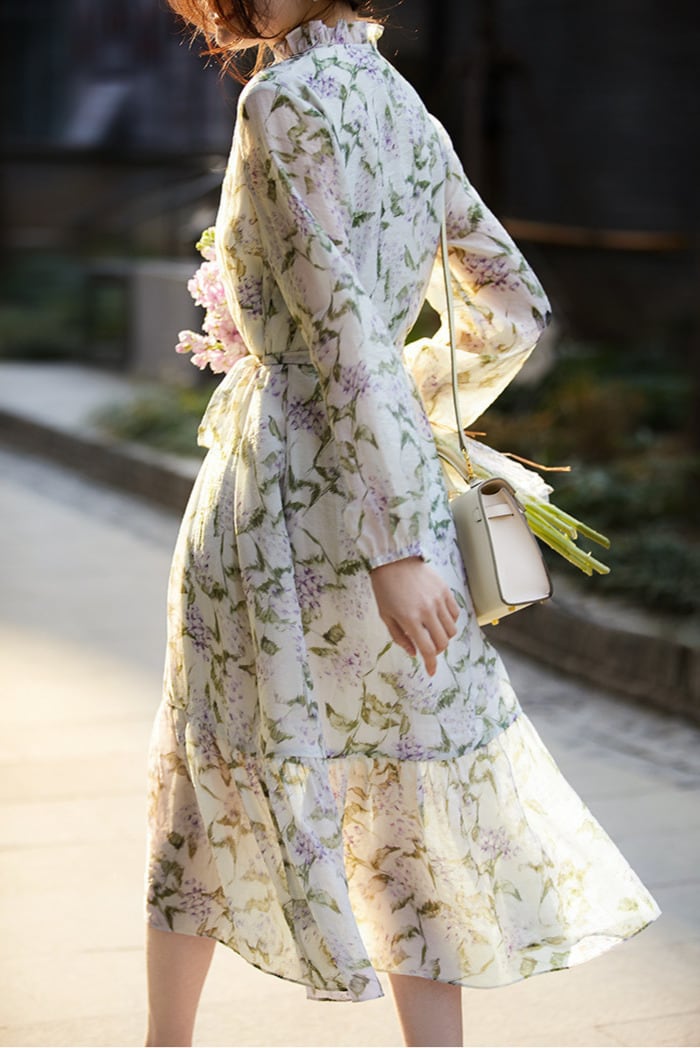 着用するだけで大人可愛い雰囲気が漂うスタンドカラーエレガントストラップフローラルスリムドレス。