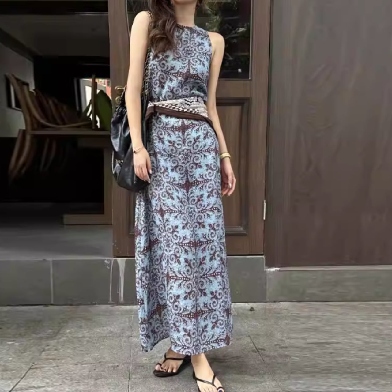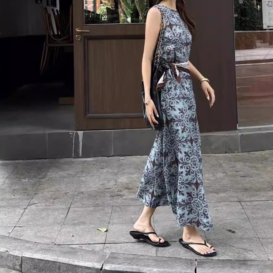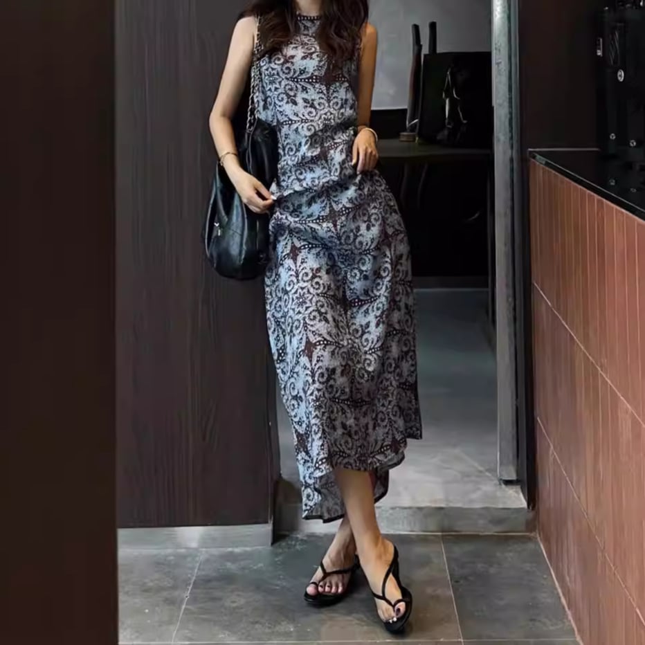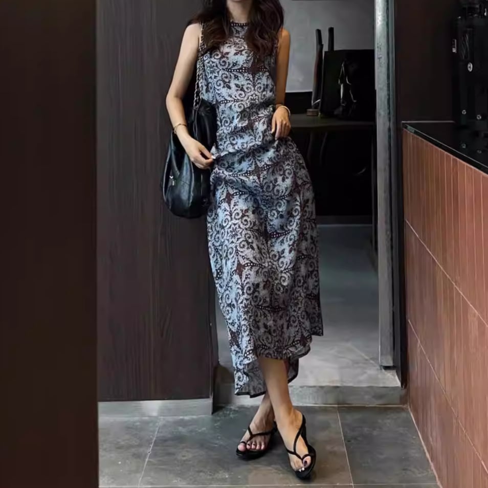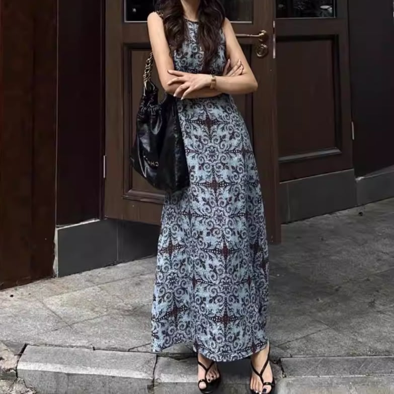 着用するだけでフェミニンな雰囲気が漂うラウンドネックエレガントスリーブレススタイリッシュロングドレス。