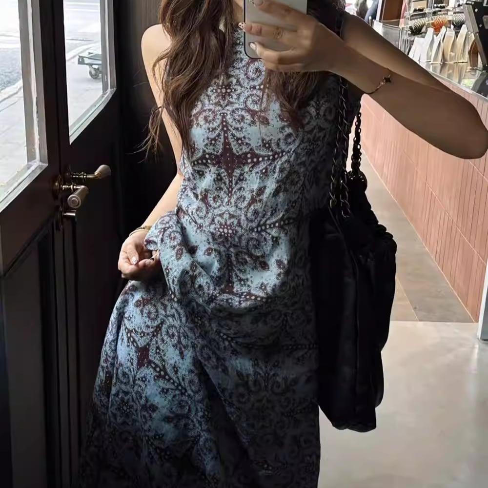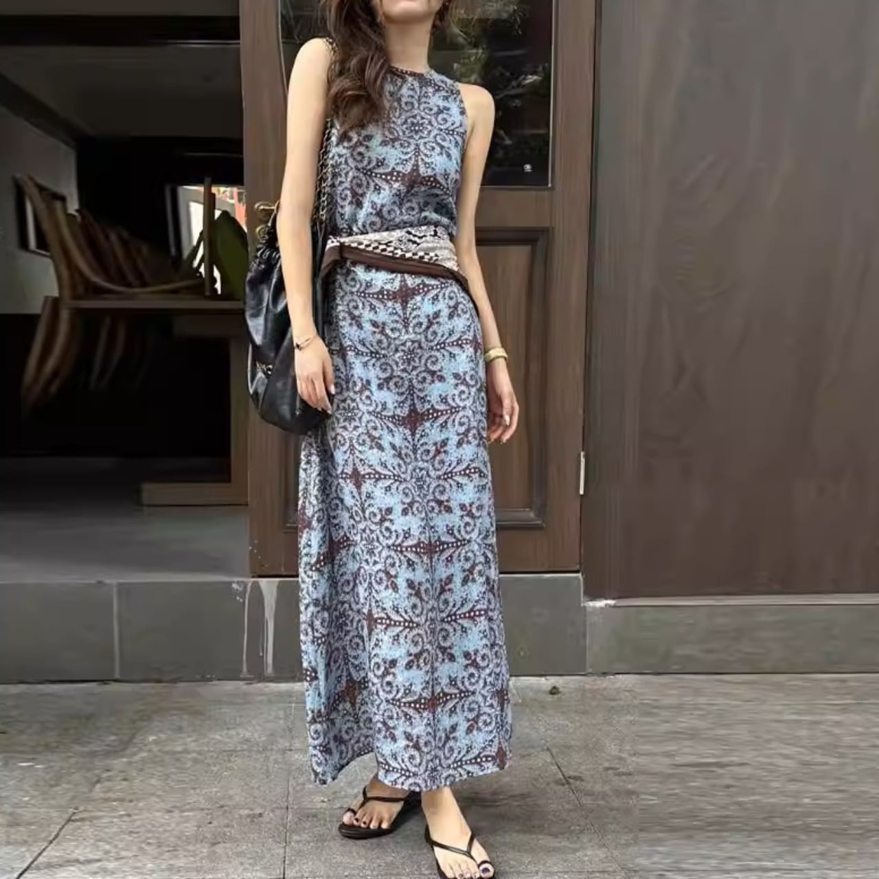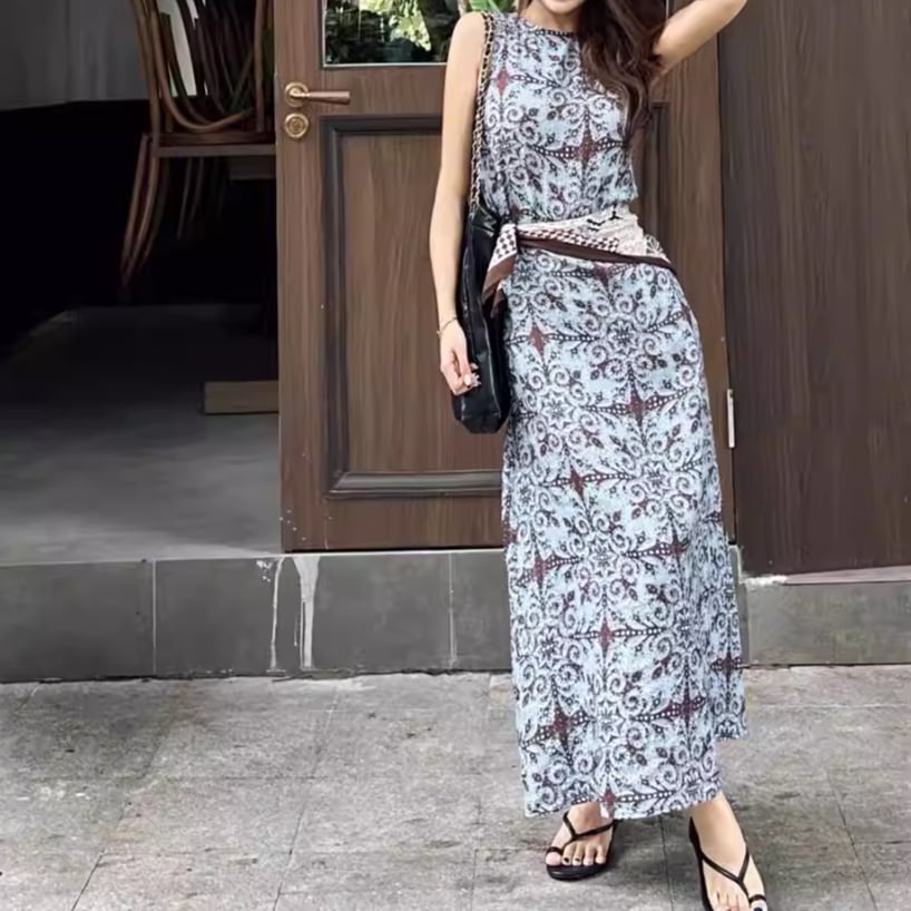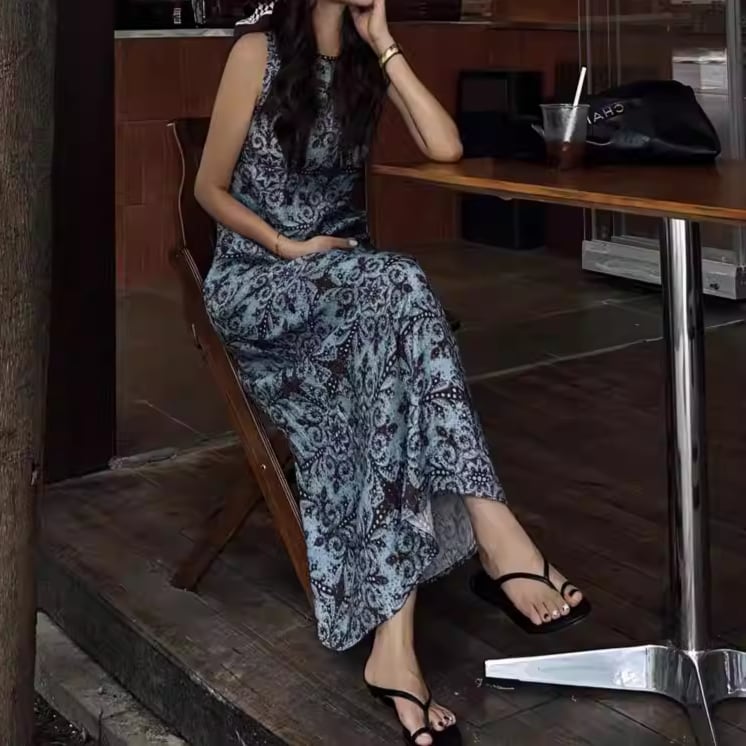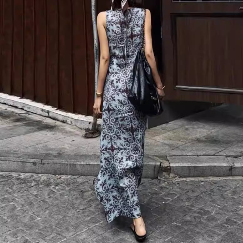 着用するだけでフェミニンな雰囲気が漂うラウンドネックエレガントスリーブレススタイリッシュロングドレス。