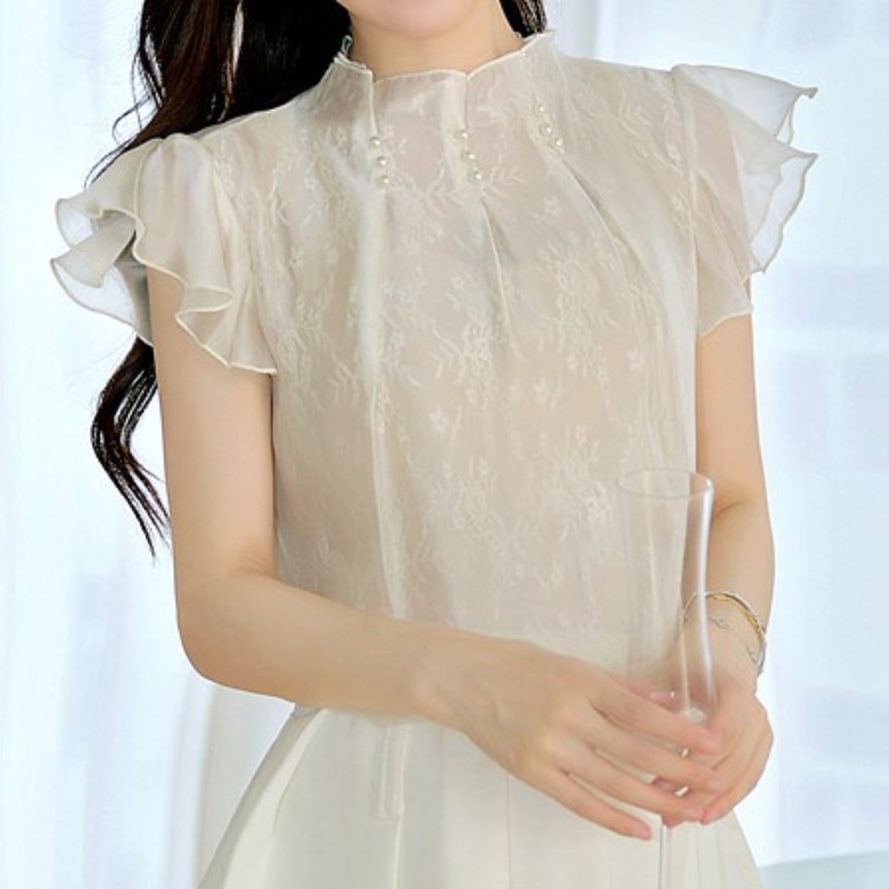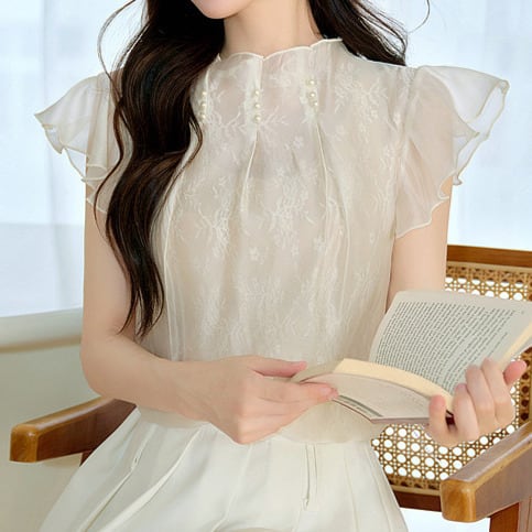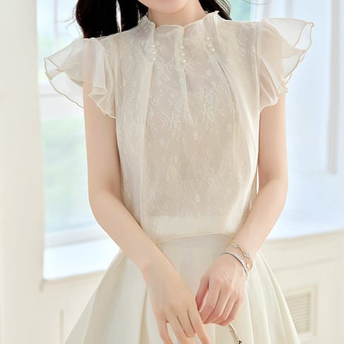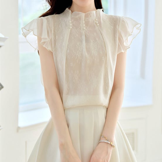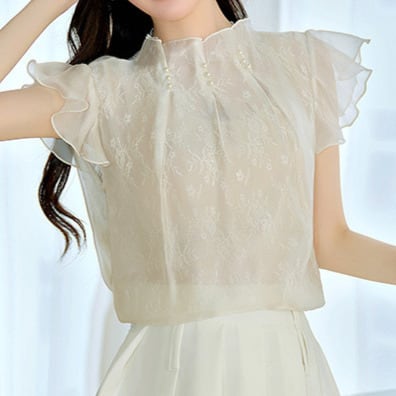 着用するだけでフェミニンな雰囲気が漂うスタンドカラーエレガントラッフルスリーブシフォンシャツ。