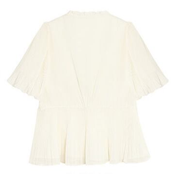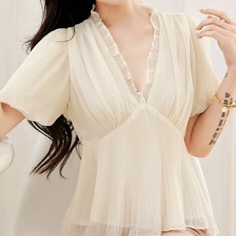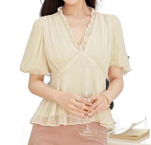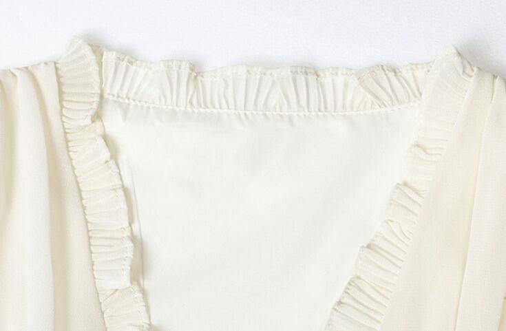 着用するだけでフェミニンな雰囲気が漂うスタンドカラーエレガントラッフルスリーブシフォンシャツ。