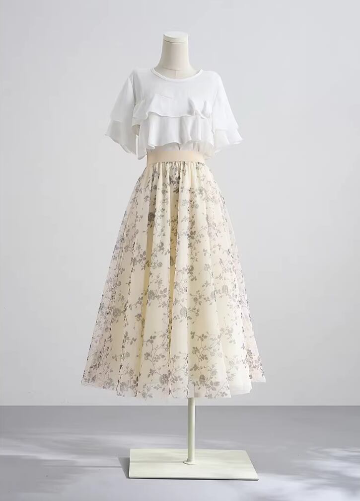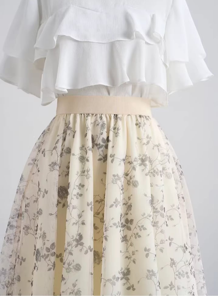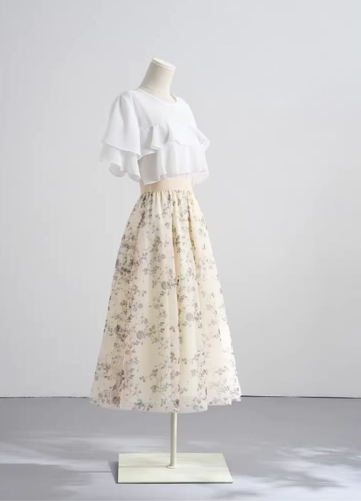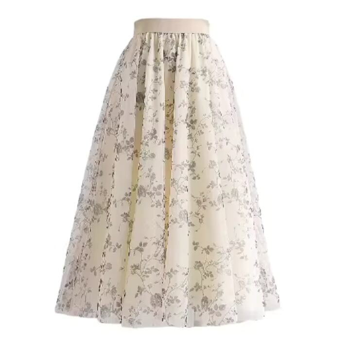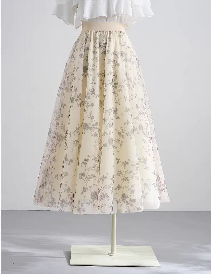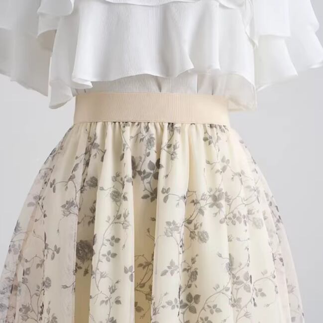 着用するだけで華やかでフェミニンな雰囲気を演出するハイウエストエレガントスモールフラワーメッシュスカート。
