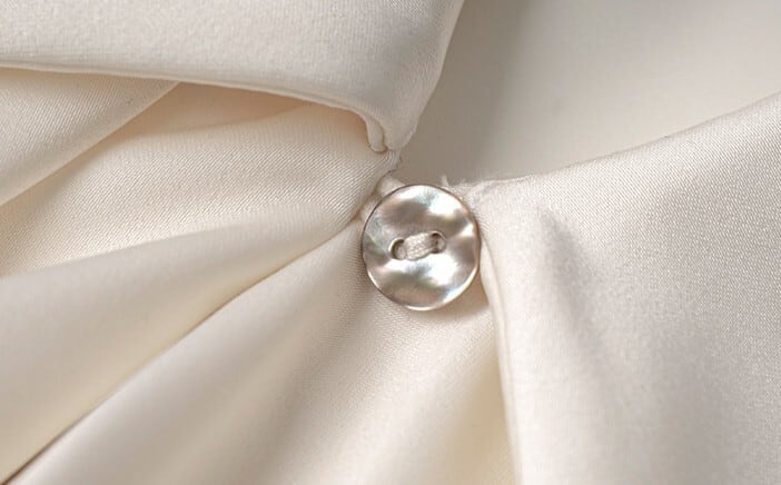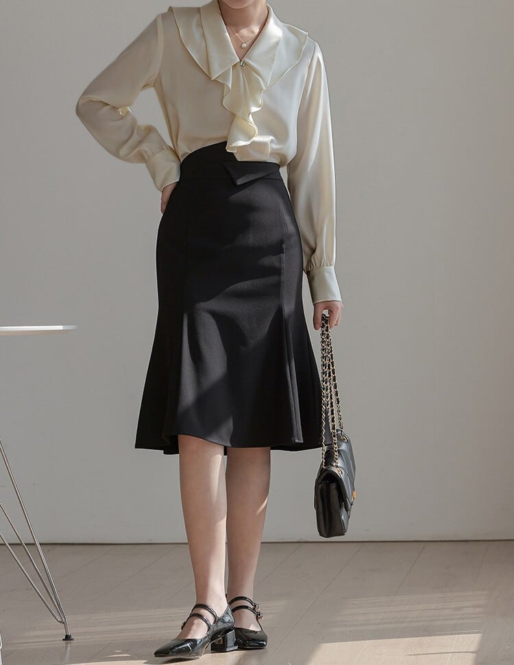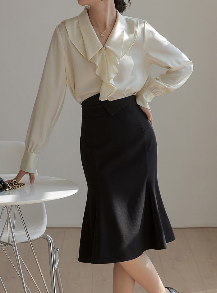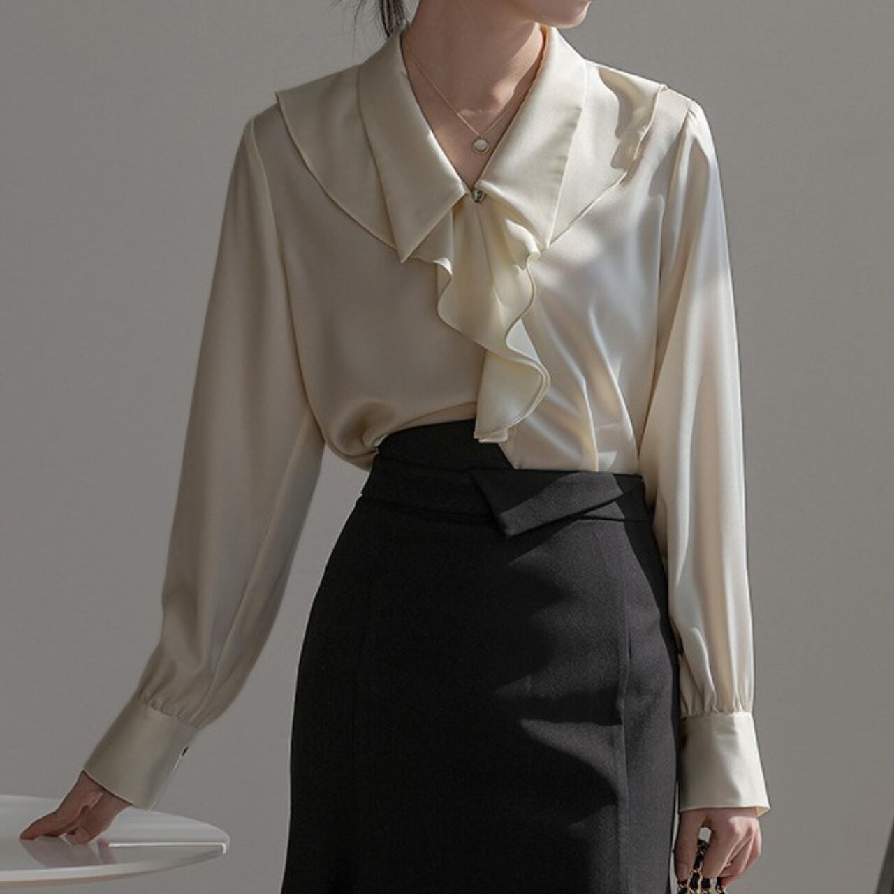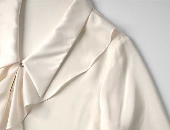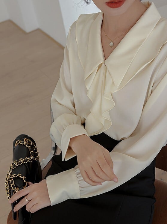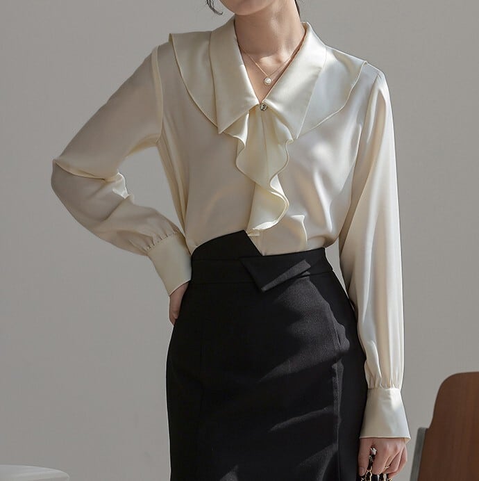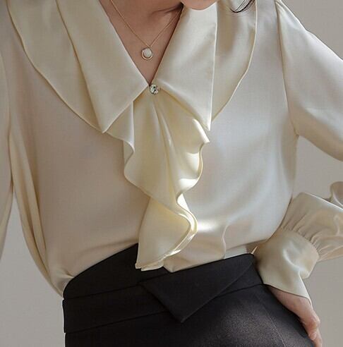 着用するだけでフェミニンな雰囲気が漂うラペルカラーエレガントチェストラッフルスリムシャツ。