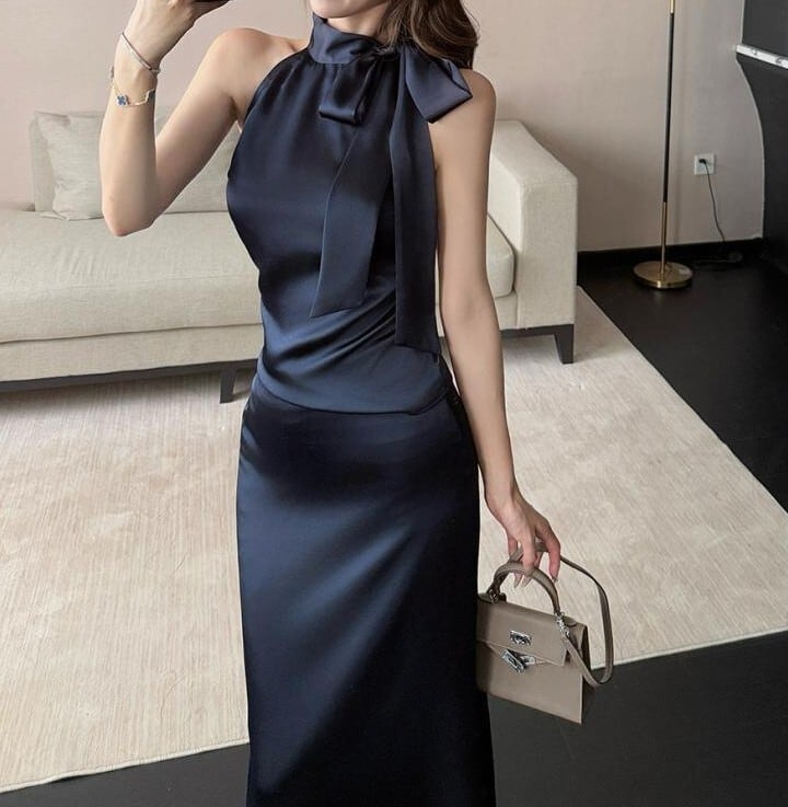 着用するだけでフェミニンな雰囲気が漂うホルターネックエレガントチェストタイスリムロングドレスセットアップ。