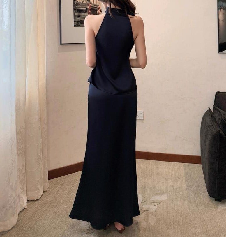 ホルターネックチェストタイスリムシャツとハイウエストスリムロングスカートのセット商品です。