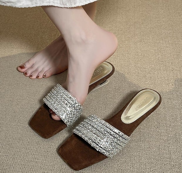 Rhinestone strap elegant square toe low heel sandals ( 2color )