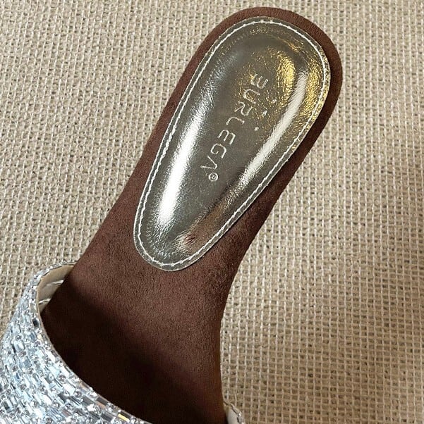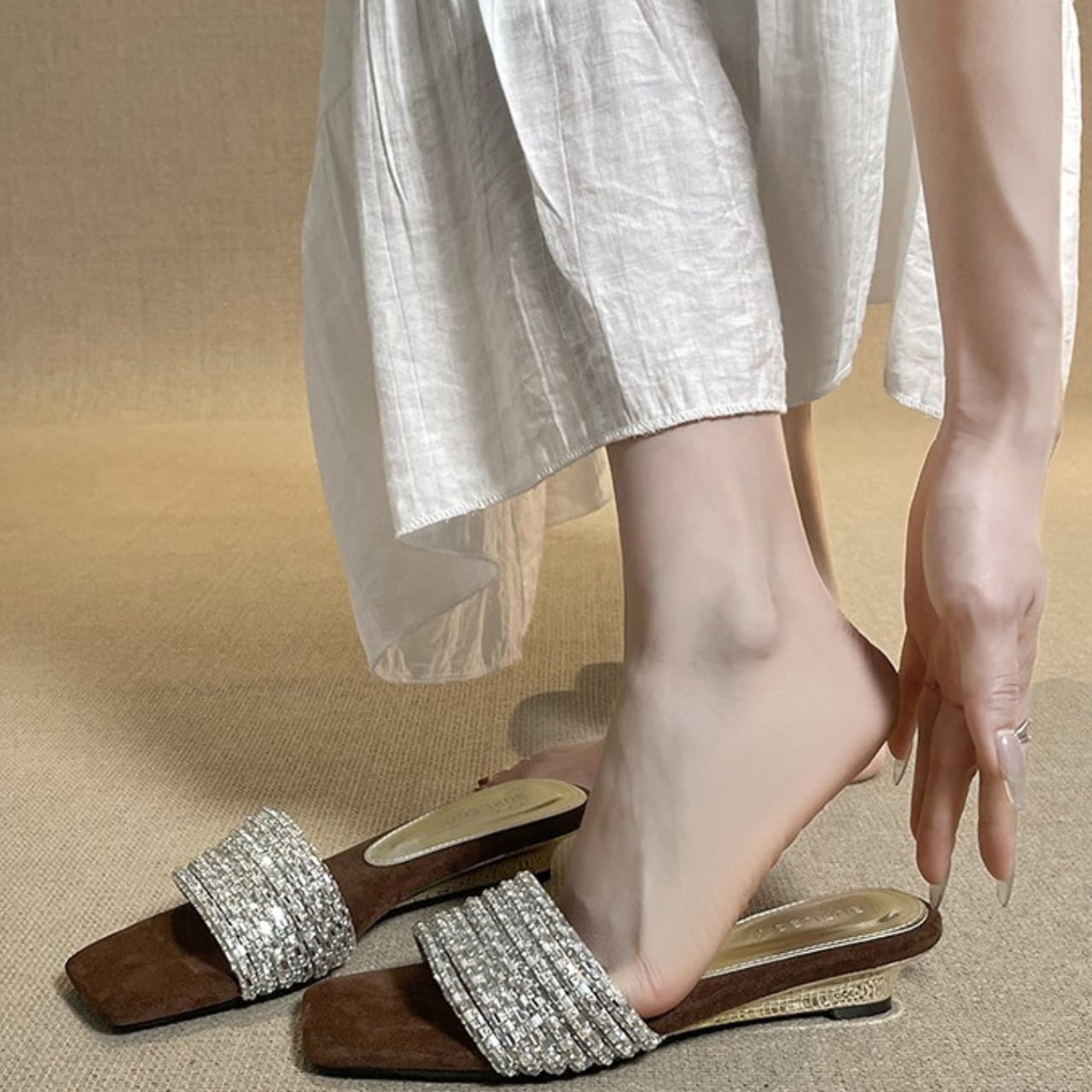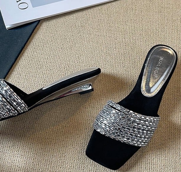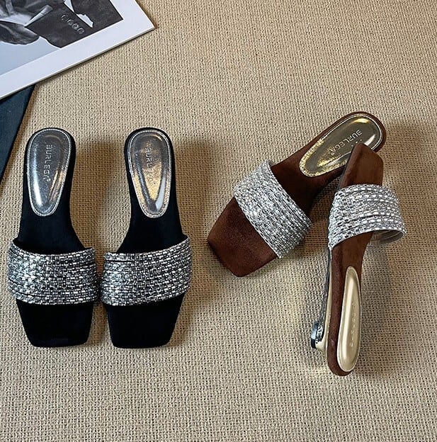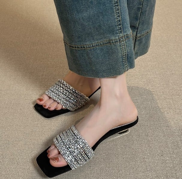 履くだけでエレガントな雰囲気が漂うラインストーンストラップエレガントスクエアトゥローヒールサンダル。