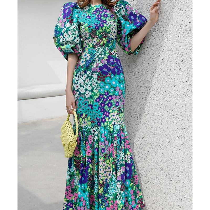 着用するだけでフェミニンな雰囲気が漂うランタンスリーブエレガントフローラルスリムロングマーメイドドレス。
