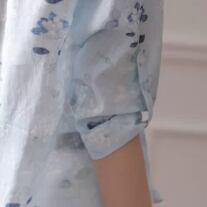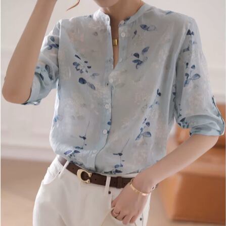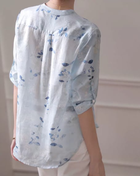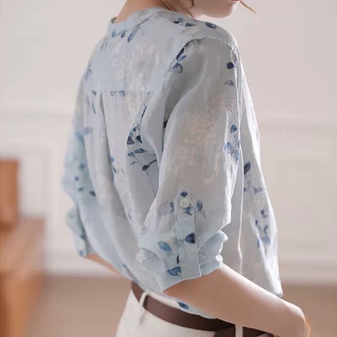 Collarless elegant three quarter sleeve floral slim blouse