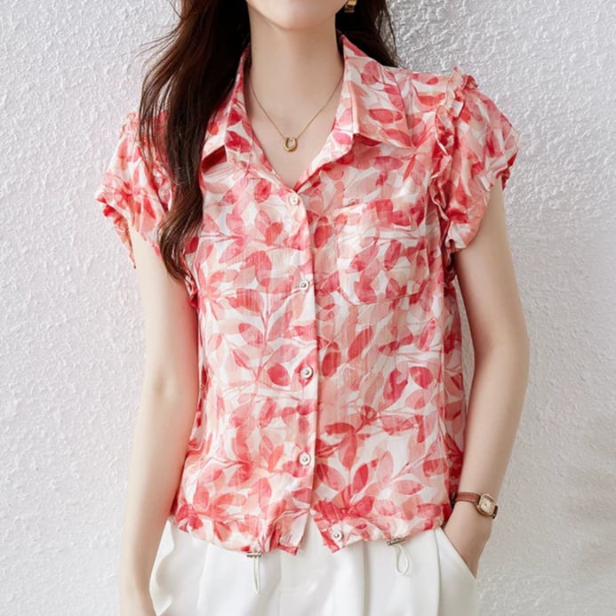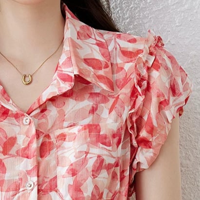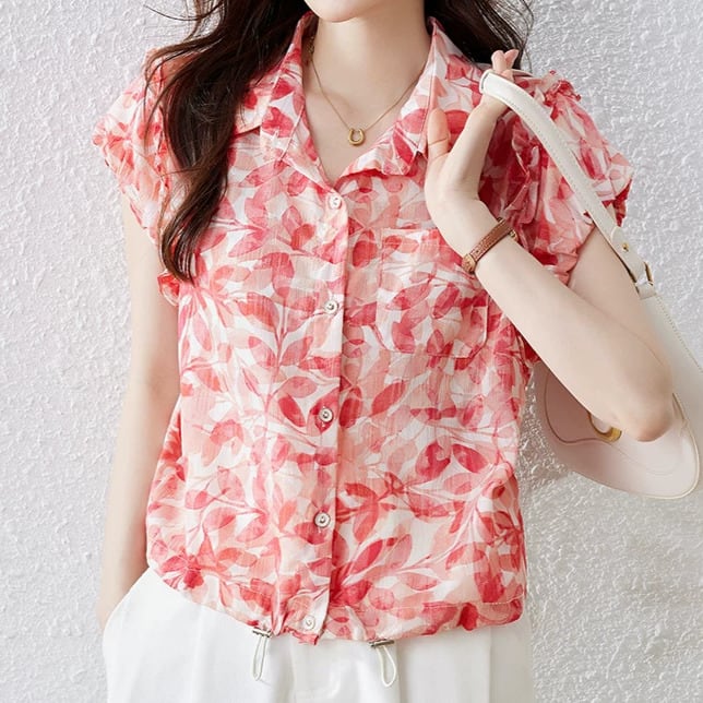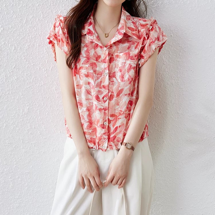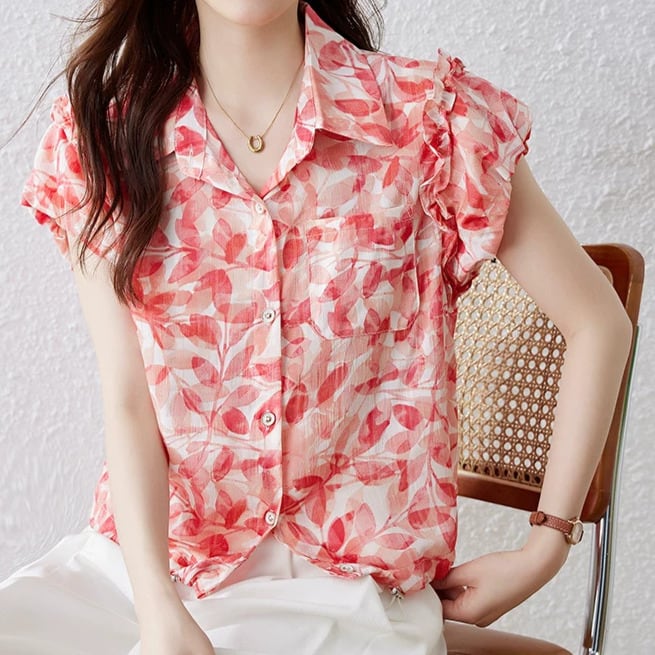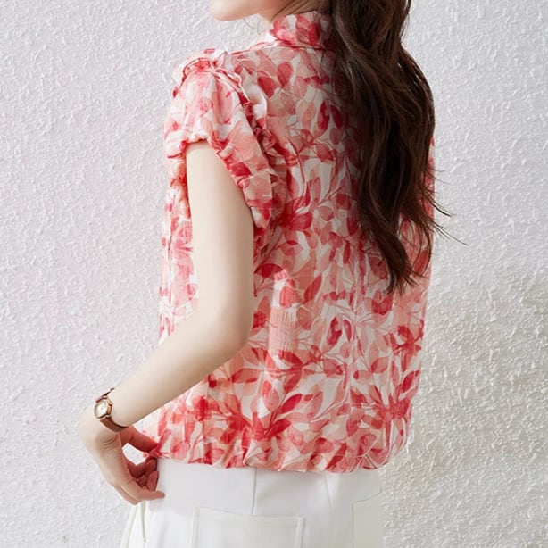 着用するだけで上品で大人可愛い雰囲気が漂うショートスリーブエレガントフローラルシフォンブラウス 。