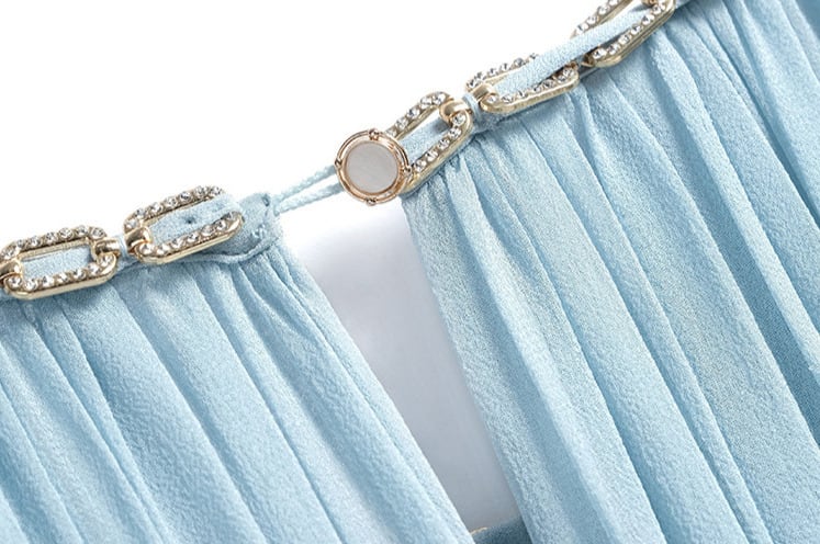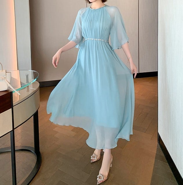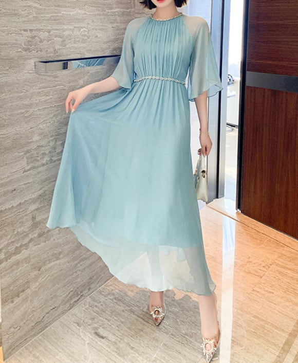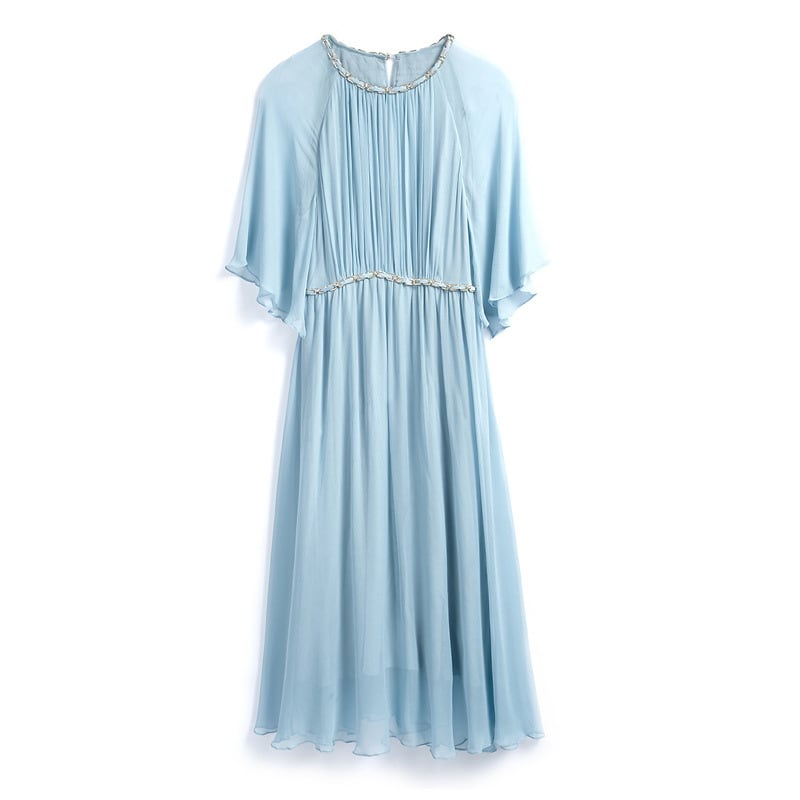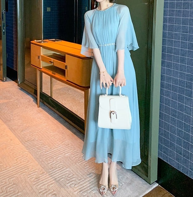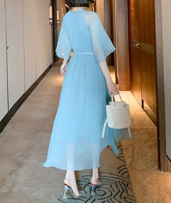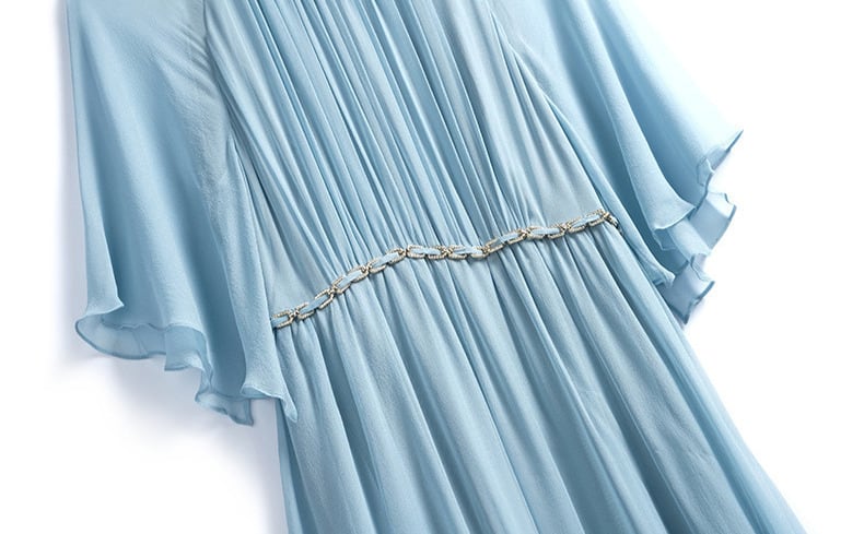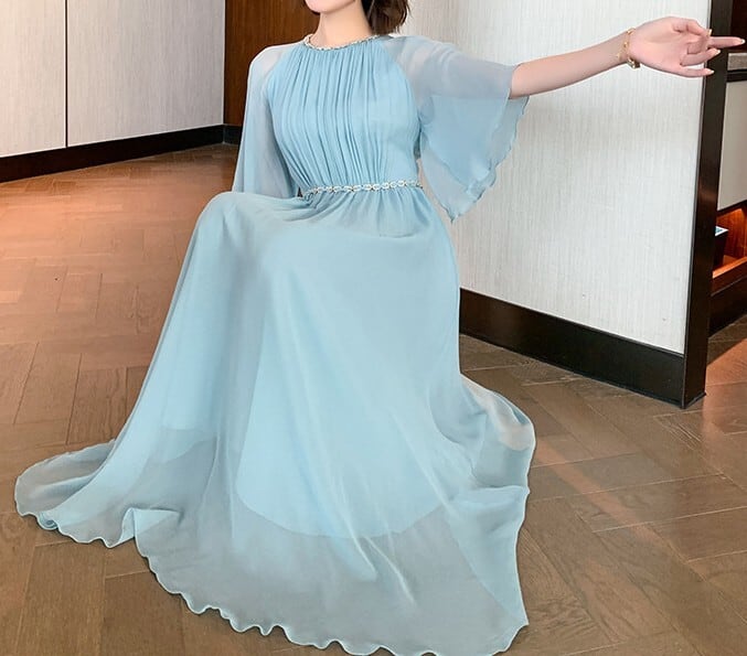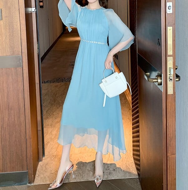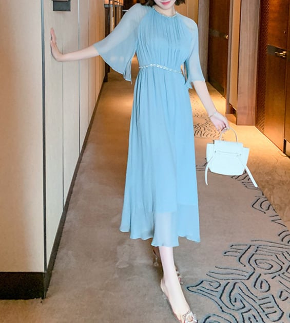 着用するだけでフェミニンな雰囲気が漂うフレアスリーブエレガントチェーンステッチスリムシフォンドレス。