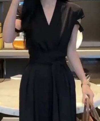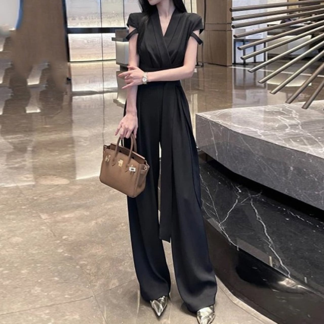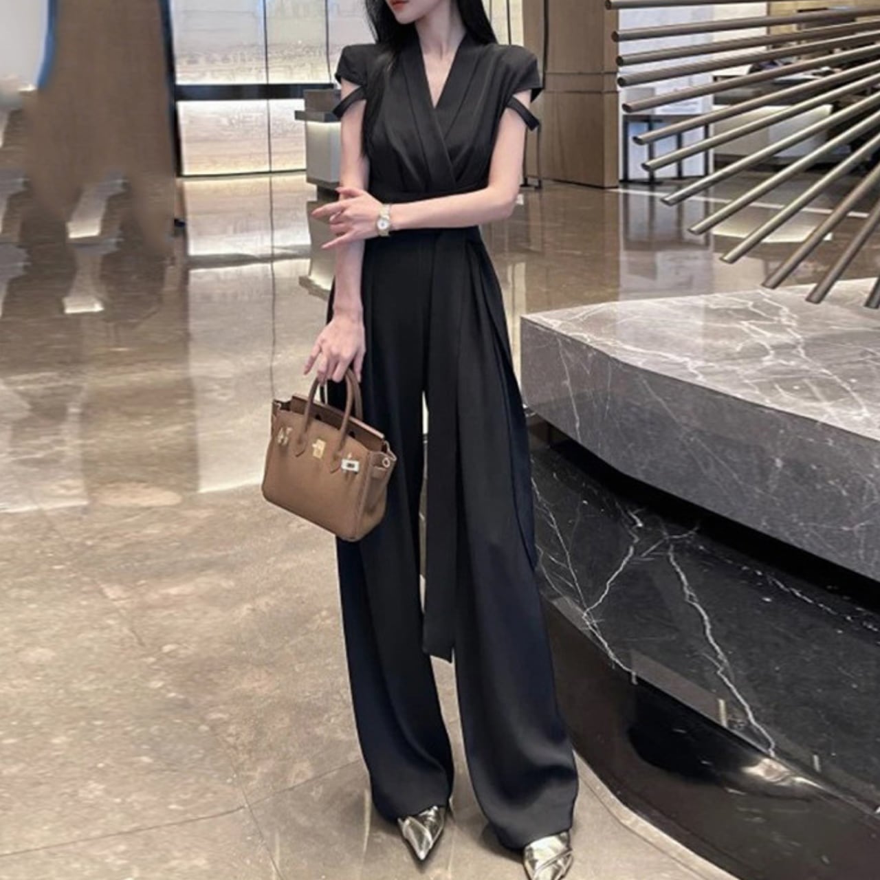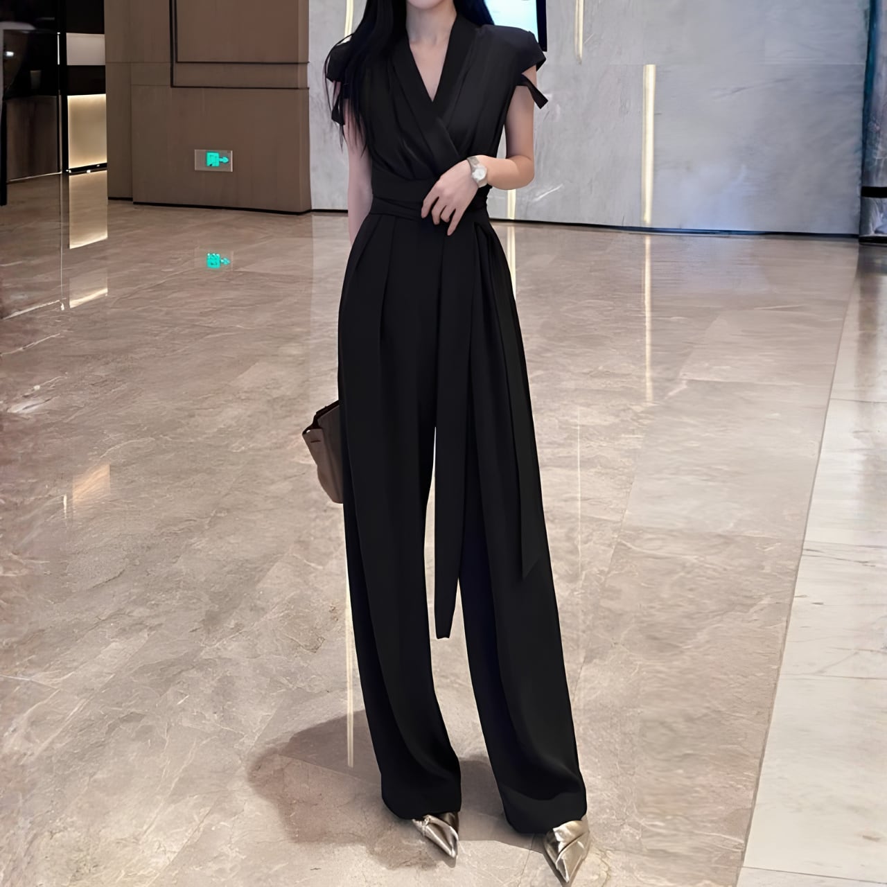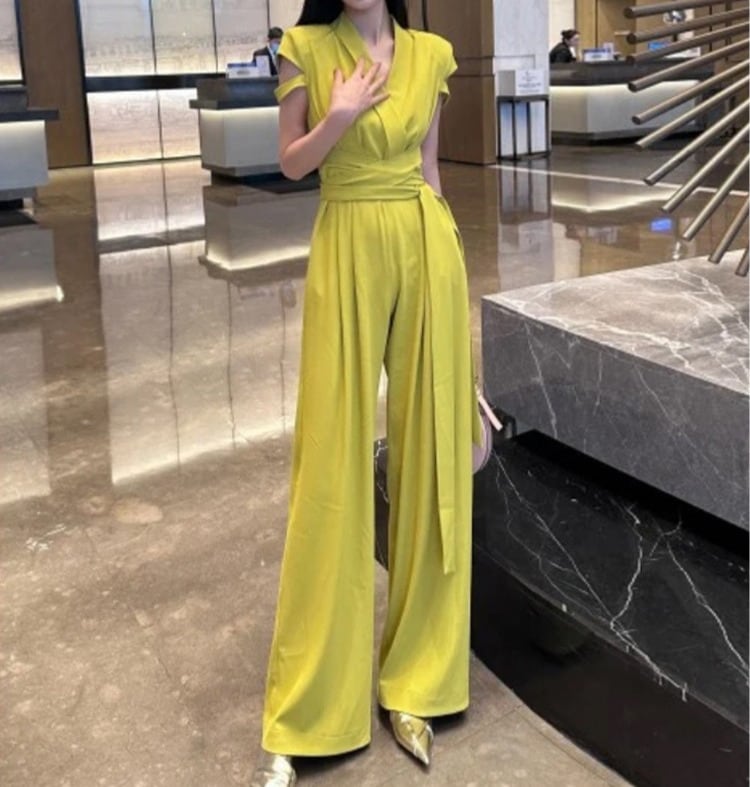 着用するだけでフェミニンな雰囲気が漂うクロスVネックエレガントストラップワイドレッグジャンプスーツ。