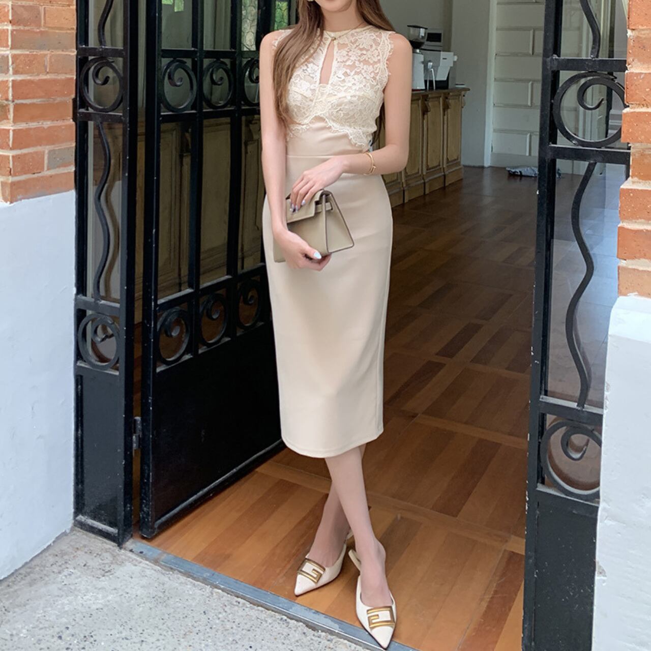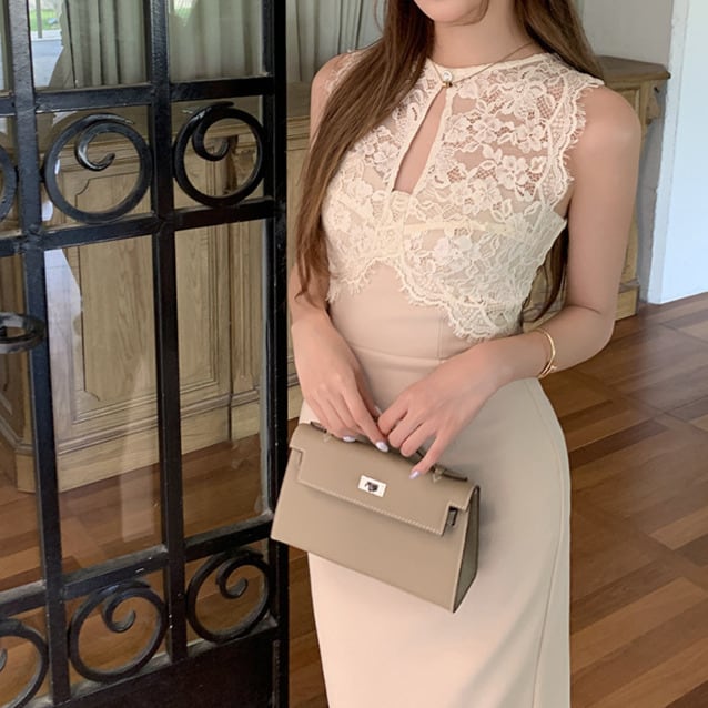 着用するだけでフェミニンな雰囲気が漂うスリーブレスエレガントレースステッチスリムドレス。