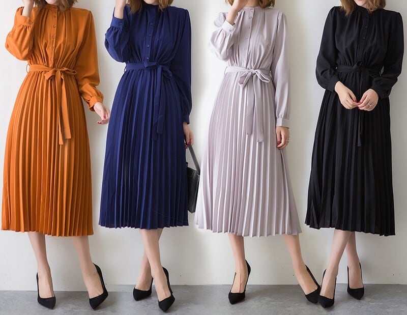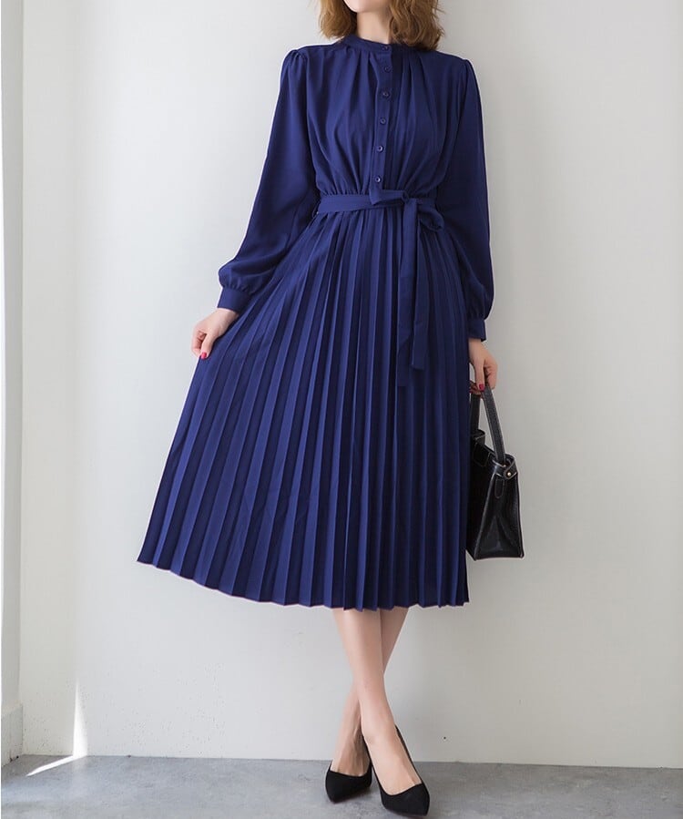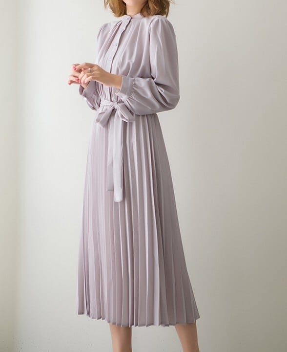 Stand collar elegant chiffon pleats long dress ( 4color )