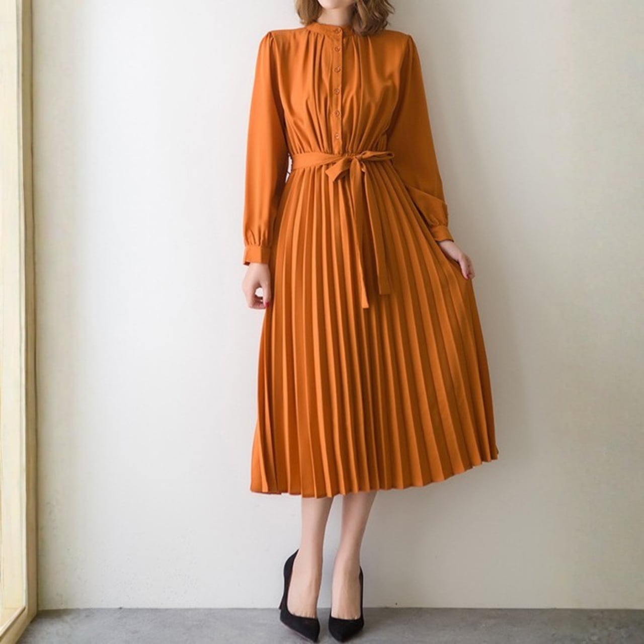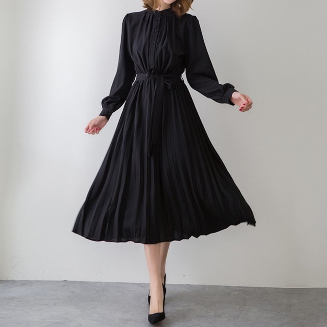 1枚で華やかさと上品さを表現できるスタンドカラーエレガントシフォンプリーツロングドレス。
