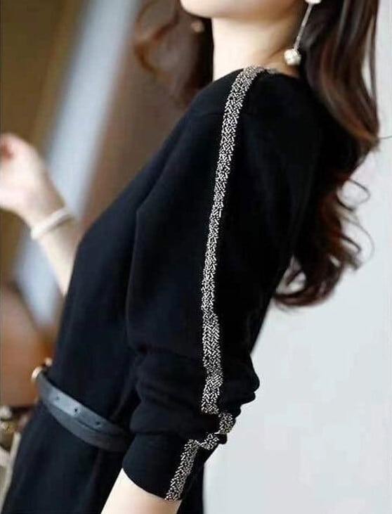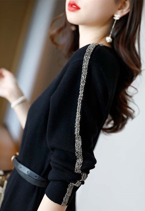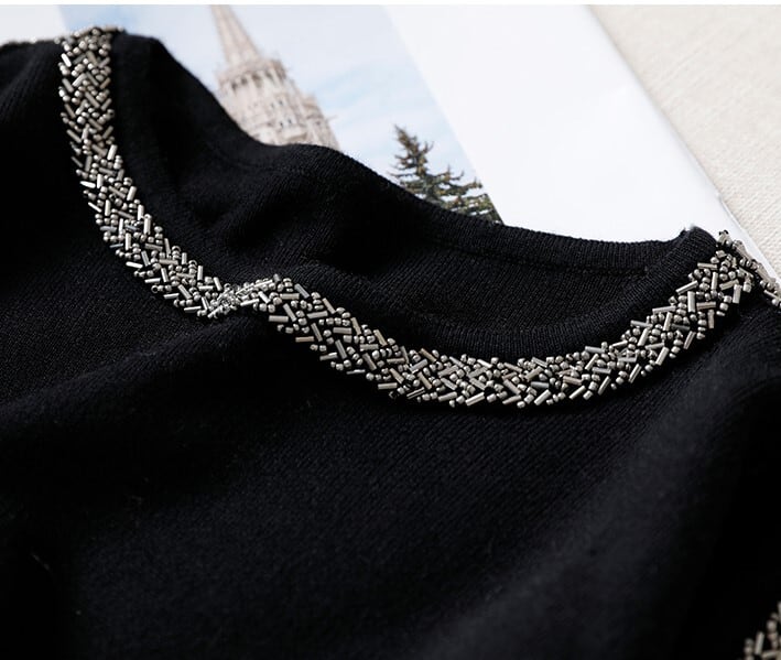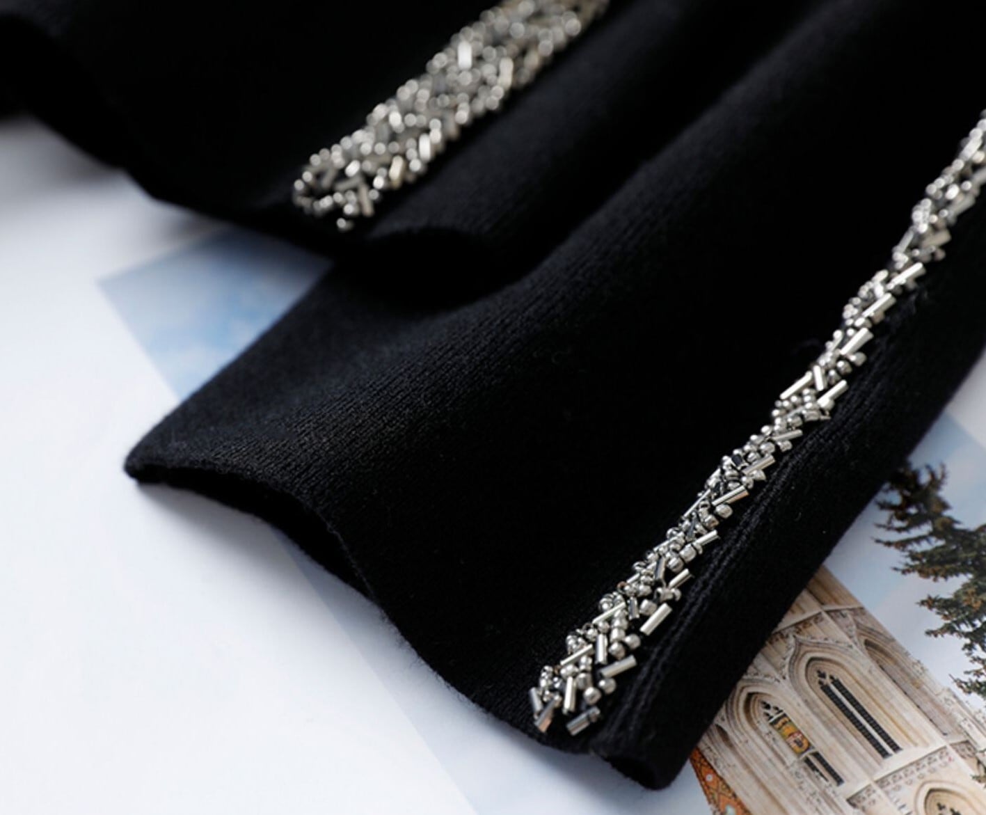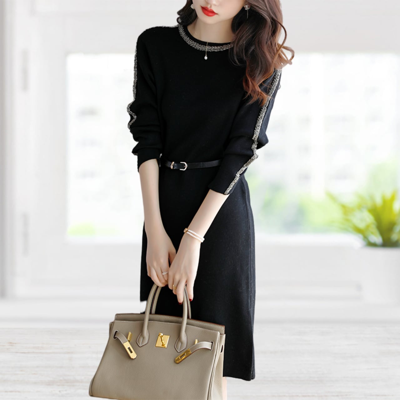 1枚で華やかさと上品さを表現できるエレガントビジューニットドレス。