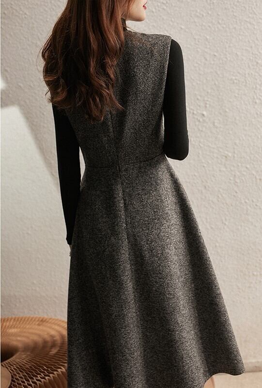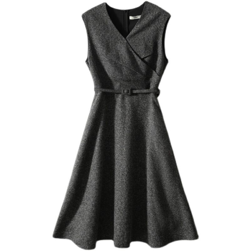 オールシーズンコーデが決まる大人可愛いVネックエレガントスリーブレスミドルドレス。