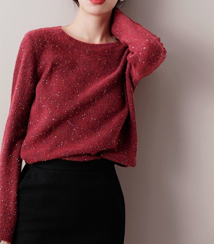 ニット全体に散りばめられた派手すぎないスパンコールがアクセント。