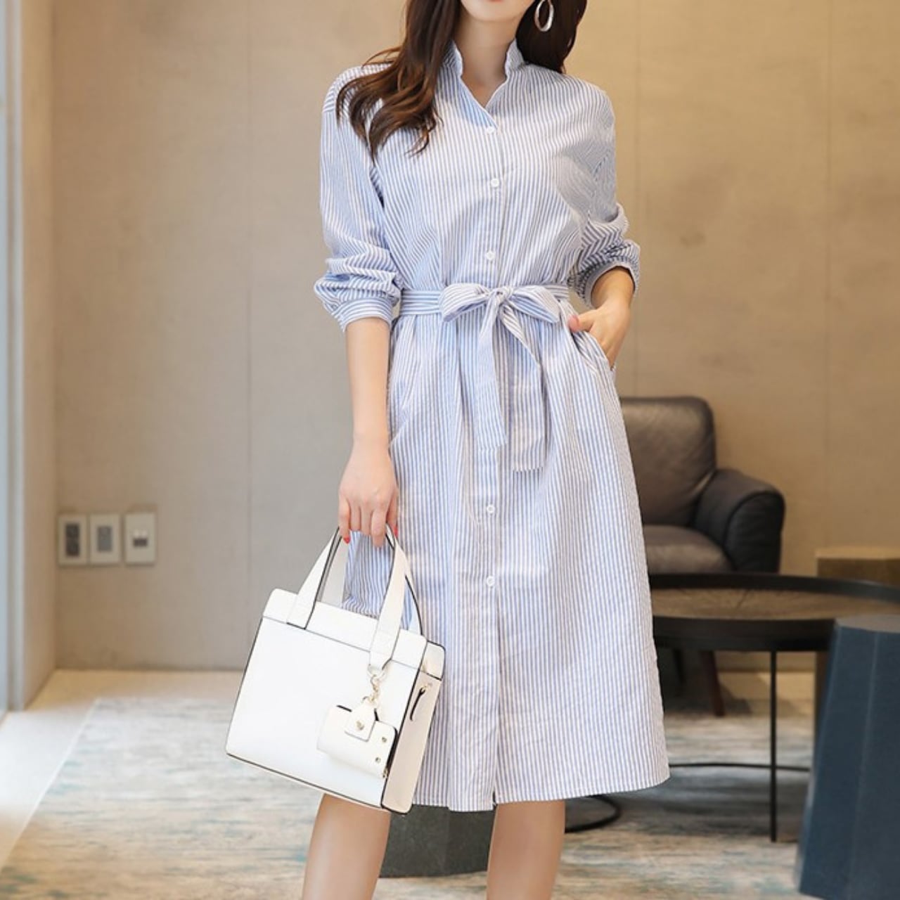 Stand collar elegant stripe shirt dress 2022秋の新作