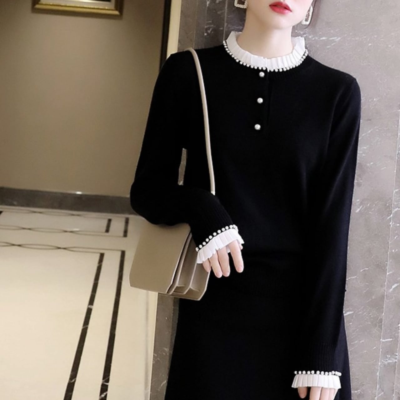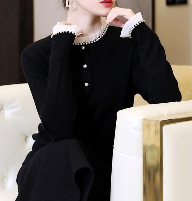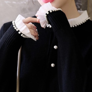 着用するだけで上品さと大人可愛さが漂うスタンドカラーパールニット。